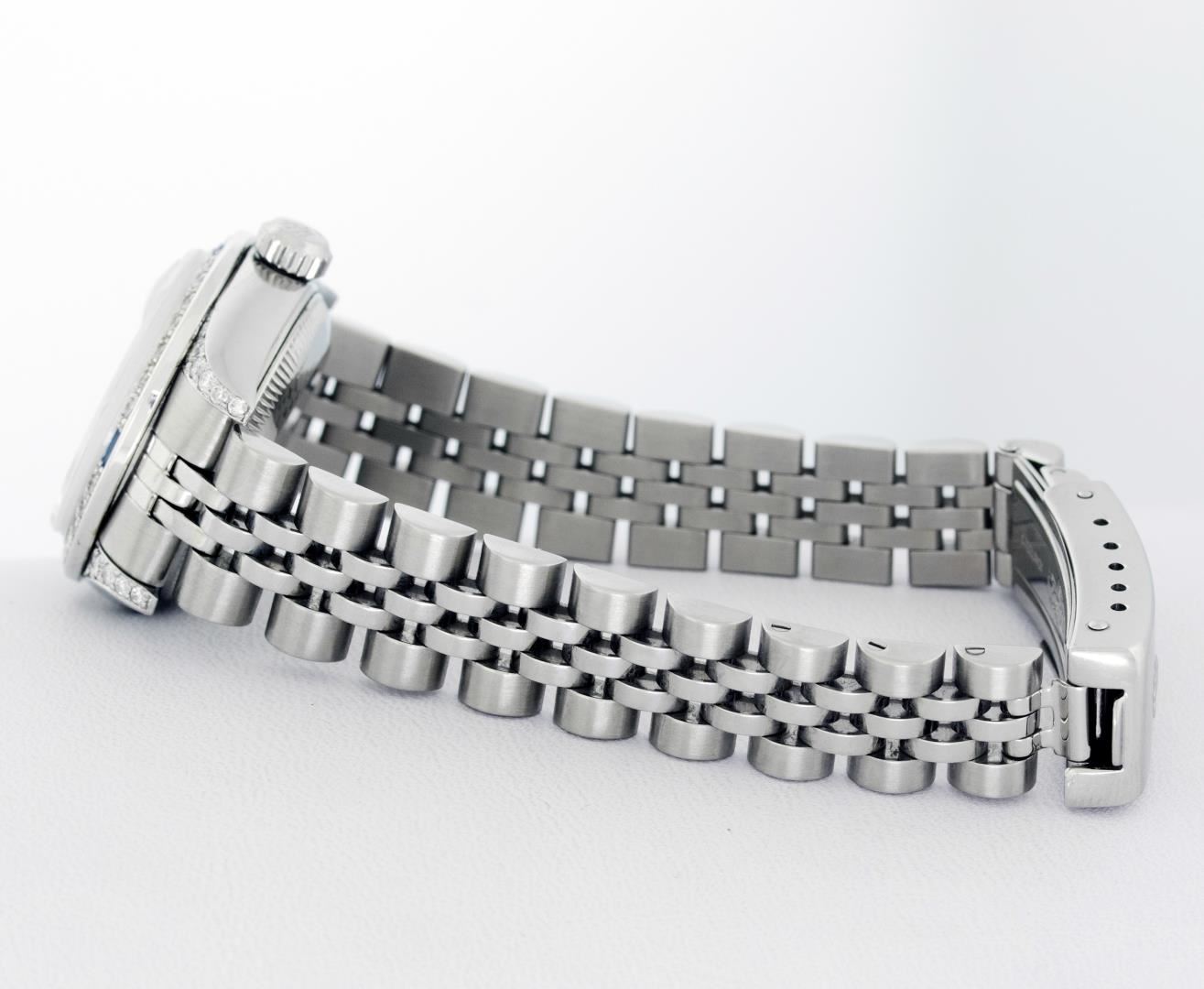 One Ladies Pre Owned Quickset Stainless Steel Rolex Datejust Polished Bright with Satin Finish, Serviced & Electronically Tested, Rolex Stainless Steel Case: 26mm, Custom Diamond Lugs: Added Diamonds On Lugs, Diamond Count: 24 Diamonds On Bezel, Color: G To H, Clarity: SI-VS. Rolex Stainless Steel Crown, Custom Bezel: New 18K White Gold Beadset And Sapphire Bezel, Stone Count: 28 Diamonds + 4 Sapphires, Diamond Color: G To H, Clarity: SI-VS. Custom Crystal: New Sapphire With Magnified Date Window. Custom Hands: New Lumi Hands. Rolex Movement: Quickset Automatic Winding Movement 2230. Rolex Dial: Silver Index With Dash Track And Lumi Dots. Date Window: 3 O'Clock Position Date Display, Model: Sapphire Quickset Datejust. Condition: G-6 Extra Fine. Rolex Bracelet: Stainless Steel Jubilee Band. Bright Polish & Satin Finish. 6.0 Inch Length, Adjustable. Standard Clasp, With Rolex Logo. This Watch Has Been Serviced Time Tested And Is In Excellent Condition It Is Free Of All Scratches And Dents.