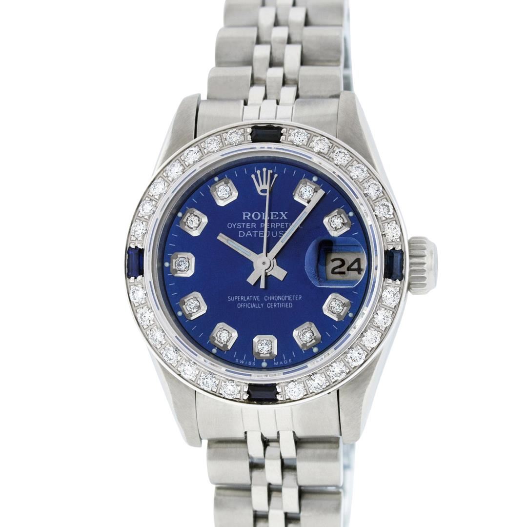One Ladies Pre Owned Quickset Stainless Steel Rolex Datejust Polished Bright with Satin Finish, Serviced And Electronically Tested, Stainless Steel Case: 26mm, Stainless Steel Crown, Custom Bezel: New 18K White Gold Sapphire Beadset Diamond Bezel, Diamond + Gem Count: 28 Diamonds + 4 Sapphires. Custom Crystal: New Sapphire With Date Window. Custom Hands: New Luminescent Hands. Rolex Movement: Automatic Winding Movemen 2135t. Custom Dial: Custom Blue Dial With Added Diamond Hour Markers, 10 Diamond On Dial. Date Window: 3 O'Clock Position Date Display, Model: Quickset Datejust. Condition: G-6 Extra Fine. Rolex Bracelet: Stainless Steel Jubilee Band. Bright Polish And Satin Finish. 6.0 Inch Length, Adjustable. Standard Clasp, With Rolex Logo. This Watch Has Been Serviced Time Tested And Is In Excellent Condition It Is Free Of All Scratches And Dents.