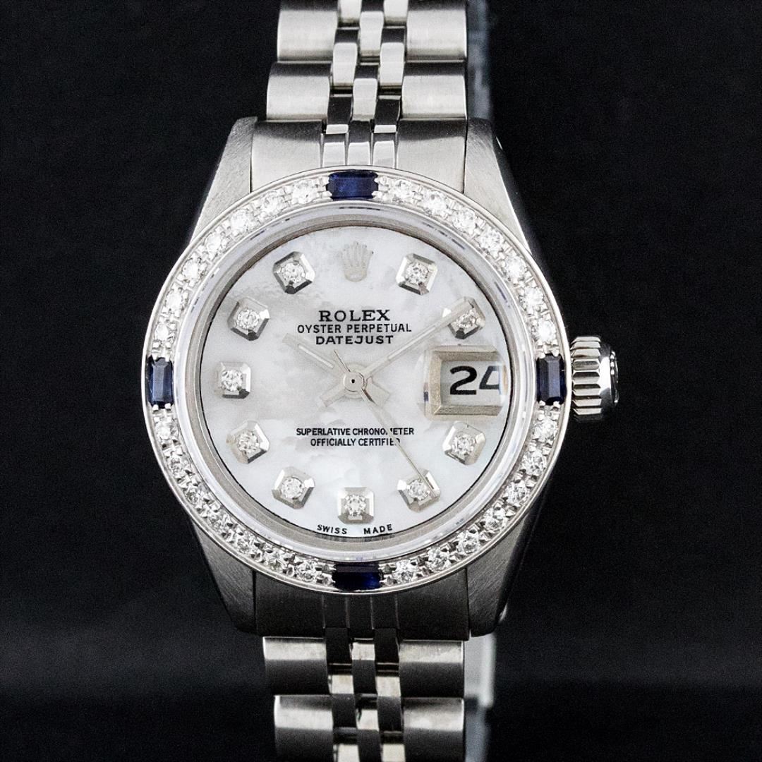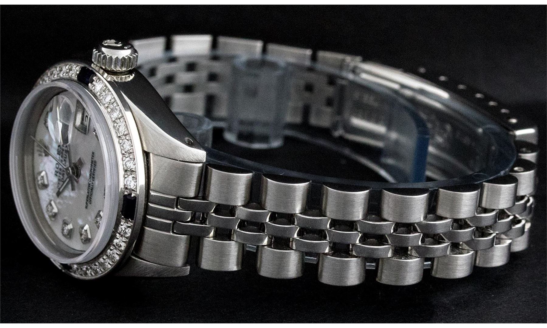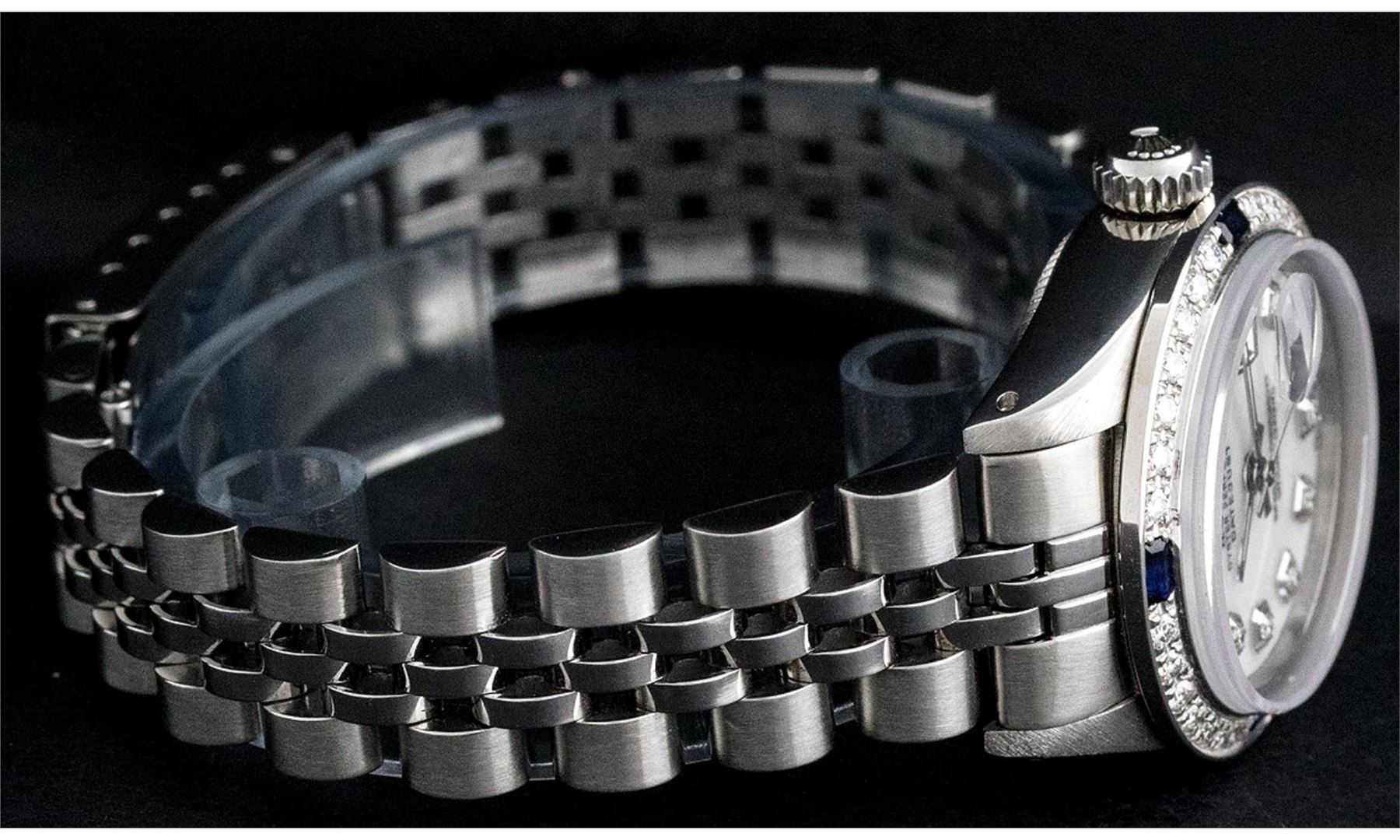 One Ladies Pre Owned Quickset Stainless Steel Rolex Datejust Polished Bright with Satin Finish, Serviced And Electronically Tested, Stainless Steel Case: 26mm, Stainless Steel Crown, Custom Bezel: New 18K White Gold Sapphire Beadset Diamond Bezel, Diamond + Gem Count: 28 Diamonds + 4 Sapphires. Custom Crystal: New Sapphire With Date Window. Custom Hands: New Luminescent Hands. Rolex Movement: Automatic Winding Movement 2135. Custom Dial: White Dial With Added Diamond Hour Markers, 10 Diamond On Dial. Date Window: 3 O'Clock Position Date Display, Model: Quickset Datejust. Condition: G-6 Extra Fine. Rolex Bracelet: Stainless Steel Jubilee Band. Bright Polish And Satin Finish. 6.0 Inch Length, Adjustable. Standard Clasp, With Rolex Logo. This Watch Has Been Serviced Time Tested And Is In Excellent Condition It Is Free Of All Scratches And Dents.