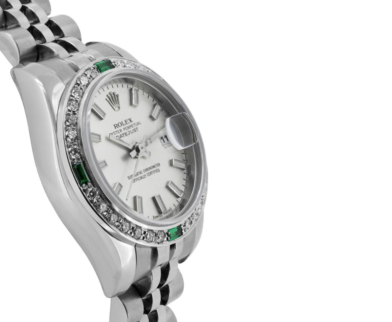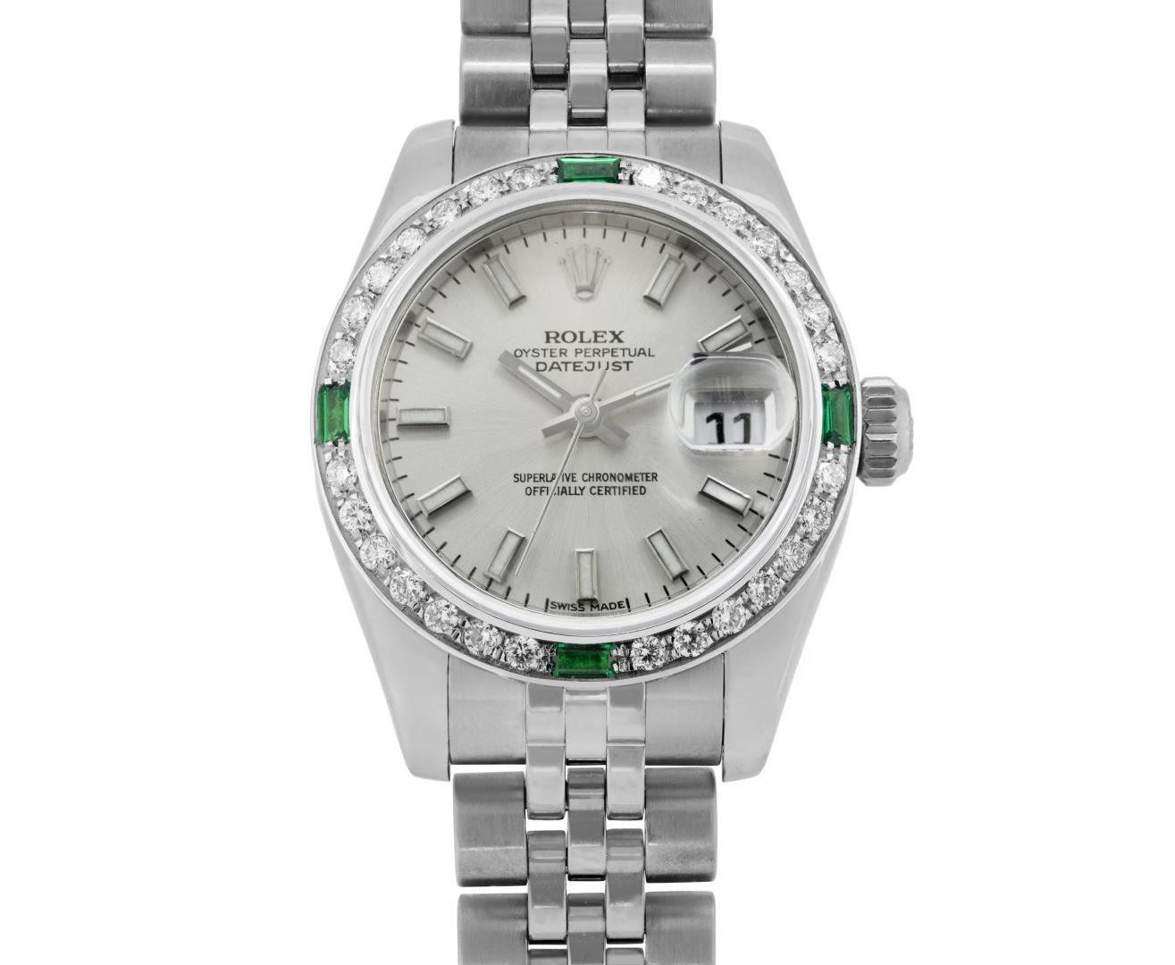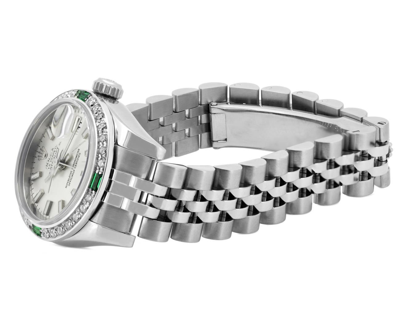 One Rolex Ladies Pre Owned Stainless Steel Datejust Wristwatch Polished Bright with Satin Finish, Serviced & Electronically Tested, Stainless Steel Case: 26mm, Stainless Steel Crown, Custom Bezel: New 18K White Gold Emerald Beadset Diamond Bezel, Diamond + Gem Count: 36 Diamonds + 4 Emeralds, Clarity: SI-VS, Color: G to H. Crystal: Sapphire With Magnified Date Window. Hands: Luminescent Hands. Rolex Movement: 2235 Automatic Winding Movement. Rolex Dial: Factory Silver Dial With Index Hour Markers And Dash Tracks. Date Window: 3 O'Clock Position Date Display, Model: Datejust. Condition: G-6 Extra Fine. Rolex Bracelet: Stainless Steel Jubilee Band With Hidden Clasp. Bright Polish & Satin Finish. 6.0 Inch Length, Adjustable. Hidden Clasp, With Rolex Logo. This Watch Has Been Serviced And Time Tested. It Is In Excellent Condition, Free Of All Scratches And Dents.