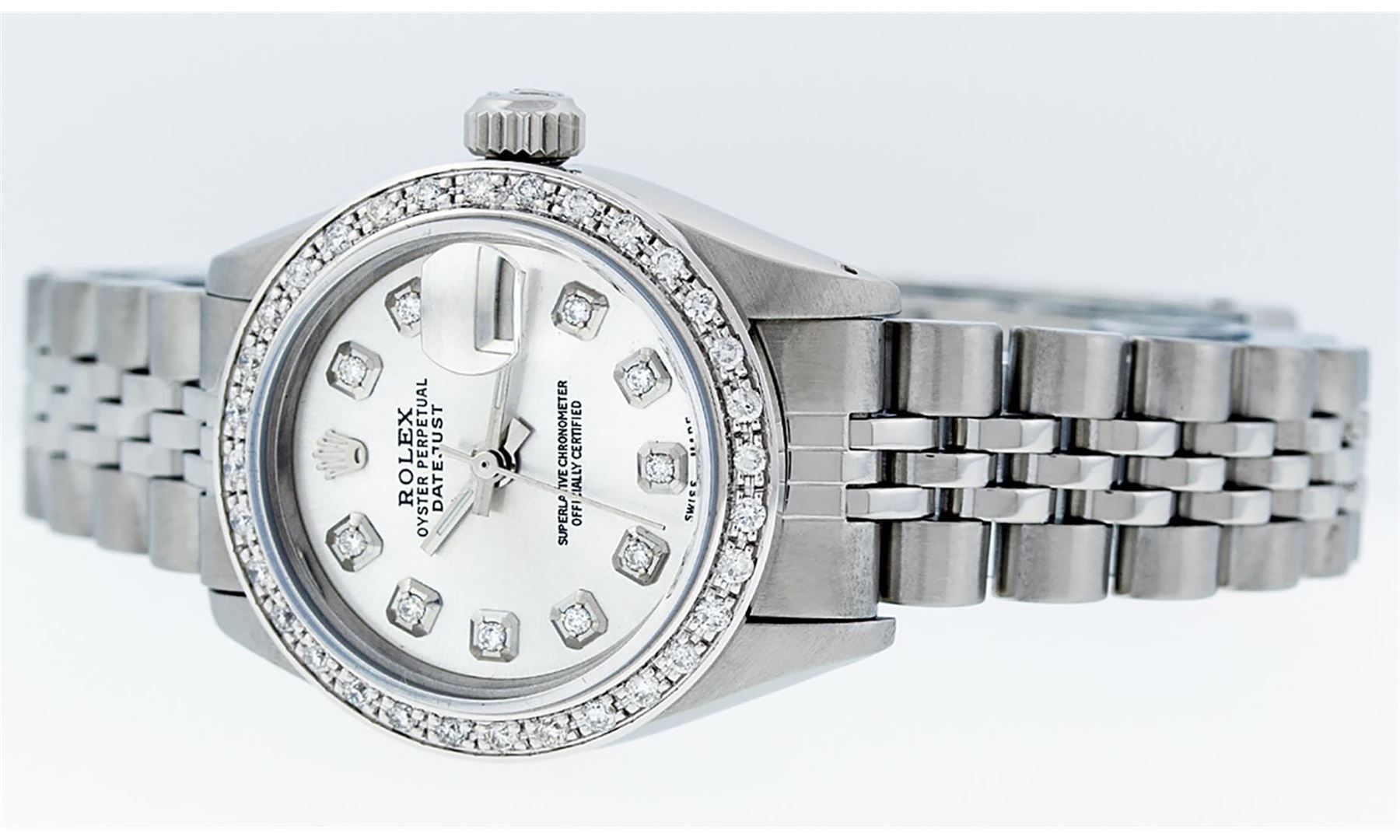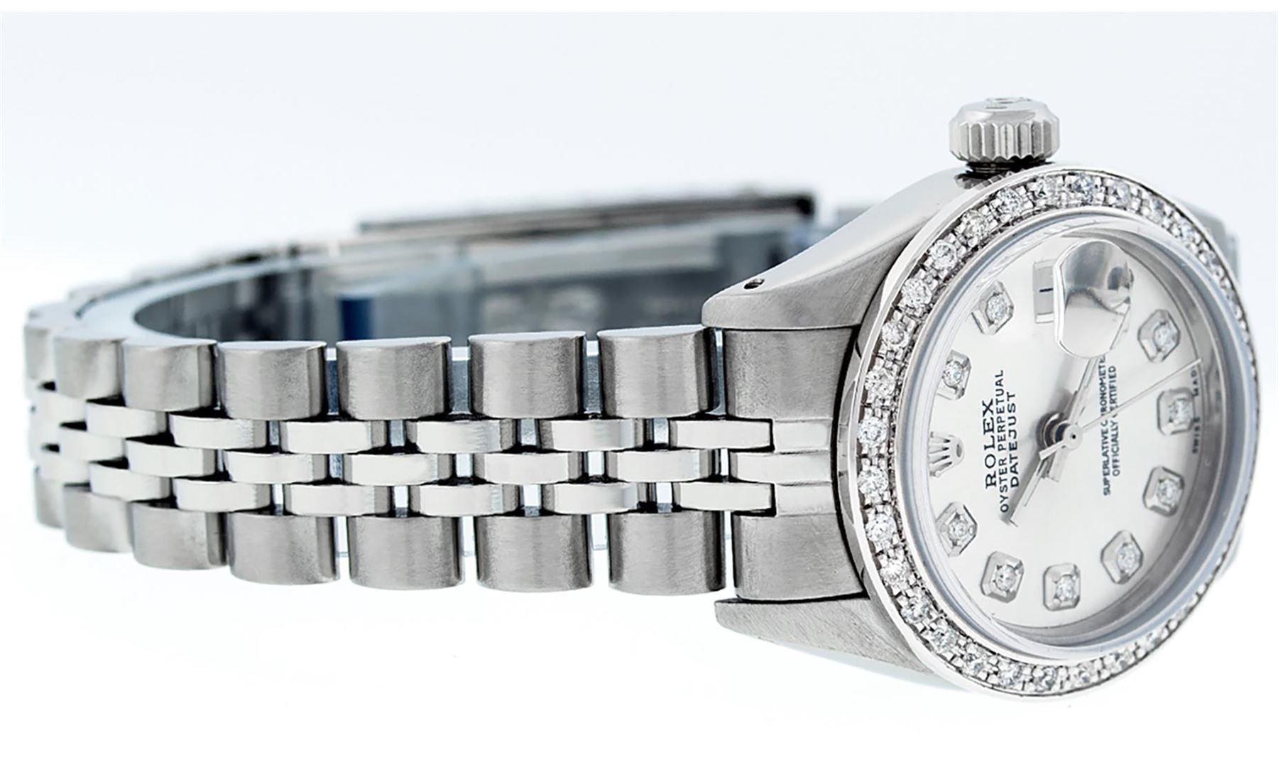 One Ladies Stainless Steel Rolex Datejust Polished Bright with Satin Finish, Serviced & Electronically Tested, Stainless Steel Case: 26mm, Stainless Steel Crown, Custom Bezel: New 18K White Gold Beadset Diamond Bezel, Diamond Count: 32 Diamonds, Total Weight .70 Carat, Clarity: SI-VS, Color: G to H. Custom Crystal: New Synthetic Sapphire Cyclops Lens. Custom Hands: New Luminescent Hands. Movement: Automatic Winding Movement Caliber 2030. Custom Dial: Silver Diamond Dial, Diamond Count: 10 Diamonds In Dial, Color: G To H, Clarity: SI-VS. Date Window: 3 O'Clock Position Date Display, Model: Datejust. Condition: G-6 Extra Fine. Bracelet: Stainless Steel Jubilee. Bright Polish & Satin Finish. 6.0 Inch Length, Adjustable. Standard Clasp, With Rolex Logo. This Watch Has Been Serviced Time Tested And Is In Excellent Condition It Is Free Of All Scratches And Dents.