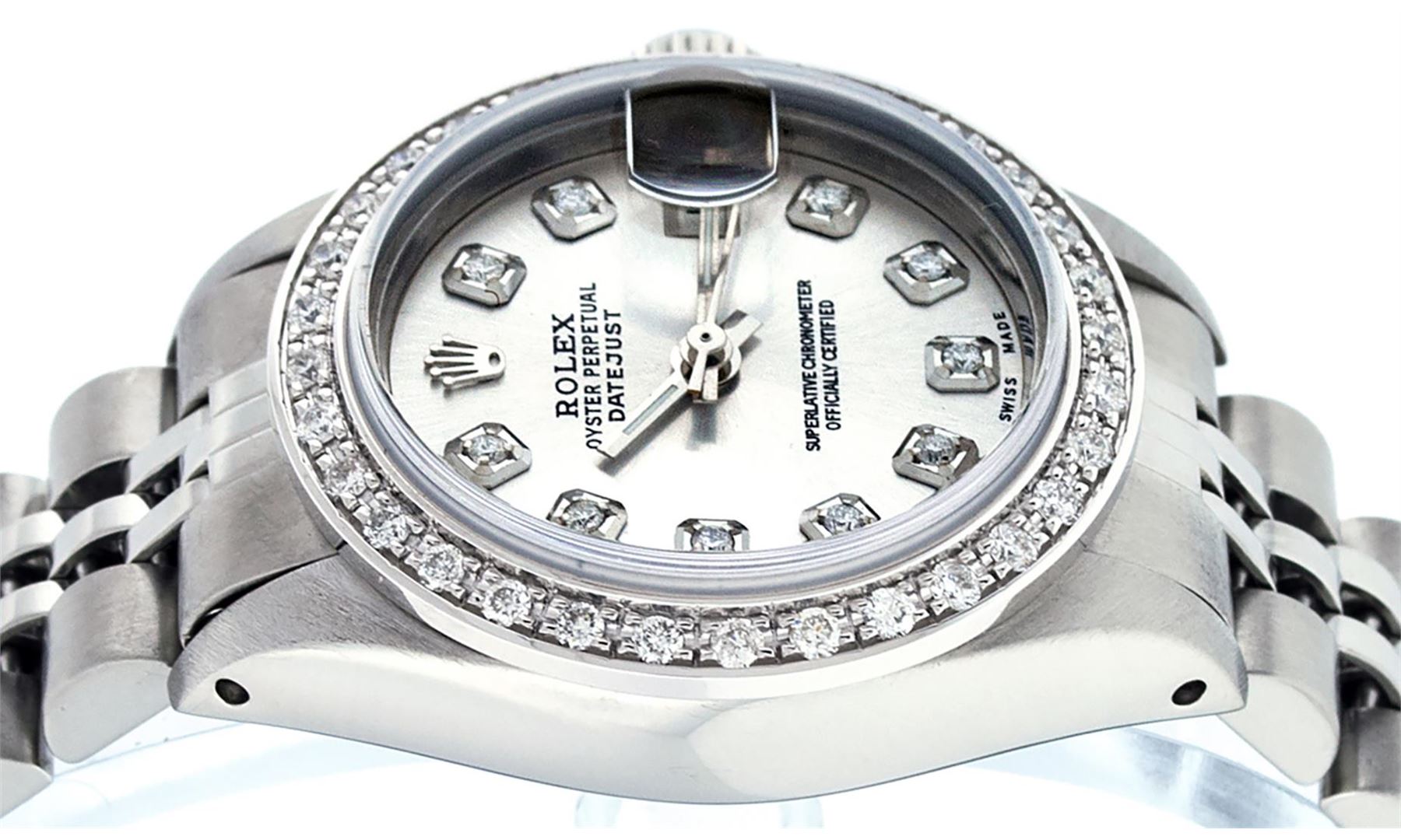 One Ladies Stainless Steel Rolex Datejust Polished Bright with Satin Finish, Serviced & Electronically Tested, Stainless Steel Case: 26mm, Stainless Steel Crown, Custom Bezel: New 18K White Gold Beadset Diamond Bezel, Diamond Count: 32 Diamonds, Total Weight .70 Carat, Clarity: SI-VS, Color: G to H. Custom Crystal: New Synthetic Sapphire Cyclops Lens. Custom Hands: New Luminescent Hands. Movement: Automatic Winding Movement Caliber 2030. Custom Dial: Silver Diamond Dial, Diamond Count: 10 Diamonds In Dial, Color: G To H, Clarity: SI-VS. Date Window: 3 O'Clock Position Date Display, Model: Datejust. Condition: G-6 Extra Fine. Bracelet: Stainless Steel Jubilee. Bright Polish & Satin Finish. 6.0 Inch Length, Adjustable. Standard Clasp, With Rolex Logo. This Watch Has Been Serviced Time Tested And Is In Excellent Condition It Is Free Of All Scratches And Dents.