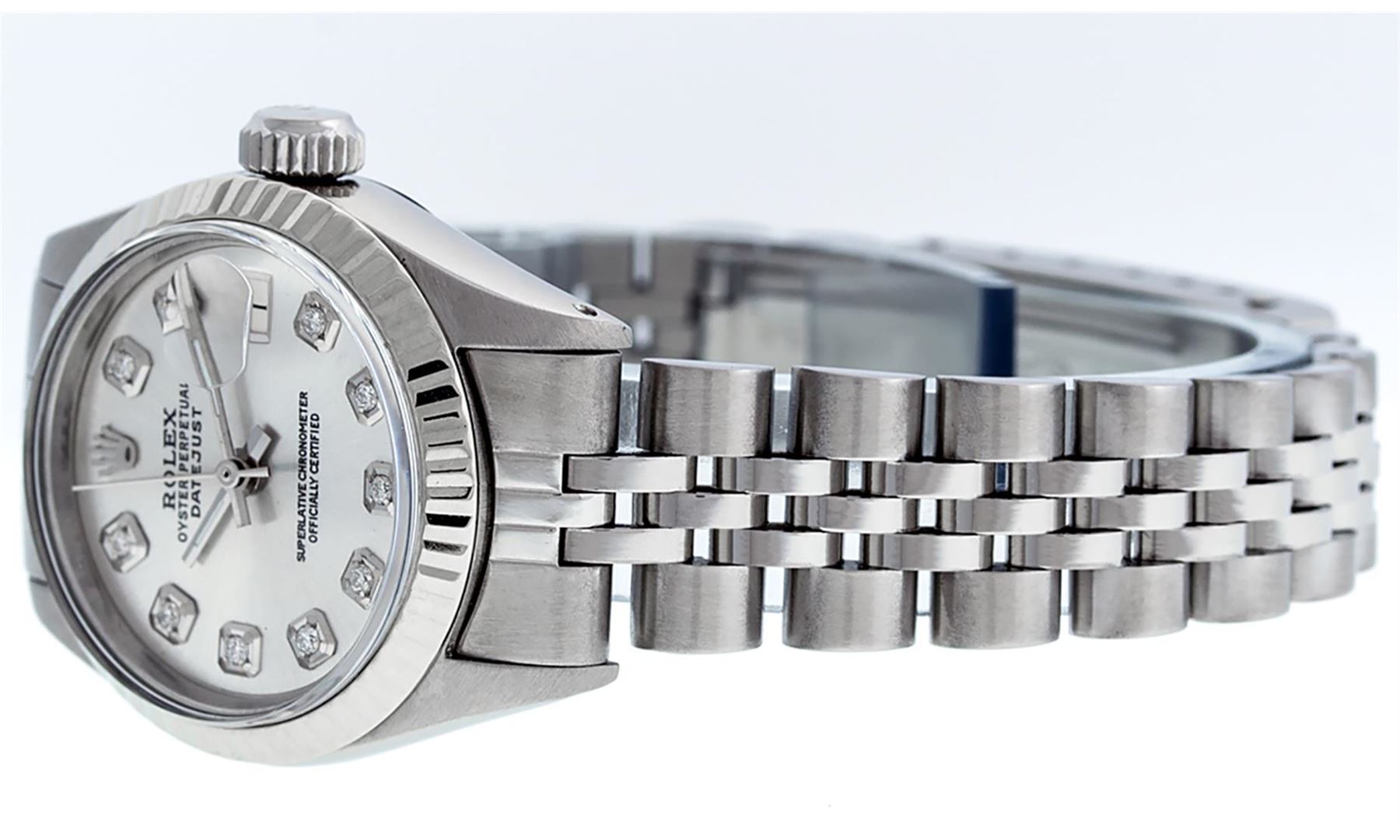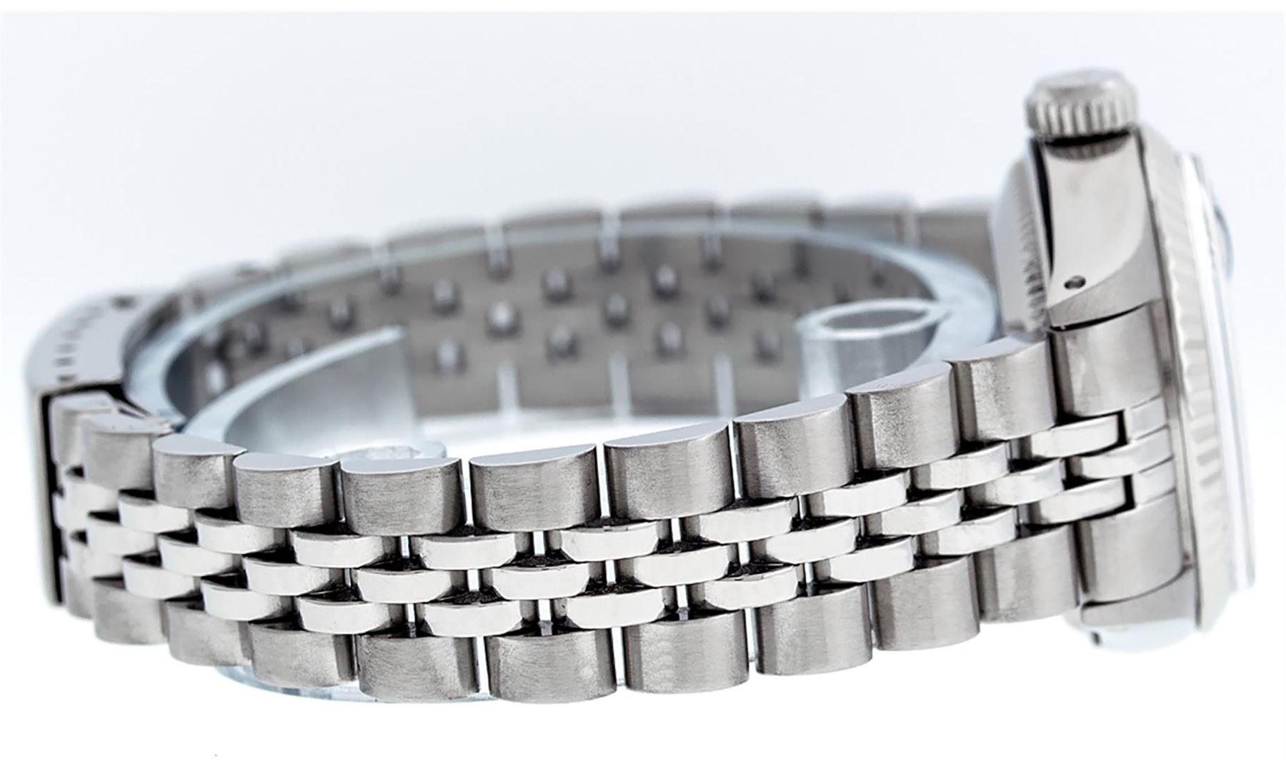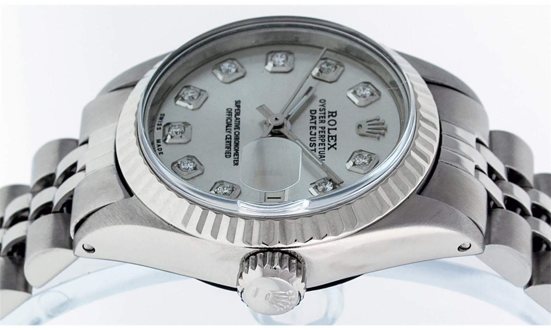 One Ladies Stainless Steel Rolex Datejust Polished Bright with Satin Finish, Serviced & Electronically Tested, Stainless Steel Case: 26mm, Stainless Steel Crown, Bezel: 14K White Gold Bezel. Custom Crystal: New Acrylic Cyclops Lens. Custom Hands: New Luminescent Hands. Movement: Automatic Winding Movement Caliber 2030. Dial: Silver Diamond Dial, Diamond Count: 10 Diamonds In Dial, Color: G to H, Clarity: SI-VS. Date Window: 3 O'Clock Position Date Display, Model: Datejust. Condition: G-6 Extra Fine. Bracelet: Stainless Steel Jubilee Band. Bright Polish & Satin Finish. 6.0 Inch Length, Adjustable. Standard Clasp, With Rolex Logo. This Watch Has Been Serviced Time Tested And Is In Excellent Condition It Is Free Of All Scratches And Dents.