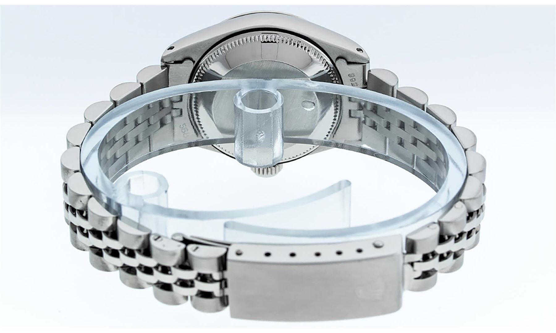 One Ladies Stainless Steel Rolex Datejust Polished Bright with Satin Finish, Serviced & Electronically Tested, Stainless Steel Case: 26mm, Stainless Steel Crown, Bezel: 14K White Gold Bezel. Custom Crystal: New Acrylic Cyclops Lens. Custom Hands: New Luminescent Hands. Movement: Automatic Winding Movement . Dial: Silver Diamond Dial, Diamond Count: 10 Diamonds In Dial, Color: G to H, Clarity: SI-VS. Date Window: 3 O'Clock Position Date Display, Model: Datejust. Condition: G-6 Extra Fine. Bracelet: Stainless Steel Jubilee Band. Bright Polish & Satin Finish. 6.0 Inch Length, Adjustable. Standard Clasp, With Rolex Logo. This Watch Has Been Serviced Time Tested And Is In Excellent Condition It Is Free Of All Scratches And Dents.