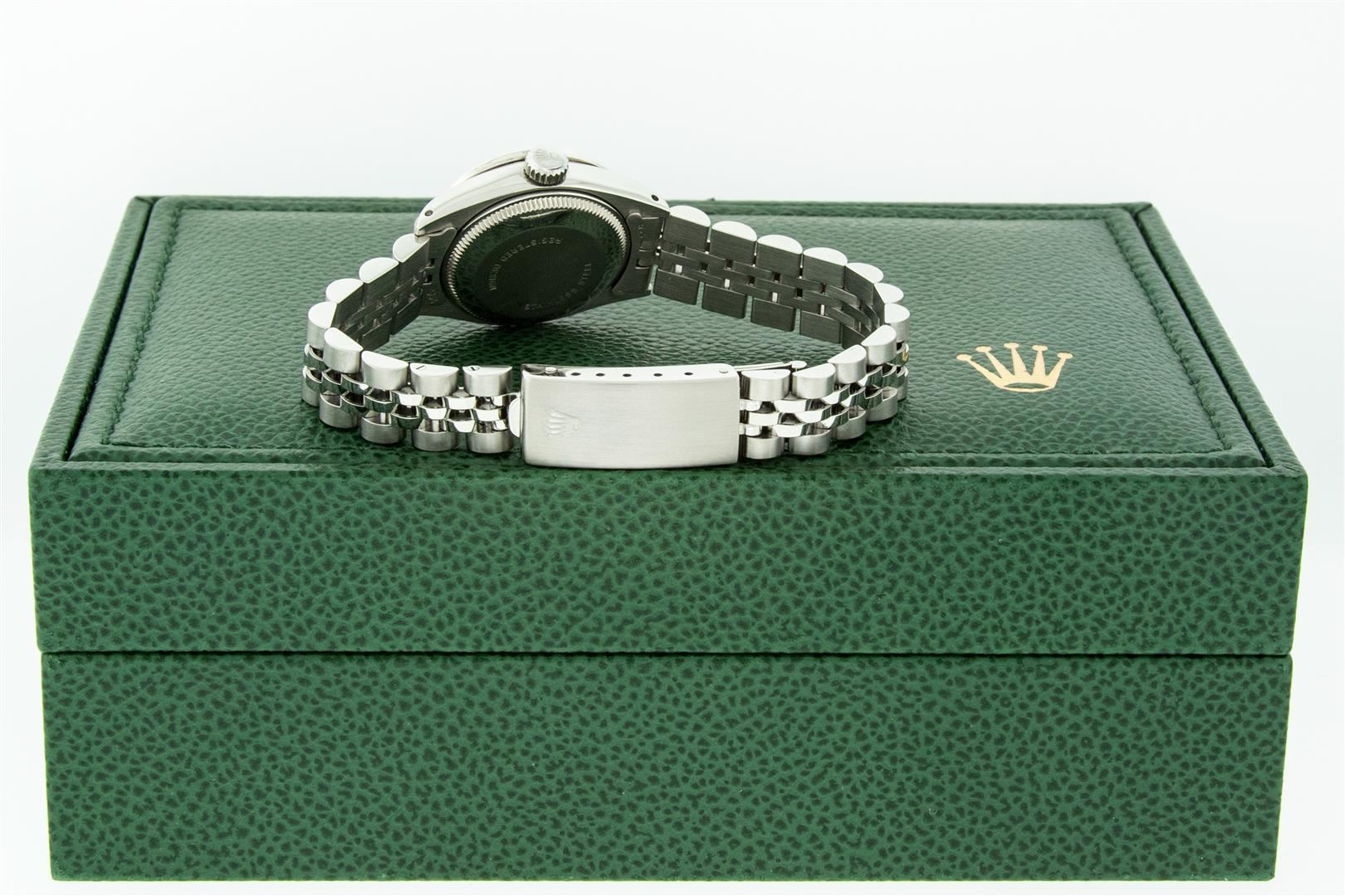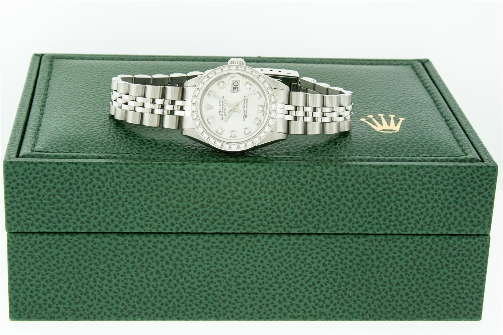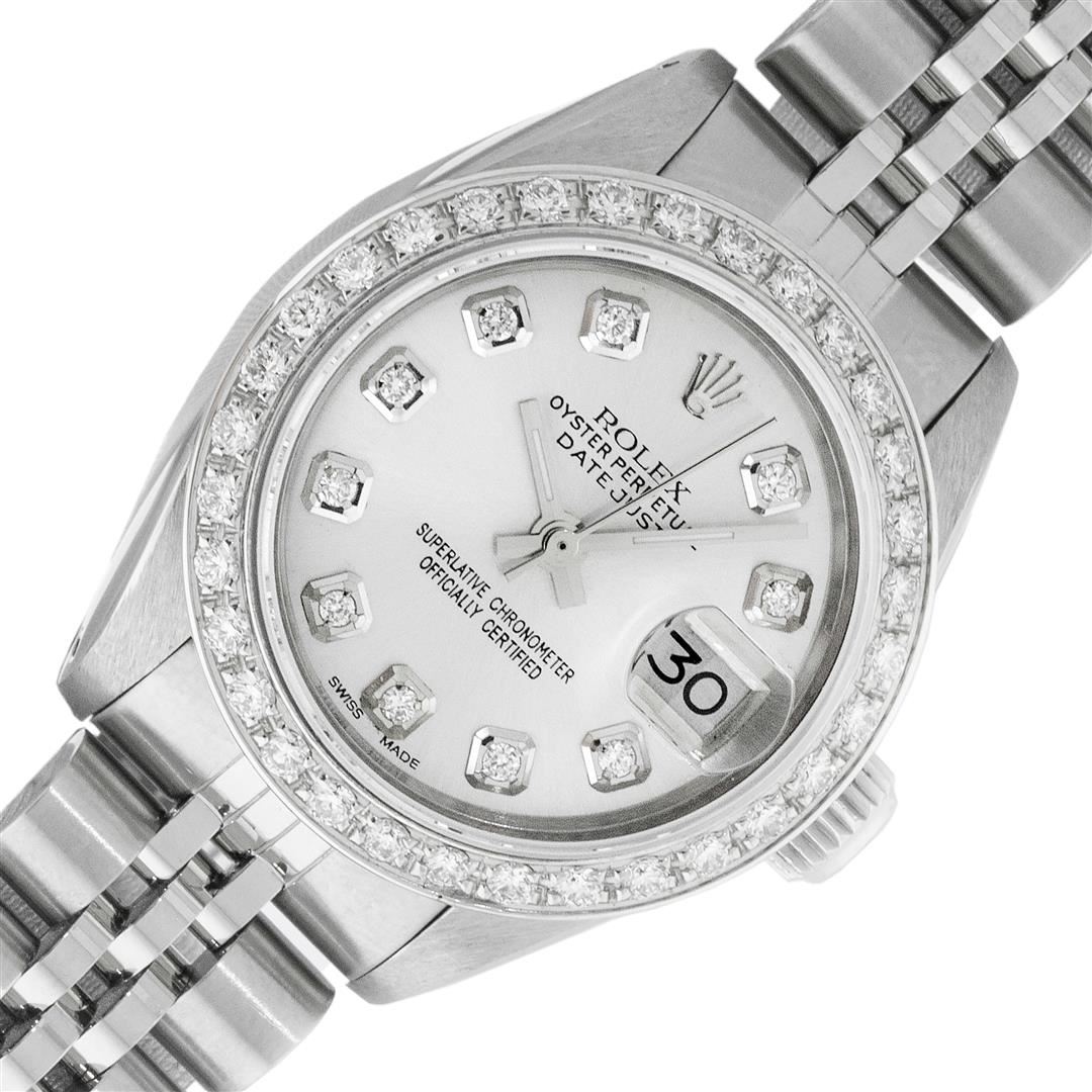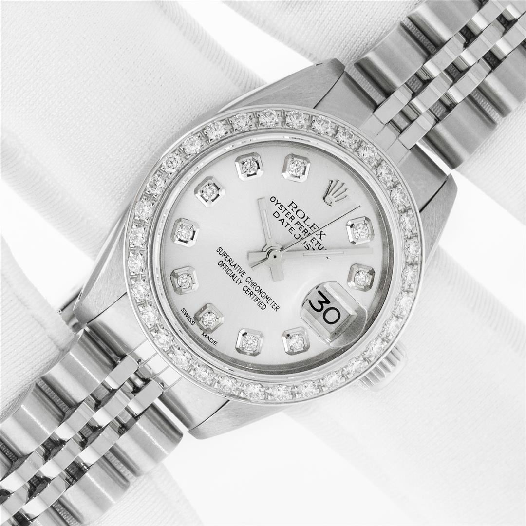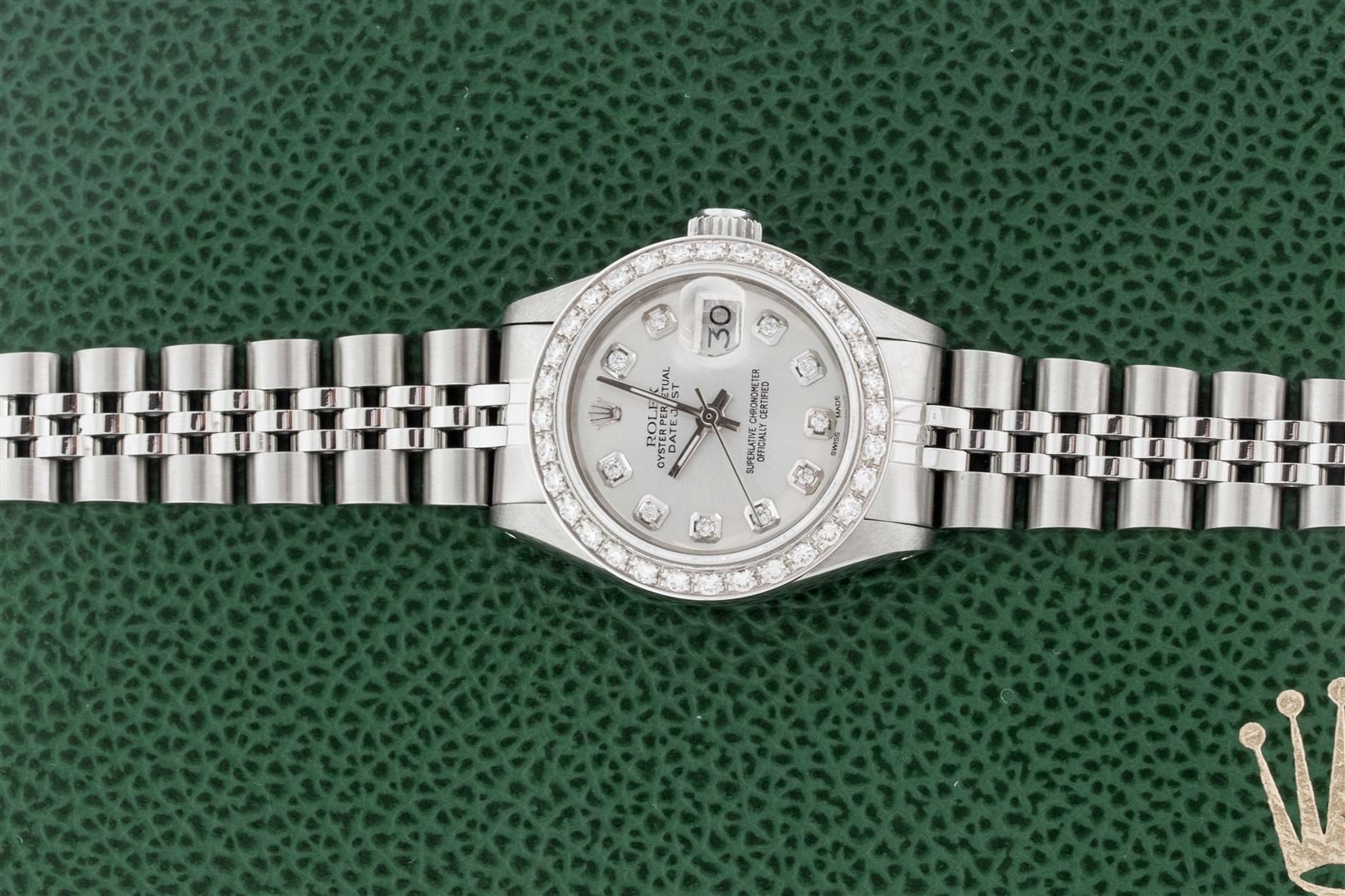 One Ladies Stainless Steel Rolex Oyster Perpetual Datejust Polished Bright with Satin Finish, Serviced & Electronically Tested, Stainless Steel Case: 26mm, Rolex Stainless Steel Crown, Custom Bezel: New 18K White Gold Beadset Diamond Bezel, Diamond Count: 32 Diamonds, Clarity: SI-VS, Color: G to H. Custom Crystal: New Sapphire With Magnified Date Window. Custom Hands: New Luminescent Hands. Rolex Movement: Automatic Winding Movement. Custom Dial: Refinished To Silver With Custom Added Diamonds, Diamond Count: 10 Diamonds In Dial, Color: G To H, Clarity: SI-VS. Date Window: 3 O'clock Position Date Display, Model: Datejust. Condition: G-6 Extra Fine. Rolex Bracelet: Stainless Steel Jubilee Band. Bright Polish & Satin Finish. 6.0 Inch Length, Adjustable. Standard Clasp, With Rolex Logo. This Pre Owned Watch Has Been Serviced Time Tested And Is In Excellent Condition It Is Free Of All Scratches And Dents. This Watch Comes With A Rolex Box.