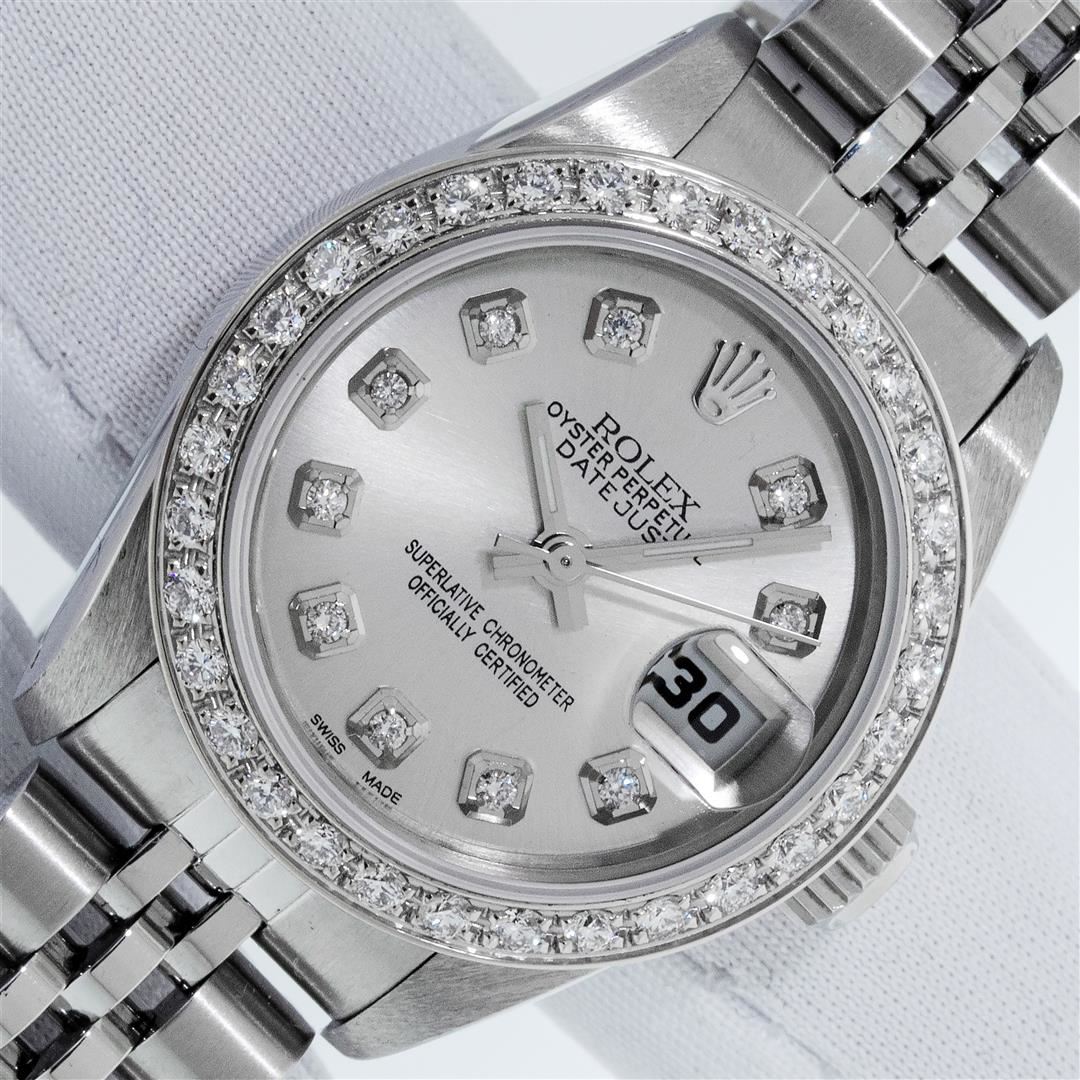 One Ladies Stainless Steel Rolex Oyster Perpetual Datejust Polished Bright with Satin Finish, Serviced & Electronically Tested, Stainless Steel Case: 26mm, Rolex Stainless Steel Crown, Custom Bezel: New 18K White Gold Beadset Diamond Bezel, Diamond Count: 32 Diamonds, Clarity: SI-VS, Color: G to H. Custom Crystal: New Sapphire With Magnified Date Window. Custom Hands: New Luminescent Hands. Rolex Movement: Automatic Winding Movement. Custom Dial: Refinished To Silver With Added Diamonds, Diamond Count: 10 Diamonds In Dial, Color: G To H, Clarity: SI-VS. Date Window: 3 O'clock Position Date Display, Model: Datejust. Condition: G-6 Extra Fine. Rolex Bracelet: Stainless Steel Jubilee Band. Bright Polish & Satin Finish. 6.0 Inch Length, Adjustable. Standard Clasp, With Rolex Logo. This Pre Owned Watch Has Been Serviced Time Tested And Is In Excellent Condition It Is Free Of All Scratches And Dents. This Watch Comes With A Rolex Box.