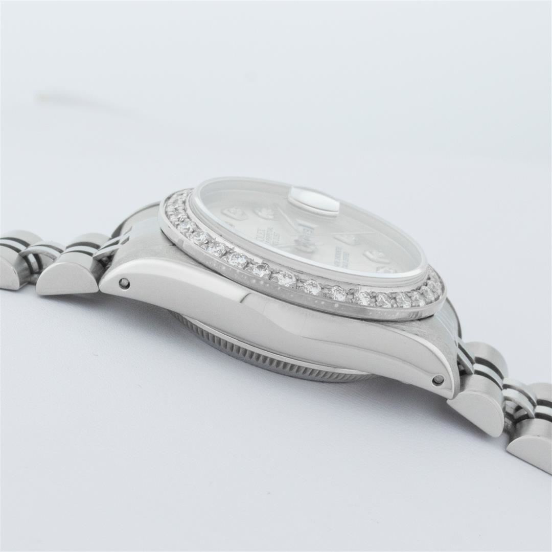 One Ladies Stainless Steel Rolex Oyster Perpetual Datejust Polished Bright with Satin Finish, Serviced & Electronically Tested, Stainless Steel Case: 26mm, Stainless Steel Crown, Custom Bezel: New 18K White Gold Beadset Diamond Bezel, Diamond Count: 32 Diamonds, Total Weight .70 Carat, Clarity: SI-VS, Color: G to H. Custom Crystal: New Scratch Resistant Synthetic Sapphire Cyclops Lens. Custom Hands: New Luminescent Hands. Movement: Automatic Winding Movement. Custom Dial: Refinished Silver Diamond Dial, Diamond Count: 10 Diamonds In Dial, Color: G To H, Clarity: SI-VS. Date Window: 3 O'Clock Position Date Display, Model: Datejust. Condition: G-6 Extra Fine. Bracelet: Stainless Steel Jubilee Band. Bright Polish & Satin Finish. 6.0 Inch Length, Adjustable. Standard Clasp, With Rolex Logo. This Watch Has Been Serviced Time Tested And Is In Excellent Condition It Is Free Of All Scratches And Dents.