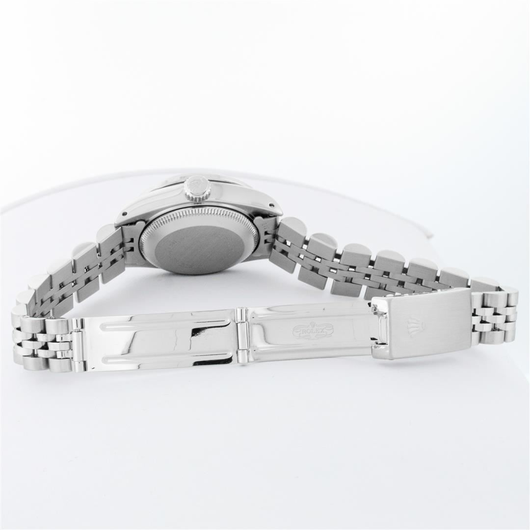 One Ladies Stainless Steel Rolex Oyster Perpetual Datejust Polished Bright with Satin Finish, Serviced & Electronically Tested, Stainless Steel Case: 26mm, Stainless Steel Crown, Custom Bezel: New 18K White Gold Beadset Diamond Bezel, Diamond Count: 32 Diamonds, Total Weight .70 Carat, Clarity: SI-VS, Color: G to H. Custom Crystal: New Scratch Resistant Synthetic Sapphire Cyclops Lens. Custom Hands: New Luminescent Hands. Movement: Automatic Winding Movement. Custom Dial: Refinished Silver Diamond Dial, Diamond Count: 10 Diamonds In Dial, Color: G To H, Clarity: SI-VS. Date Window: 3 O'Clock Position Date Display, Model: Datejust. Condition: G-6 Extra Fine. Bracelet: Stainless Steel Jubilee Band. Bright Polish & Satin Finish. 6.0 Inch Length, Adjustable. Standard Clasp, With Rolex Logo. This Watch Has Been Serviced Time Tested And Is In Excellent Condition It Is Free Of All Scratches And Dents.
