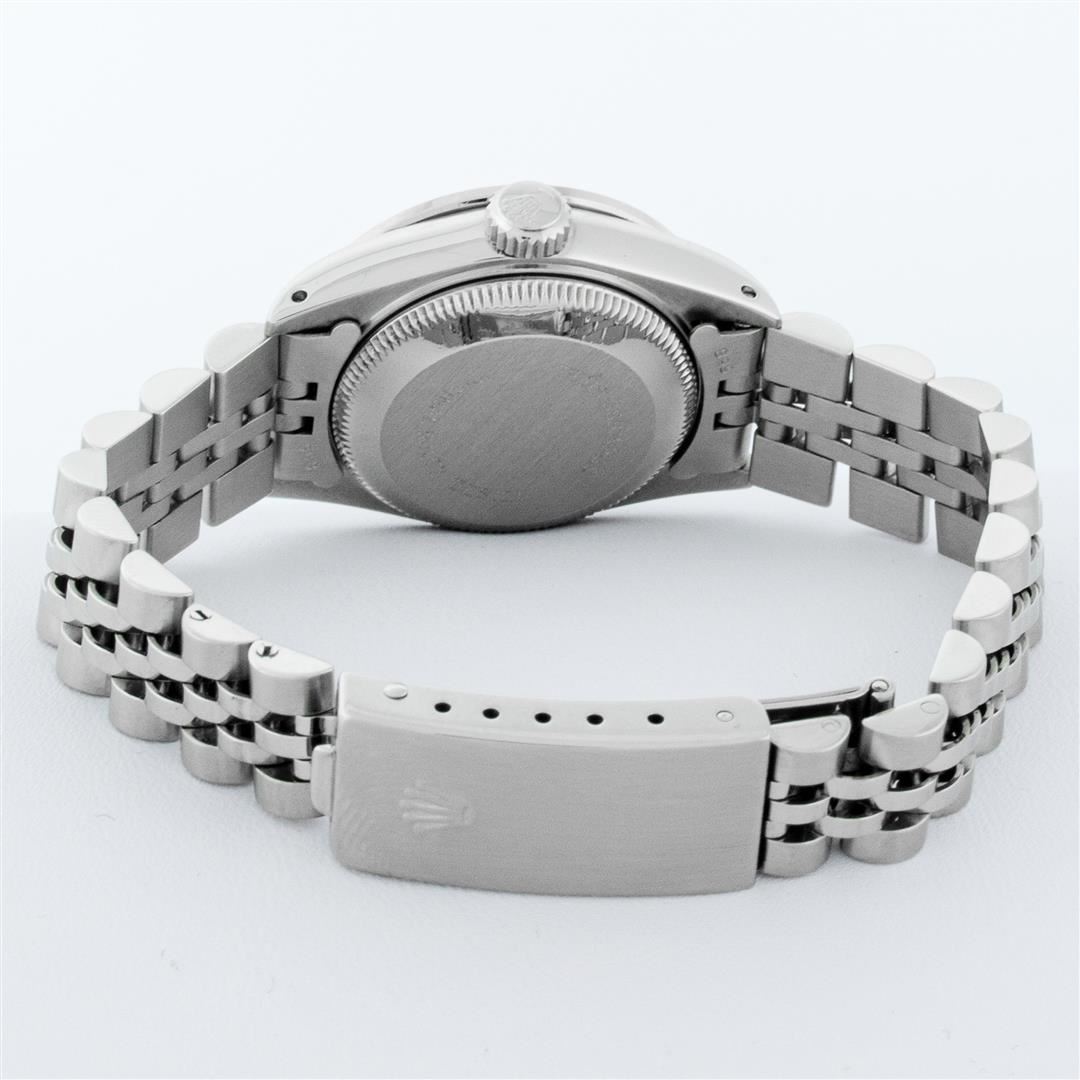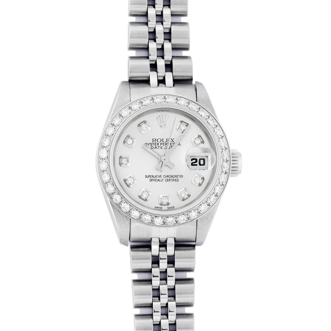 One Ladies Stainless Steel Rolex Oyster Perpetual Datejust Polished Bright with Satin Finish, Serviced & Electronically Tested, Stainless Steel Case: 26mm, Stainless Steel Crown, Custom Bezel: New 18K White Gold Beadset Diamond Bezel, Diamond Count: 32 Diamonds, Total Weight .70 Carat, Clarity: SI-VS, Color: G to H. Custom Crystal: New Scratch Resistant Synthetic Sapphire Cyclops Lens. Custom Hands: New Luminescent Hands. Movement: Automatic Winding Movement. Custom Dial: Refinished Silver Diamond Dial, Diamond Count: 10 Diamonds In Dial, Color: G To H, Clarity: SI-VS. Date Window: 3 O'Clock Position Date Display, Model: Datejust. Condition: G-6 Extra Fine. Bracelet: Stainless Steel Jubilee Band. Bright Polish & Satin Finish. 6.0 Inch Length, Adjustable. Standard Clasp, With Rolex Logo. This Watch Has Been Serviced Time Tested And Is In Excellent Condition It Is Free Of All Scratches And Dents.