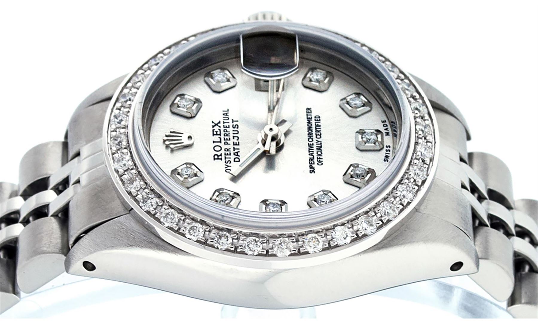 One Ladies Stainless Steel Rolex Oyster Perpetual Datejust Polished Bright with Satin Finish, Serviced & Electronically Tested, Stainless Steel Case: 26mm, Stainless Steel Crown, Custom Bezel: New 18K White Gold Beadset Diamond Bezel, Diamond Count: 32 Diamonds, Total Weight .70 Carat, Clarity: SI-VS, Color: G to H. Custom Crystal: New Scratch Resistant Synthetic Sapphire Cyclops Lens. Custom Hands: New Luminescent Hands. Movement: Automatic Winding Movement. Custom Dial: Refinished Silver Diamond Dial, Diamond Count: 10 Diamonds In Dial, Color: G To H, Clarity: SI-VS. Date Window: 3 O'clock Position Date Display, Model: Datejust. Condition: G-6 Extra Fine. Bracelet: Stainless Steel Jubilee Band. Bright Polish & Satin Finish. 6.0 Inch Length, Adjustable. Standard Clasp, With Rolex Logo. This Watch Has Been Serviced Time Tested And Is In Excellent Condition It Is Free Of All Scratches And Dents.