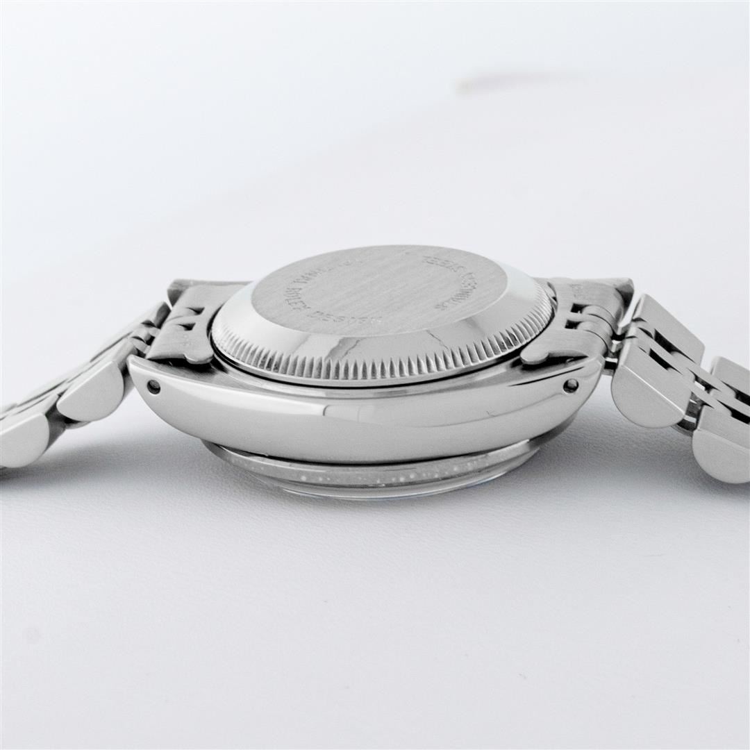 One Ladies Stainless Steel Rolex Oyster Perpetual Datejust Polished Bright with Satin Finish, Serviced & Electronically Tested, Stainless Steel Case: 26mm, Stainless Steel Crown, Custom Bezel: New 18K White Gold Beadset Diamond Bezel, Diamond Count: 32 Diamonds, Total Weight .70 Carat, Clarity: SI-VS, Color: G to H. Custom Crystal: New Scratch Resistant Synthetic Sapphire Cyclops Lens. Custom Hands: New Luminescent Hands. Movement: Automatic Winding Movement. Custom Dial: Refinished Silver Diamond Dial, Diamond Count: 10 Diamonds In Dial, Color: G To H, Clarity: SI-VS. Date Window: 3 O'Clock Position Date Display, Model: Datejust. Condition: G-6 Extra Fine. Bracelet: Stainless Steel Jubilee Band. Bright Polish & Satin Finish. 6.0 Inch Length, Adjustable. Standard Clasp, With Rolex Logo. This Watch Has Been Serviced Time Tested And Is In Excellent Condition It Is Free Of All Scratches And Dents.