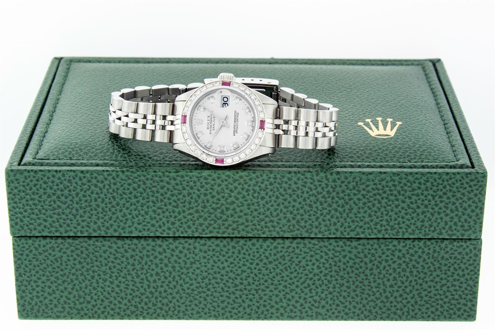One Ladies Stainless Steel Rolex Datejust Polished Bright with Satin Finish, Serviced & Electronically Tested, Rolex Stainless Steel Case: 26mm, Rolex Stainless Steel Crown, Custom Bezel: New 18K White Gold Ruby Beadset Diamond Bezel, Diamond + Gem Count: 28 Diamonds + 4 Rubies. Clarity: SI-VS, Color: G to H. Custom Crystal: New Sapphire With Magnified Date Window. Custom Hands: New Luminescent Hands. Rolex Movement: Automatic Winding Movement. Custom Dial: Refinished To Silver With Custom Added Diamonds, 10 Diamonds in Dial, G To H In Color, Clarity: SI-VS. Date Window: 3 O'Clock Position Date Display, Model: Datejust. Condition: G-6 Extra Fine. Rolex Bracelet: Stainless Steel Jubilee Band. Bright Polish & Satin Finish. 6.0 Inch Length, Adjustable. Standard Clasp, With Rolex Logo. This Pre Owned Watch Has Been Serviced Time Tested And Is In Excellent Condition It Is Free Of All Scratches And Dents. This Watch Comes With A Rolex Box.