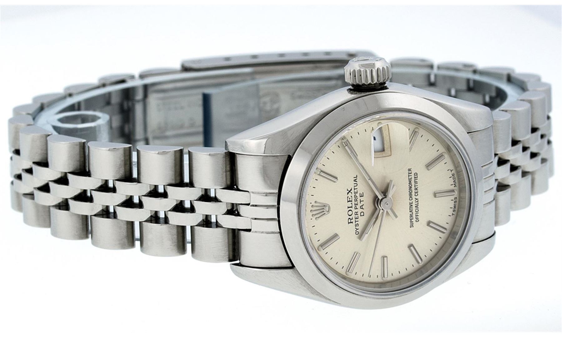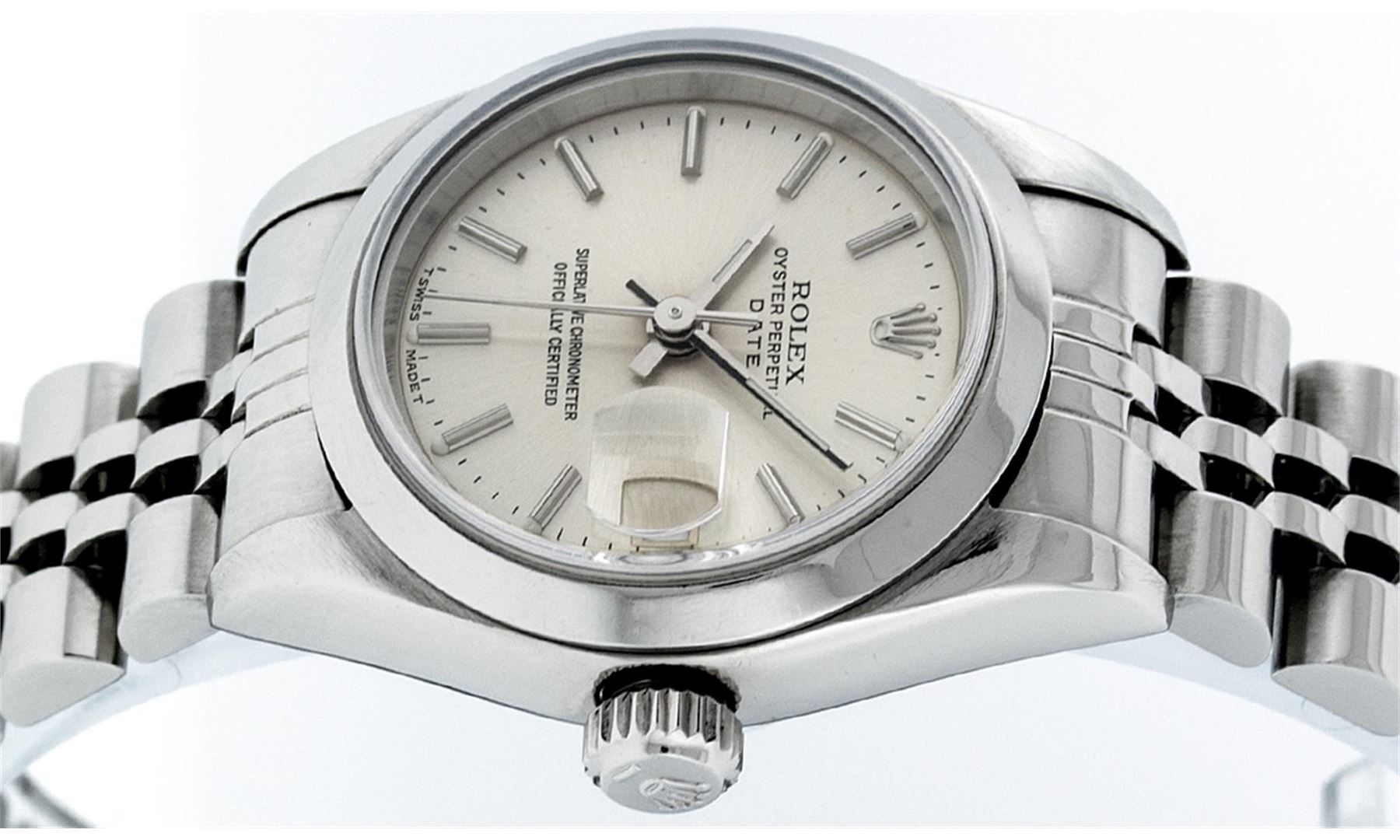 One Ladies Quickset Stainless Steel Rolex Datejust Polished Bright with Satin Finish, Serviced & Electronically Tested, Stainless Steel Case: 26mm, Stainless Steel Crown, Bezel: Stainless Steel Smooth Bezel. Custom Crystal: New Scratch Resistant Sapphire Cyclops Lens. Custom Hands: New Luminescent Hands. Movement: Automatic Winding Movement Caliber 2235. Dial: Silver Index Dial With Luminescent Dots & Dash Track. Date Window: 3 O'Clock Position Date Display, Model: Quickset Datejust. Condition: G-6 Extra Fine. Bracelet: Stainless Steel Jubilee Band. Bright Polish & Satin Finish. 6.0 Inch Length, Adjustable. Standard Clasp, With Rolex Logo. This Watch Has Been Serviced Time Tested And Is In Excellent Condition It Is Free Of All Scratches And Dents.
