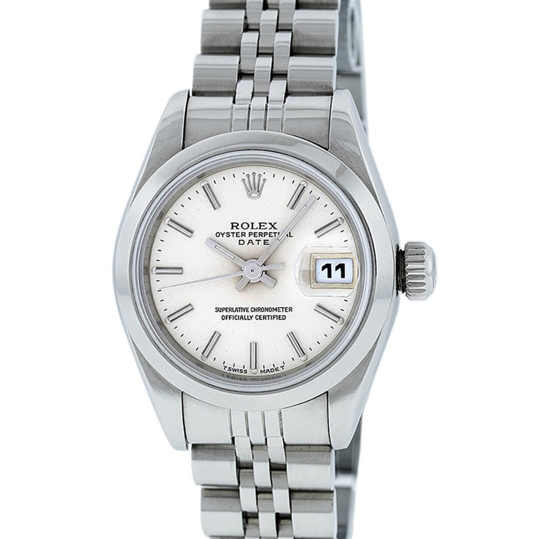 One Ladies Quickset Stainless Steel Rolex Datejust Polished Bright with Satin Finish, Serviced & Electronically Tested, Stainless Steel Case: 26mm, Stainless Steel Crown, Bezel: Stainless Steel Smooth Bezel. Custom Crystal: New Scratch Resistant Sapphire Cyclops Lens. Custom Hands: New Luminescent Hands. Movement: Automatic Winding Movement Caliber 2235. Dial: Silver Index Dial With Luminescent Dots & Dash Track. Date Window: 3 O'Clock Position Date Display, Model: Quickset Datejust. Condition: G-6 Extra Fine. Bracelet: Stainless Steel Jubilee Band. Bright Polish & Satin Finish. 6.0 Inch Length, Adjustable. Standard Clasp, With Rolex Logo. This Watch Has Been Serviced Time Tested And Is In Excellent Condition It Is Free Of All Scratches And Dents.