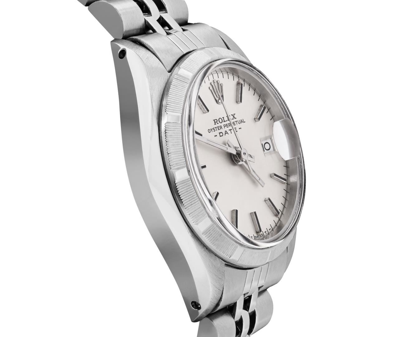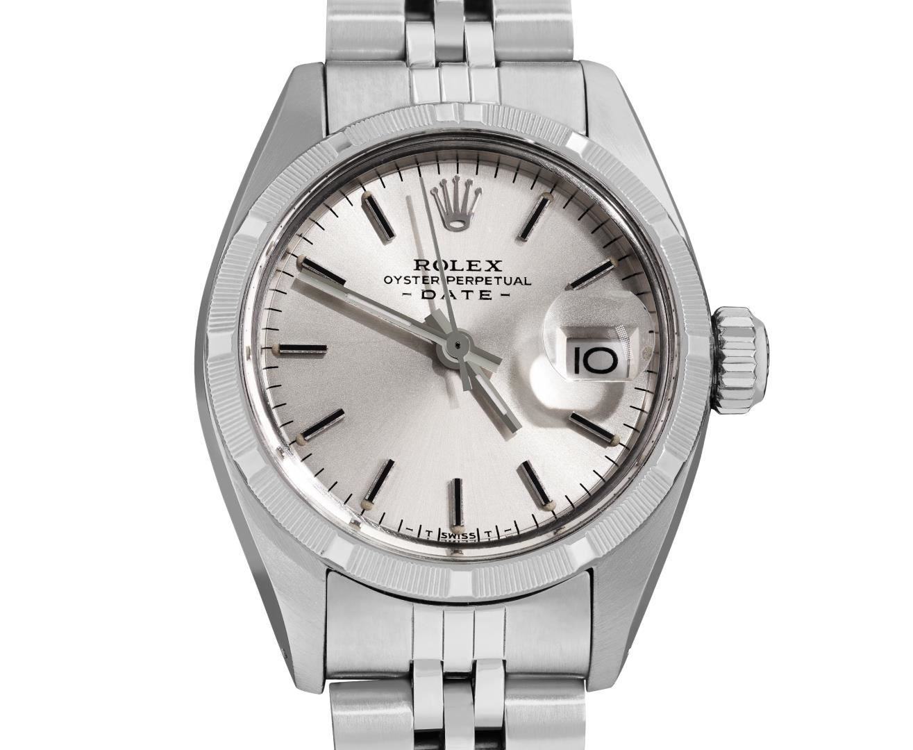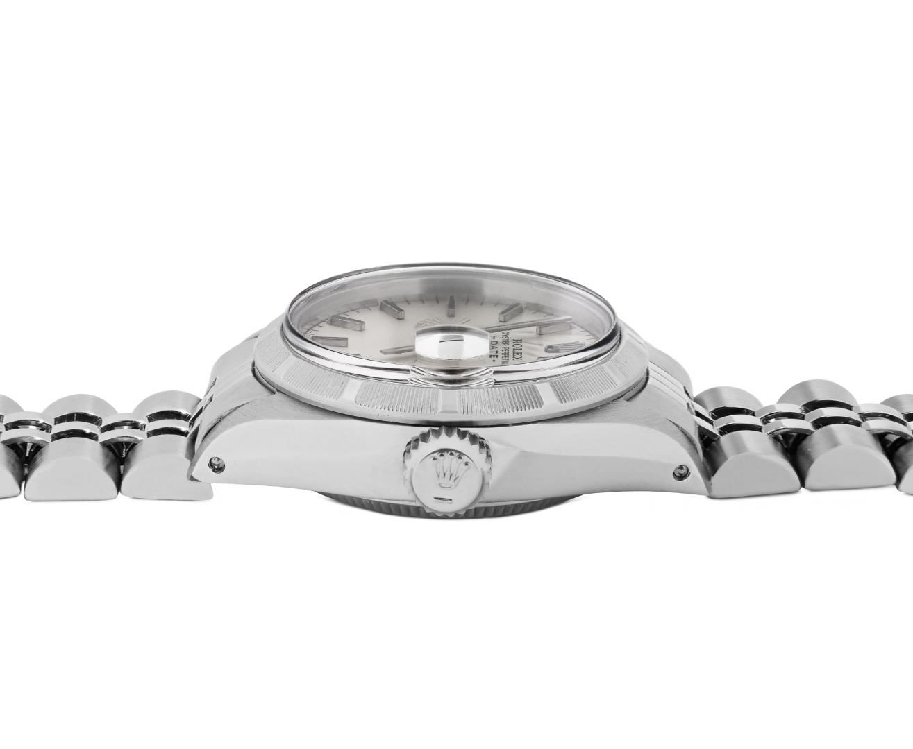 One Rolex Ladies Pre Owned Stainless Steel Date Wristwatch Polished Bright with Satin Finish, Serviced & Electronically Tested, Stainless Steel Case: 26mm, Stainless Steel Crown, Stainless Steel Engine Turn Bezel, Custom Crystal: New Acrylic With Magnifying Date Window. Custom Hands: New Luminescent Hands. Rolex Movement: Automatic Winding Movement 2035. Rolex Dial: Factory Silver With Index Hour Markers And Lumi Dots. Date Window: 3 O'clock Position Date Display, Model: Date. Condition: G-6 Extra Fine. Rolex Bracelet: Stainless Steel Jubilee Band. Bright Polish & Satin Finish. 6.0 Inch Length, Adjustable. Standard Clasp, With Rolex Logo. This Watch Has Been Serviced Time Tested And Is In Excellent Condition. It Is Free Of All Scratches And Dents.