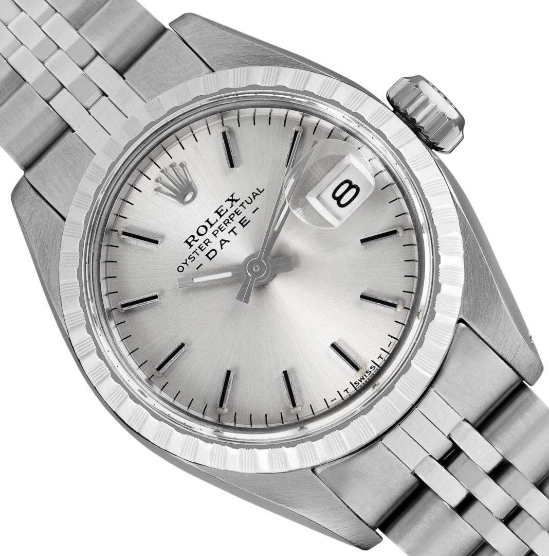 One Rolex Ladies Pre Owned Stainless Steel Date Wristwatch Polished Bright with Satin Finish, Serviced & Electronically Tested, Stainless Steel Case: 26mm, Stainless Steel Crown, Stainless Steel Engine Turn Bezel, Custom Crystal: New Acrylic With Magnifying Date Window. Custom Hands: New Luminescent Hands. Rolex Movement: Automatic Winding Movement 2035. Rolex Dial: Factory Silver With Index Hour Markers And Lumi Dots. Date Window: 3 O'clock Position Date Display, Model: Date. Condition: G-6 Extra Fine. Rolex Bracelet: Stainless Steel Jubilee Band. Bright Polish & Satin Finish. 6.0 Inch Length, Adjustable. Standard Clasp, With Rolex Logo. This Watch Has Been Serviced Time Tested And Is In Excellent Condition. It Is Free Of All Scratches And Dents. This Watch Comes With A Rolex Box.