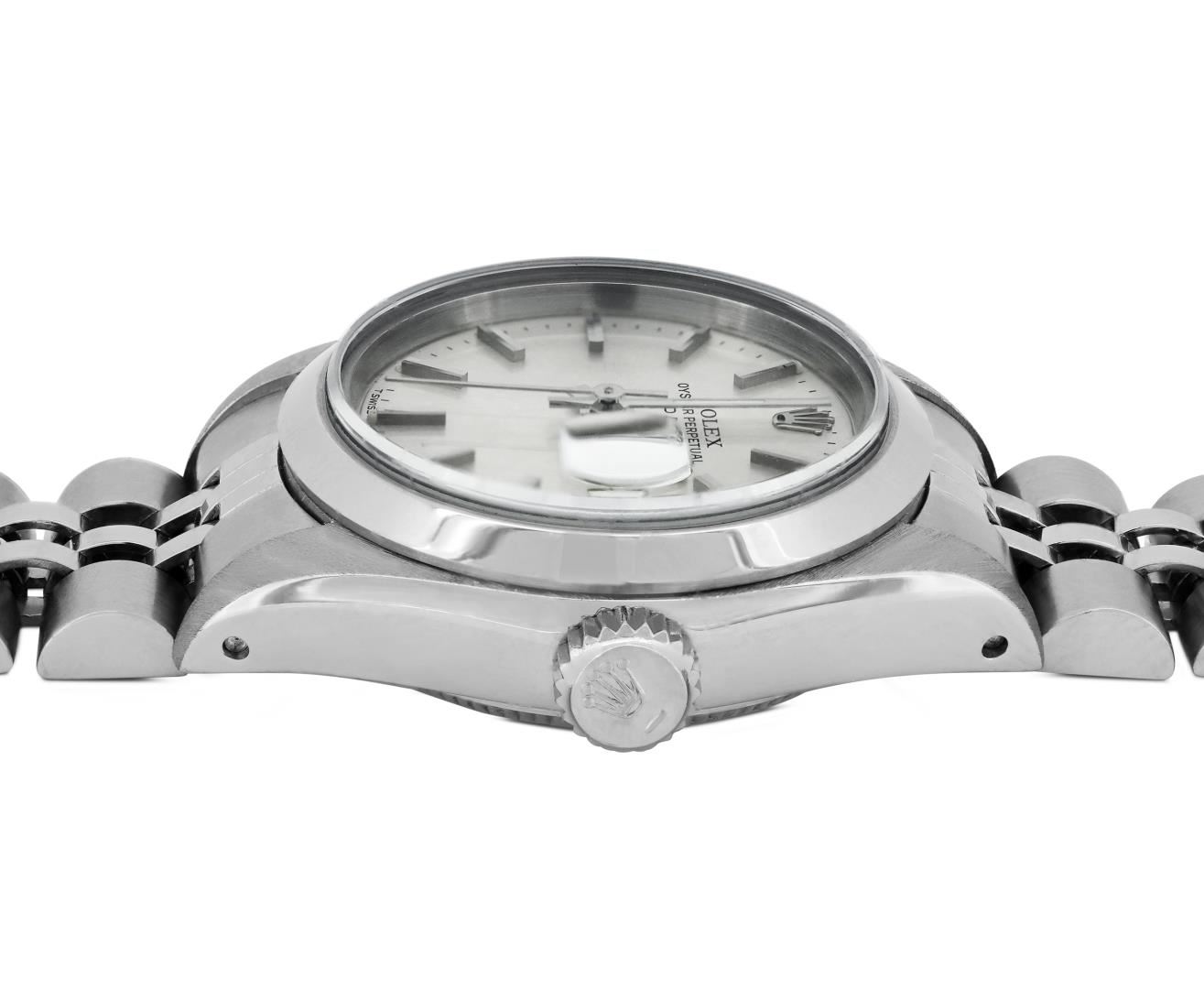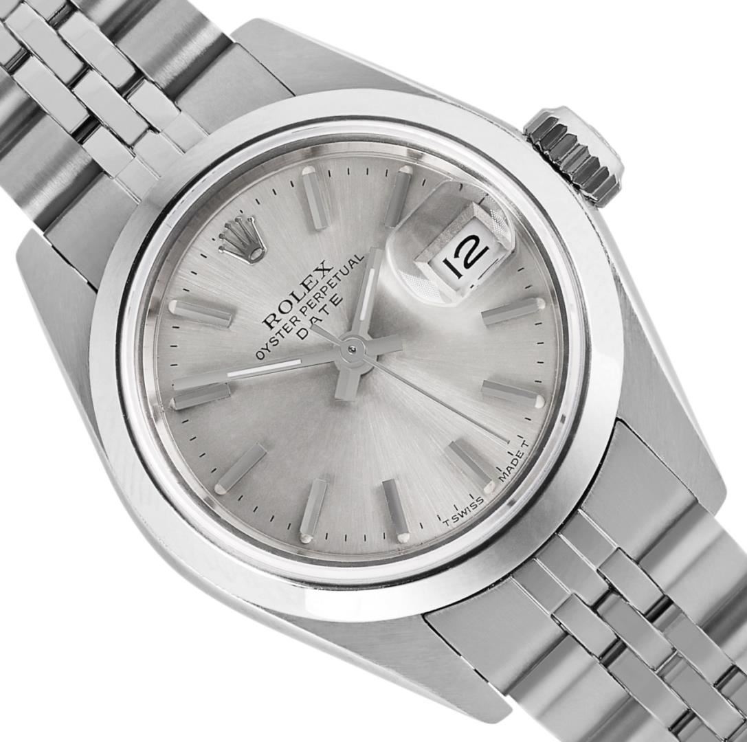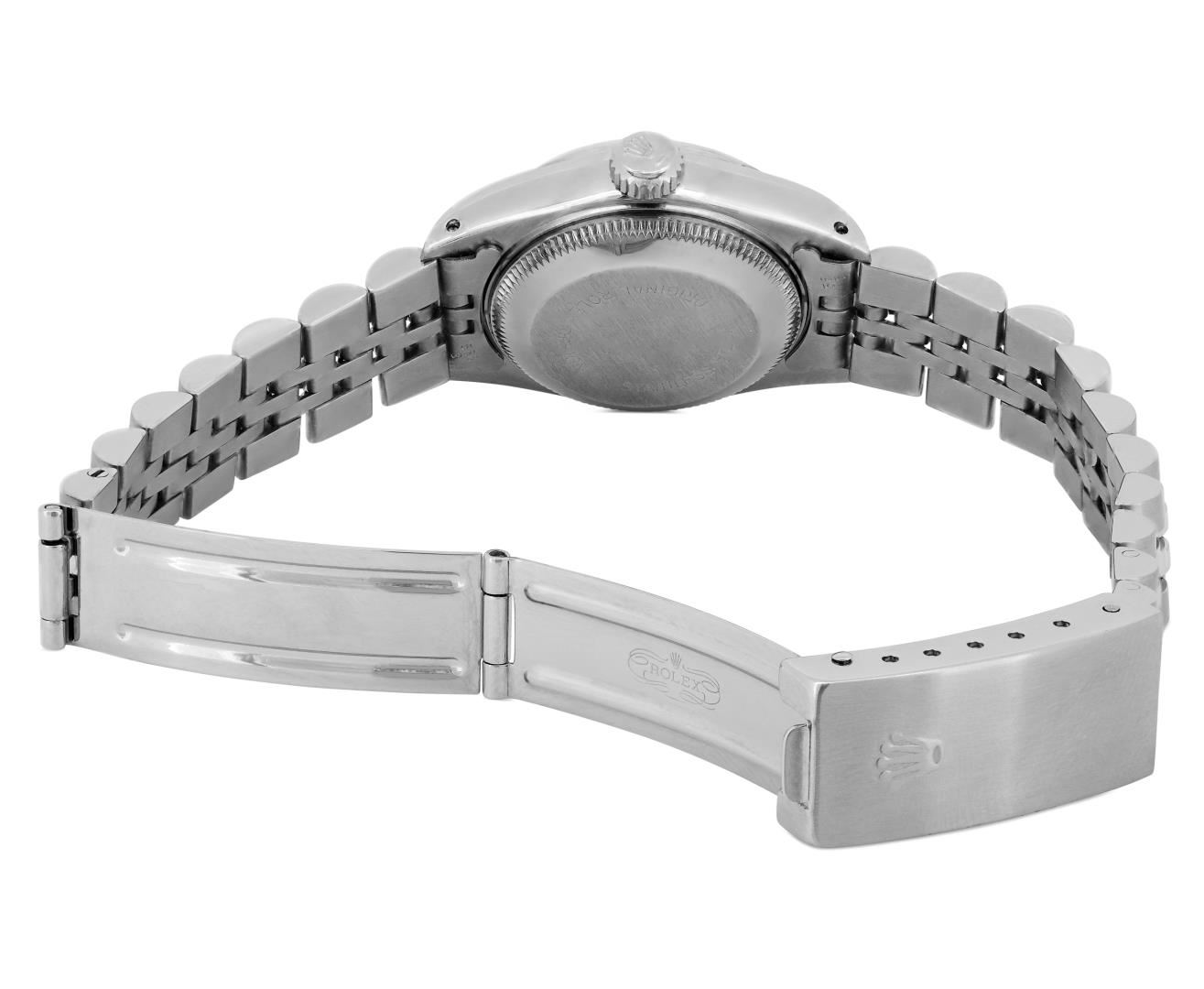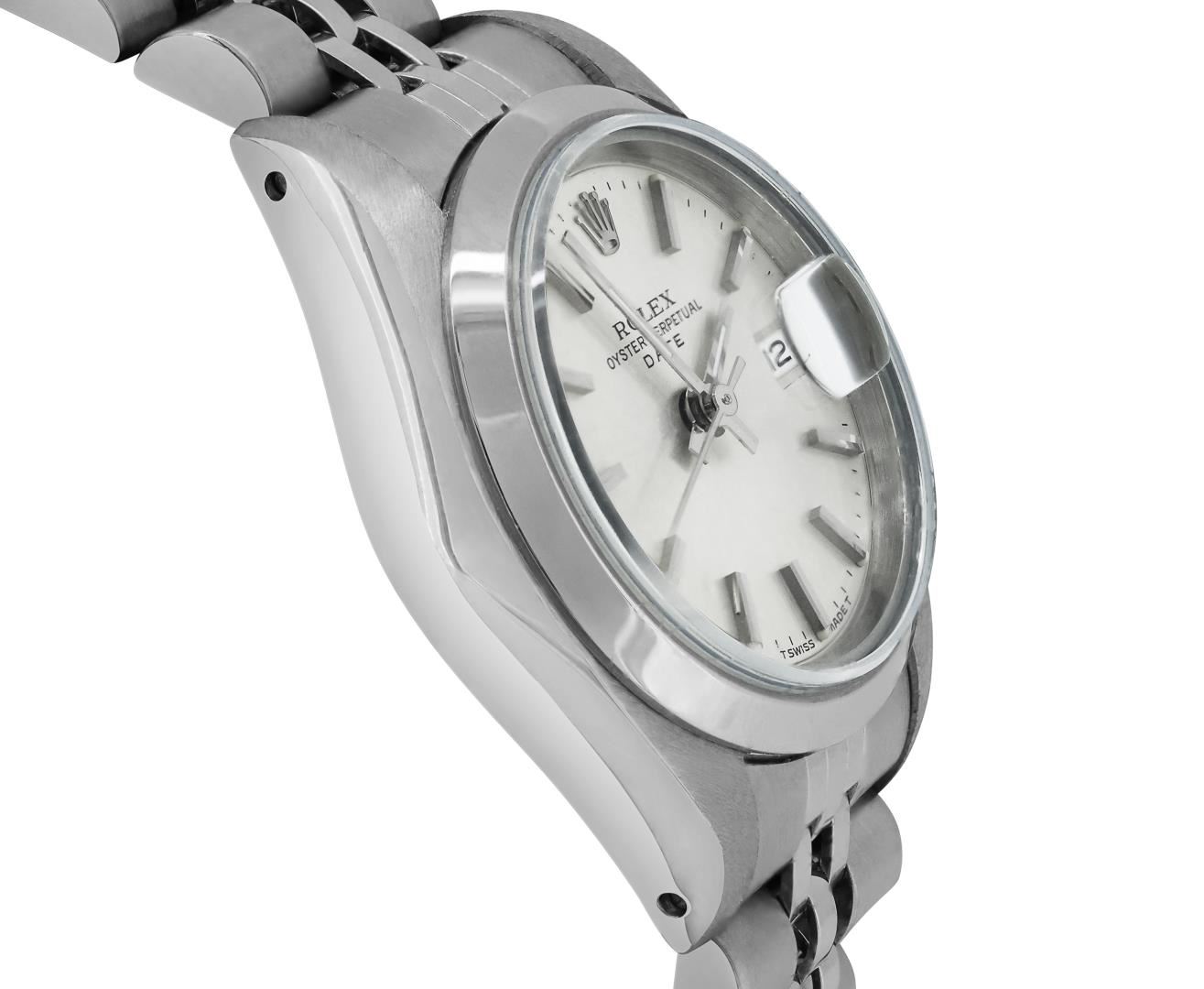 One Rolex Ladies Pre Owned Stainless Steel Date Wristwatch Polished Bright with Satin Finish, Serviced & Electronically Tested, Stainless Steel Case: 26mm, Stainless Steel Crown, Rolex Bezel: Rolex Stainless Steel Smooth bezel. Custom Crystal: New Sapphire With Magnified Date Window. Custom Hands: New Luminescent Hands. Rolex Movement: 2135 Automatic Winding Movement. Rolex Dial: Factory Silver Dial With Index Hour Markers, Lumi Dots and Dash Tracks. Date Window: 3 O'clock Position Date Display, Model: Quickset Date. Condition: G-6 Extra Fine. Rolex Bracelet: Stainless Steel Jubilee Band. Bright Polish & Satin Finish. 6.0 Inch Length, Adjustable. Standard Clasp, With Rolex Logo. This Watch Has Been Serviced And Time Tested. It Is In Excellent Condition, Free Of All Scratches And Dents. This Watch Comes With A Rolex Box.