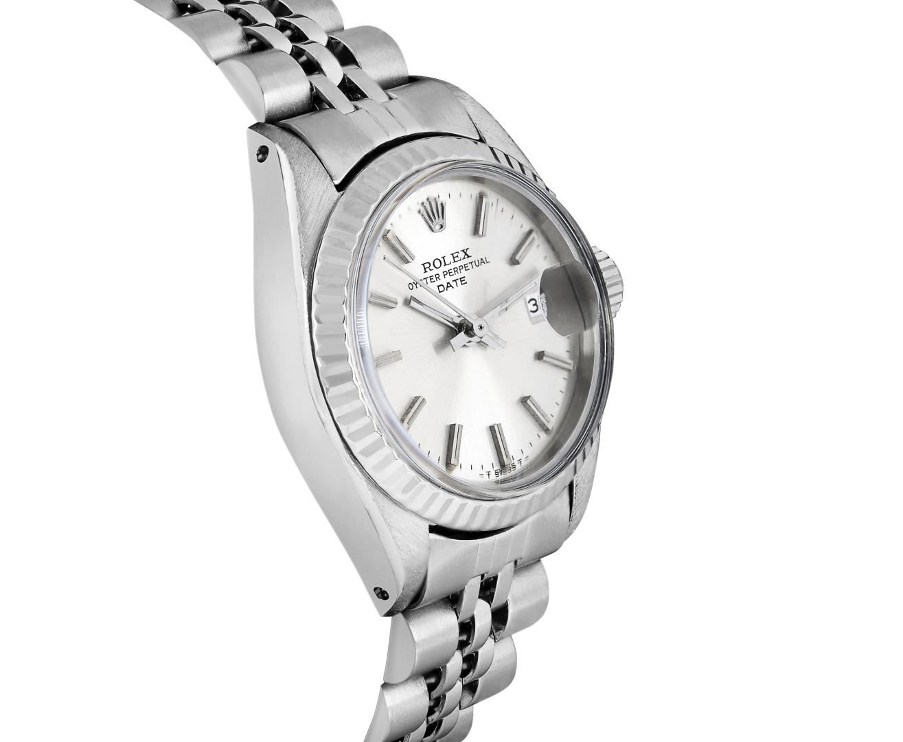 One Rolex Ladies Pre Owned Stainless Steel Date Wristwatch Polished Bright with Satin Finish, Serviced & Electronically Tested, Stainless Steel Case: 26mm, Stainless Steel Crown, 14K White Gold Fluted Bezel, Custom Crystal: New Acrylic With Magnifying Date Window. Custom Hands: New Luminescent Hands. Rolex Movement: Automatic Winding Movement 2035. Rolex Dial: Factory Silver With Index Hour Markers And Lumi Dots. Date Window: 3 O'clock Position Date Display, Model: Date. Condition: G-6 Extra Fine. Rolex Bracelet: Stainless Steel Jubilee Band. Bright Polish & Satin Finish. 6.0 Inch Length, Adjustable. Standard Clasp, With Rolex Logo. This Watch Has Been Serviced Time Tested And Is In Excellent Condition. It Is Free Of All Scratches And Dents. This Watch Comes With A Rolex Box.