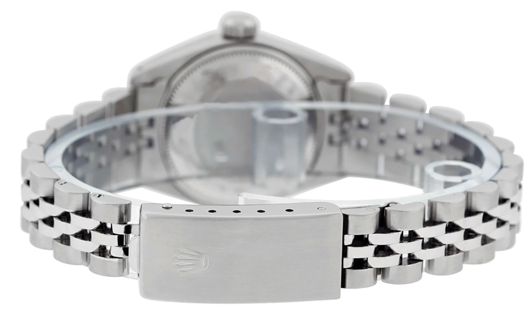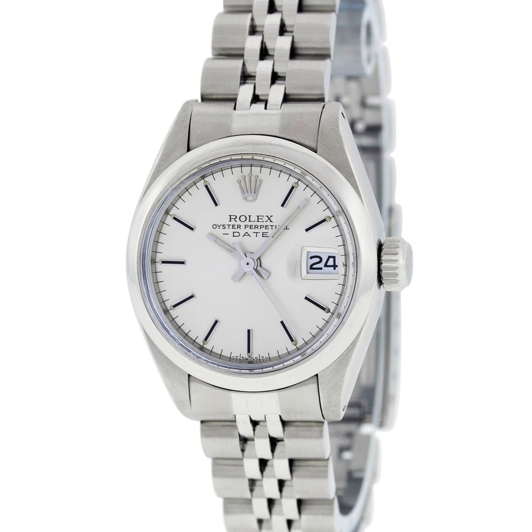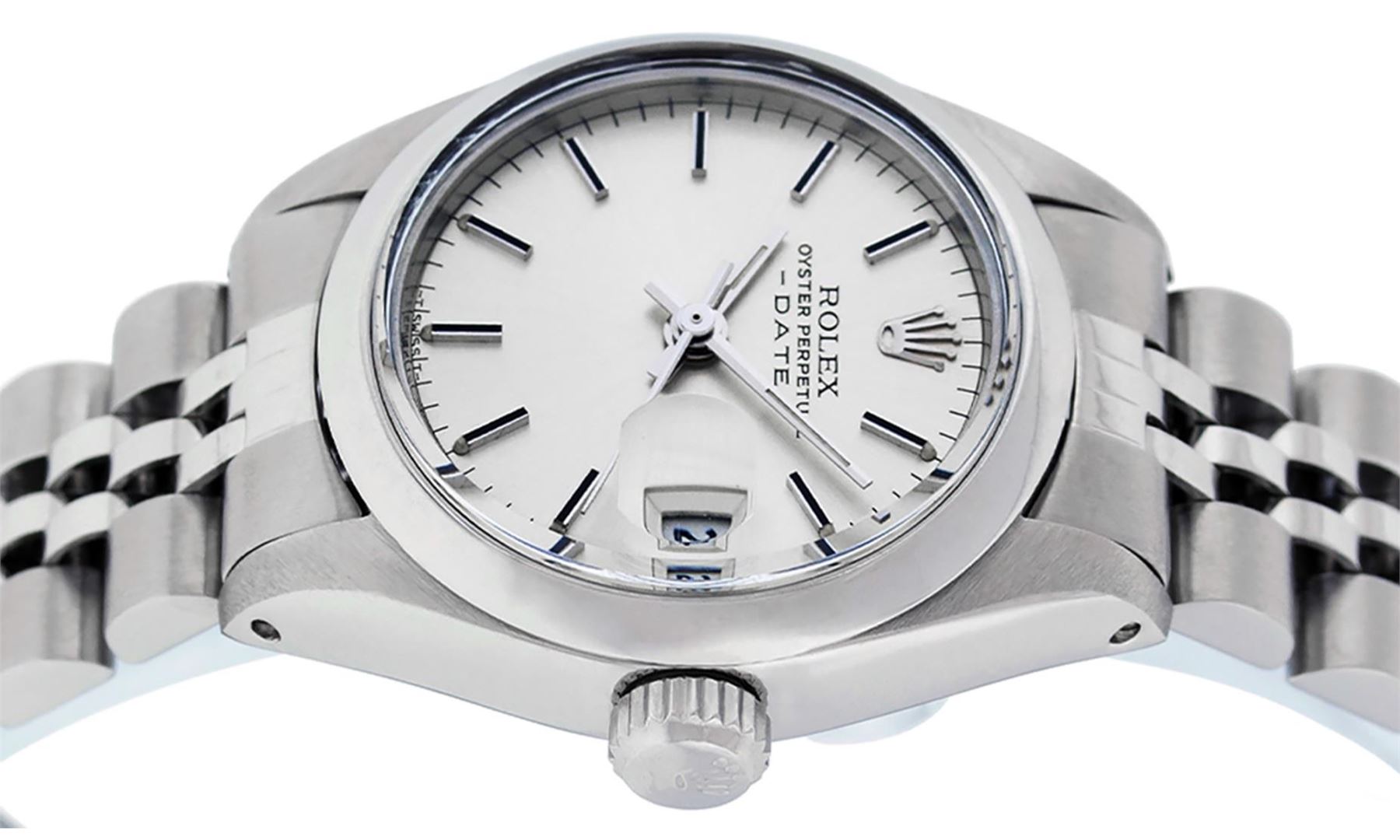 One Ladies Pre Owned Stainless Steel Rolex Date Polished Bright with Satin Finish, Serviced & Electronically Tested, Rolex Stainless Steel Case: 26mm, Rolex Stainless Steel Crown, Rolex Bezel: Stainless Steel Smooth Bezel. Custom Crystal: New Acrylic With Magnified Date Window. Custom Hands: New Luminescent Hands. Rolex Movement: Automatic Winding Movement. Rolex Dial: Silver Index Dial With Luminescent Dots And Dash Track. Date Window: 3 O'Clock Position Date Display, Model: Date. Condition: G-6 Extra Fine. Rolex Bracelet: Stainless Steel Jubilee Band. Bright Polish & Satin Finish. 6.0 Inch Length, Adjustable. Standard Clasp, With Rolex Logo. This Watch Has Been Serviced Time Tested And Is In Excellent Condition It Is Free Of All Scratches And Dents.