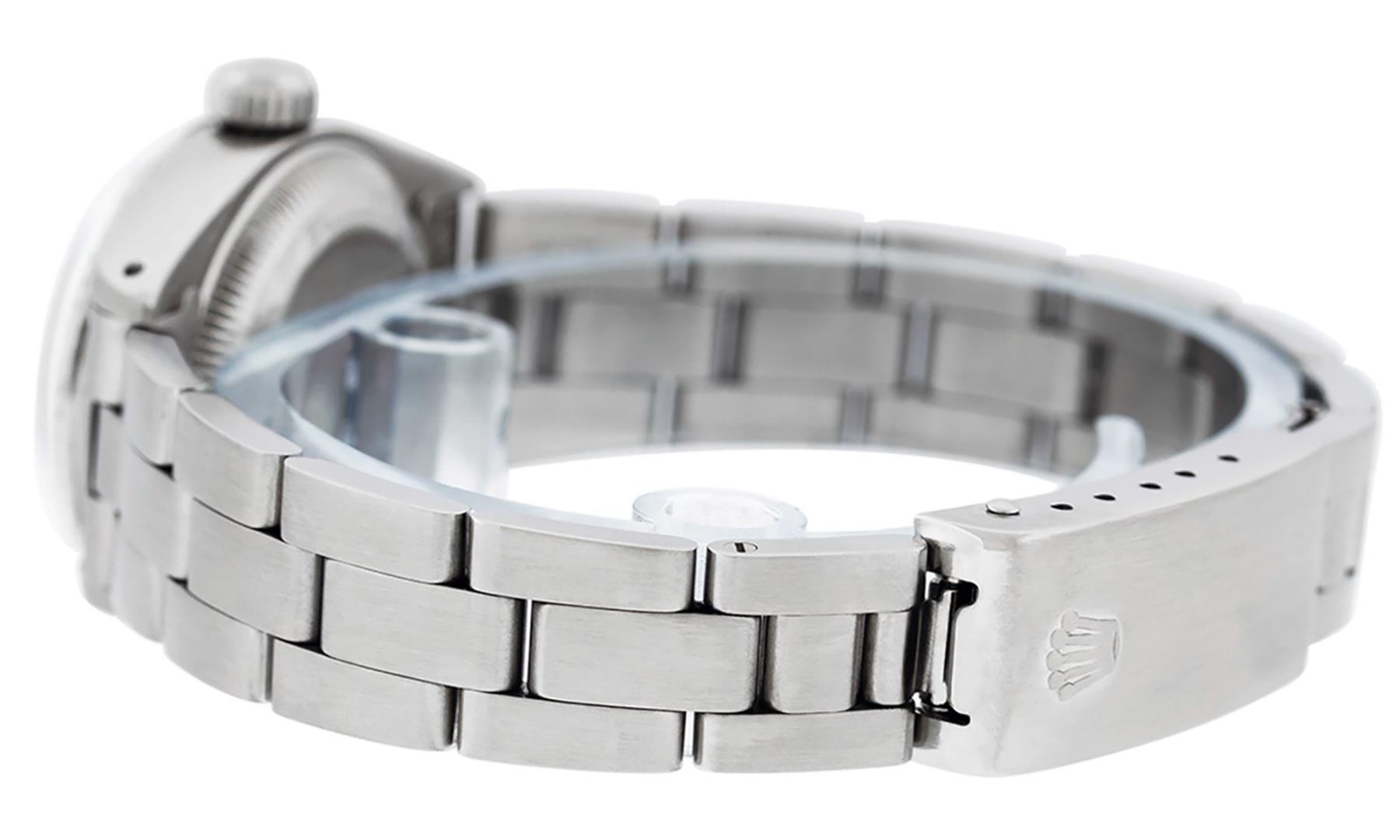 One Ladies Pre Owned Stainless Steel Rolex Polished Bright with Satin Finish, Serviced & Electronically Tested, Stainless Steel Case: 26mm, Stainless Steel Crown, Bezel: 14K White Gold Fluted Bezel. Custom Crystal: New Acrylic With Date Window. Custom Hands: New Luminescent Hands. Rolex Movement: Automatic Winding Movement. Rolex Dial: Silver Index With Dash Track. Date Window: 3 O'Clock Position Date Display, Model: Date. Condition: G-6 Extra Fine. Rolex Bracelet: Stainless Steel Oyster Band. Bright Polish & Satin Finish. 6.0 Inch Length, Adjustable. Standard Clasp, With Rolex Logo. This Watch Has Been Serviced Time Tested And Is In Excellent Condition It Is Free Of All Scratches And Dents.