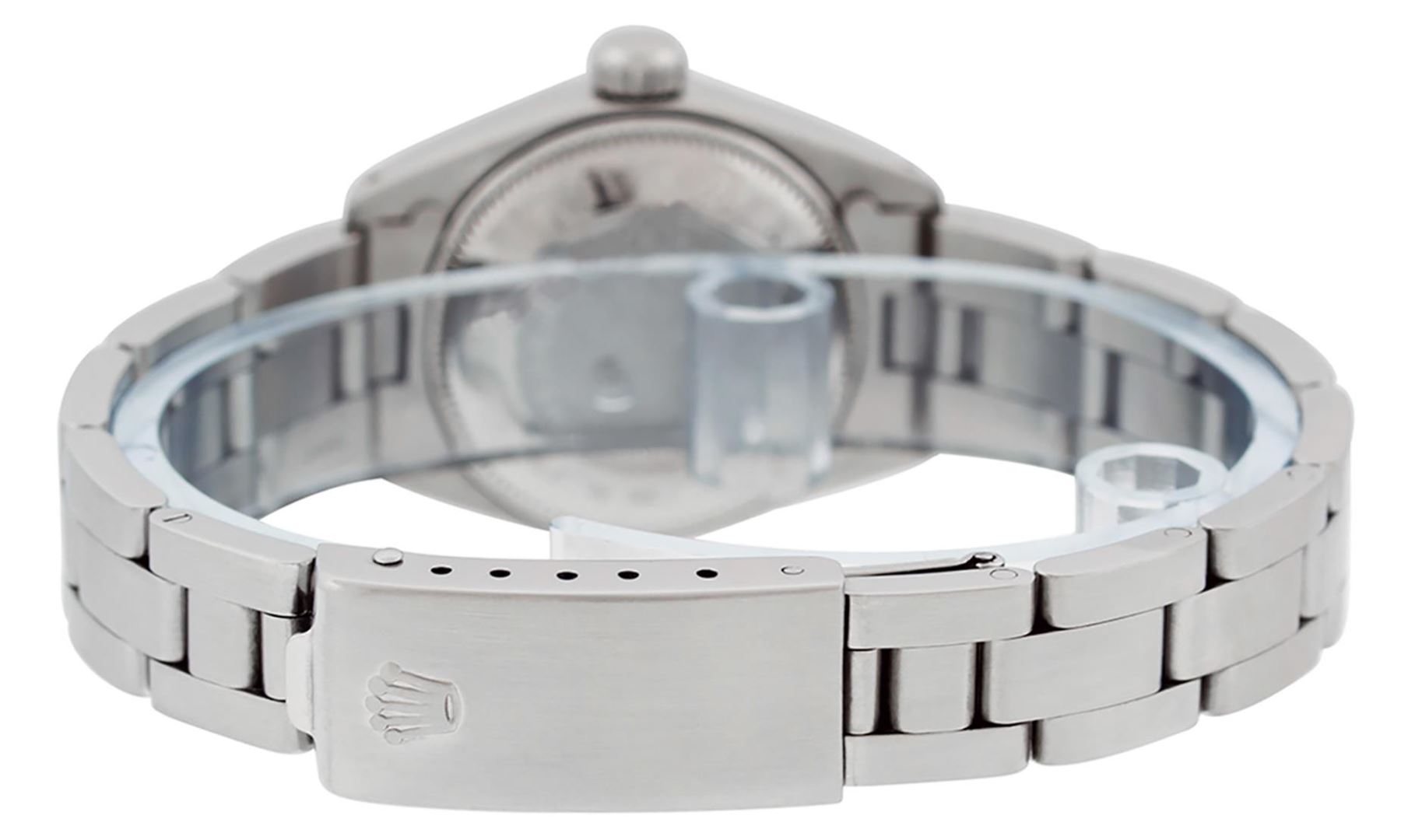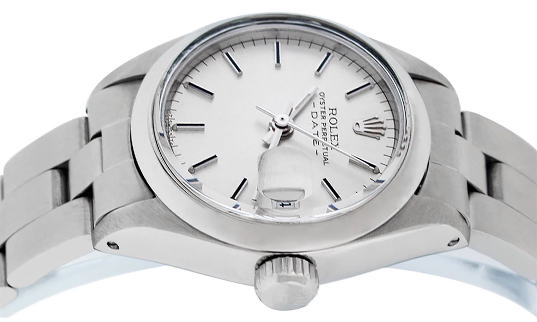 One Ladies Stainless Pre Owned Steel Rolex Polished Bright with Satin Finish, Serviced & Electronically Tested, Stainless Steel Case: 26mm, Stainless Steel Crown, Rolex Bezel: Stainless Steel Smooth Bezel. Custom Crystal: New Plastic With Date Window. Custom Hands: New Luminescent Hands. Rolex Movement: Automatic Winding Movement. Rolex Dial: Silver Index Dial With Dash Track. Date Window: 3 O'Clock Position Date Display, Model: Date. Condition: G-6 Extra Fine. Rolex Bracelet: Stainless Steel Oyster Band. Bright Polish & Satin Finish. 6.0 Inch Length, Adjustable. Standard Clasp, With Rolex Logo. This Watch Has Been Serviced Time Tested And Is In Excellent Condition It Is Free Of All Scratches And Dents.