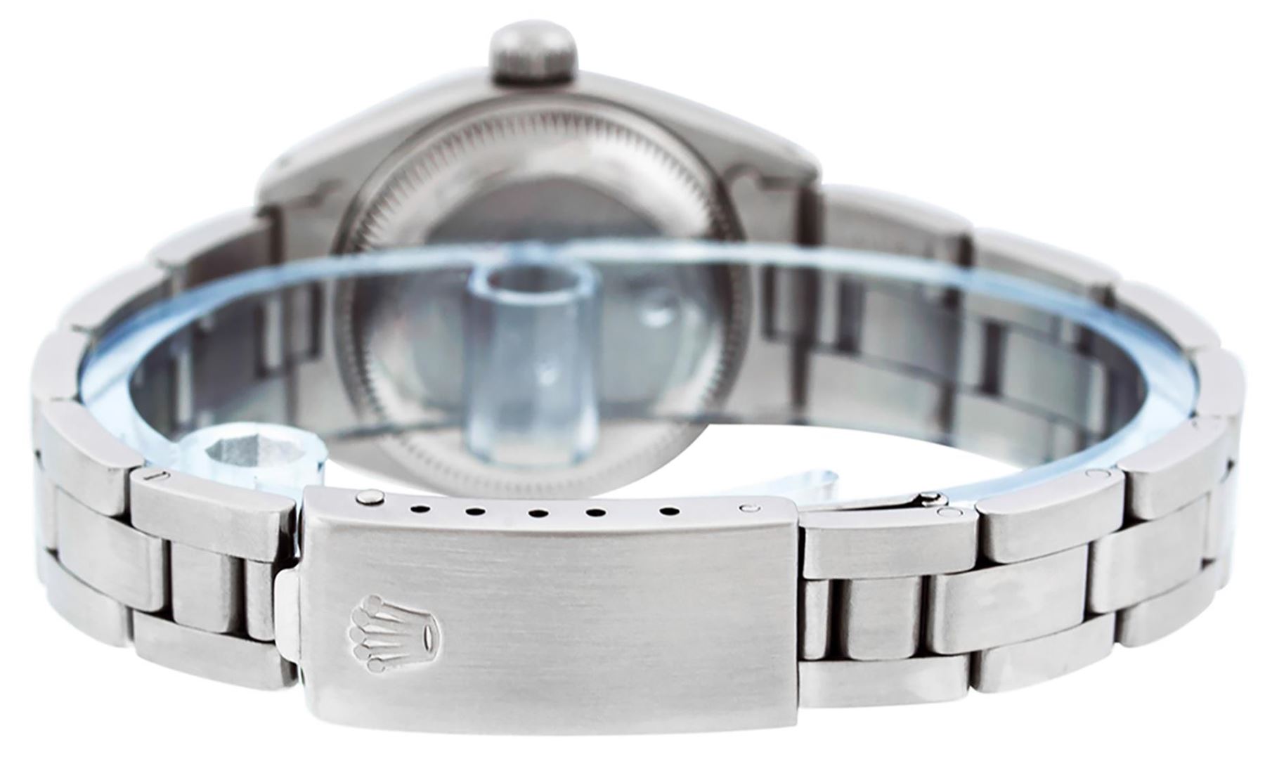 One Ladies Pre Owned Stainless Steel Rolex Polished Bright with Satin Finish, Serviced & Electronically Tested, Stainless Steel Case: 26mm, Stainless Steel Crown, Bezel: 14K White Gold Fluted Bezel. Custom Crystal: New Acrylic With Date Window. Custom Hands: New Luminescent Hands. Rolex Movement: Automatic Winding Movement. Rolex Dial: Silver Index With Dash Track. Date Window: 3 O'Clock Position Date Display, Model: Date. Condition: G-6 Extra Fine. Rolex Bracelet: Stainless Steel Oyster Band. Bright Polish & Satin Finish. 6.0 Inch Length, Adjustable. Standard Clasp, With Rolex Logo. This Watch Has Been Serviced Time Tested And Is In Excellent Condition It Is Free Of All Scratches And Dents.