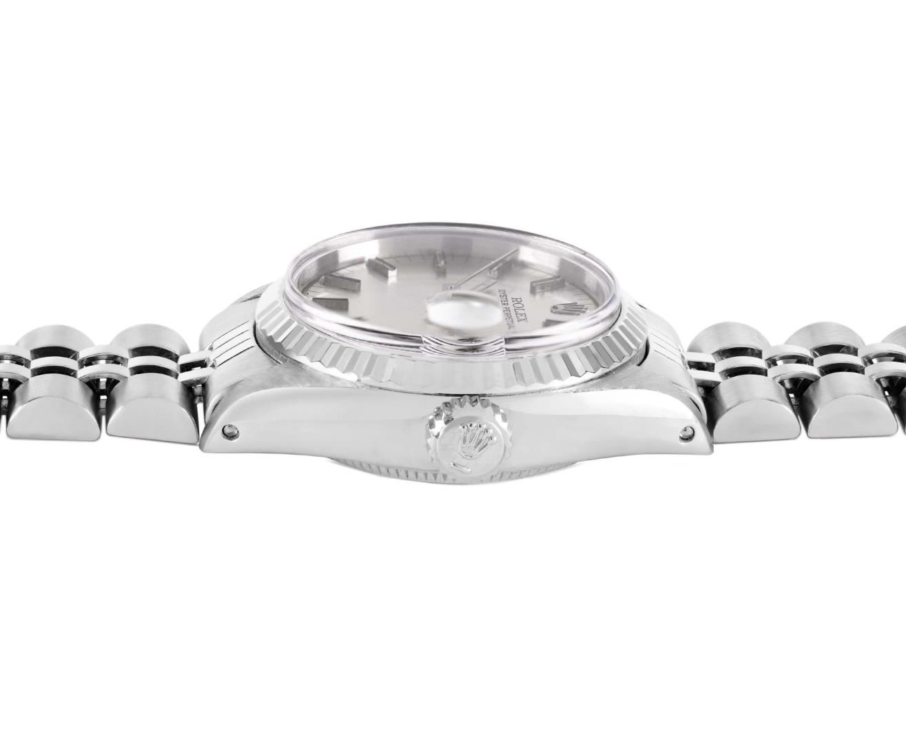 One Rolex Ladies Pre Owned Stainless Steel Date Wristwatch Polished Bright with Satin Finish, Serviced & Electronically Tested, Stainless Steel Case: 26mm, Stainless Steel Crown, 14K White Gold Fluted Bezel, Custom Crystal: New Acrylic With Magnifying Date Window. Custom Hands: New Luminescent Hands. Rolex Movement: Automatic Winding Movement 2030. Rolex Dial: Factory Silver With Index Hour Markers And Lumi Dots. Date Window: 3 O'Clock Position Date Display, Model: Date. Condition: G-6 Extra Fine. Rolex Bracelet: Stainless Steel Jubilee Band. Bright Polish & Satin Finish. 6.0 Inch Length, Adjustable. Standard Clasp, With Rolex Logo. This Watch Has Been Serviced Time Tested And Is In Excellent Condition. It Is Free Of All Scratches And Dents.