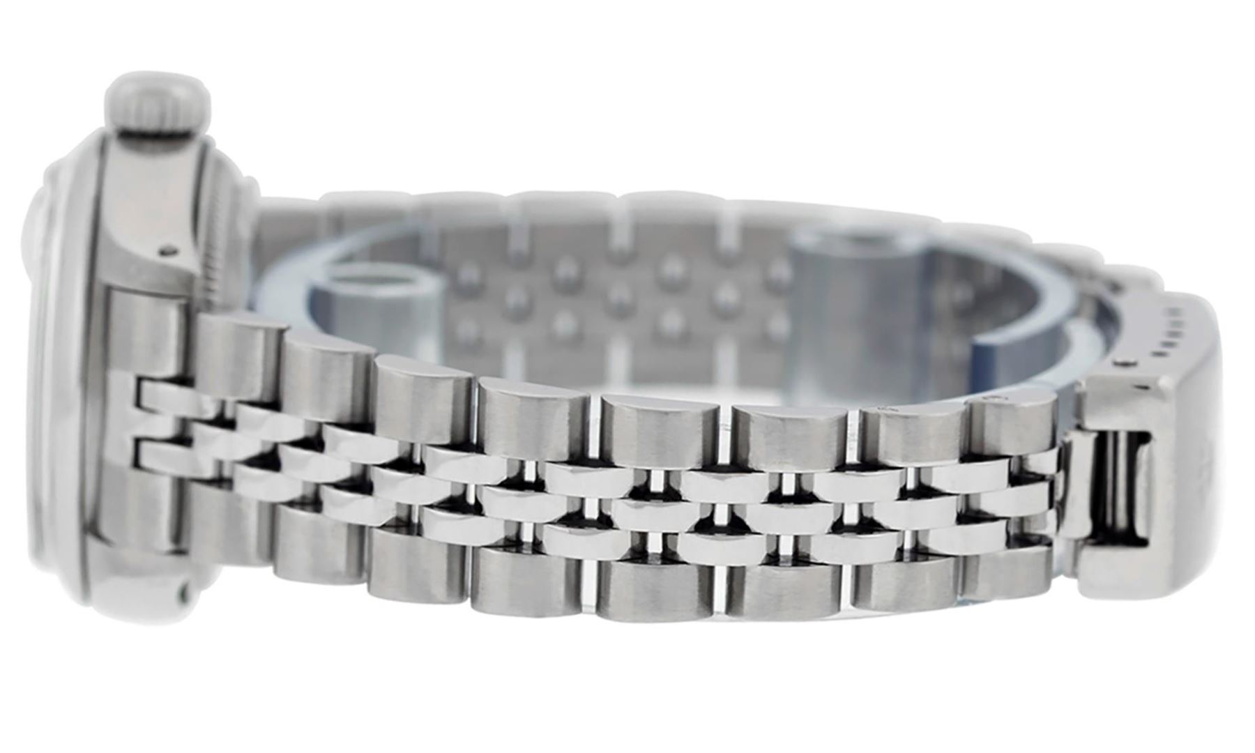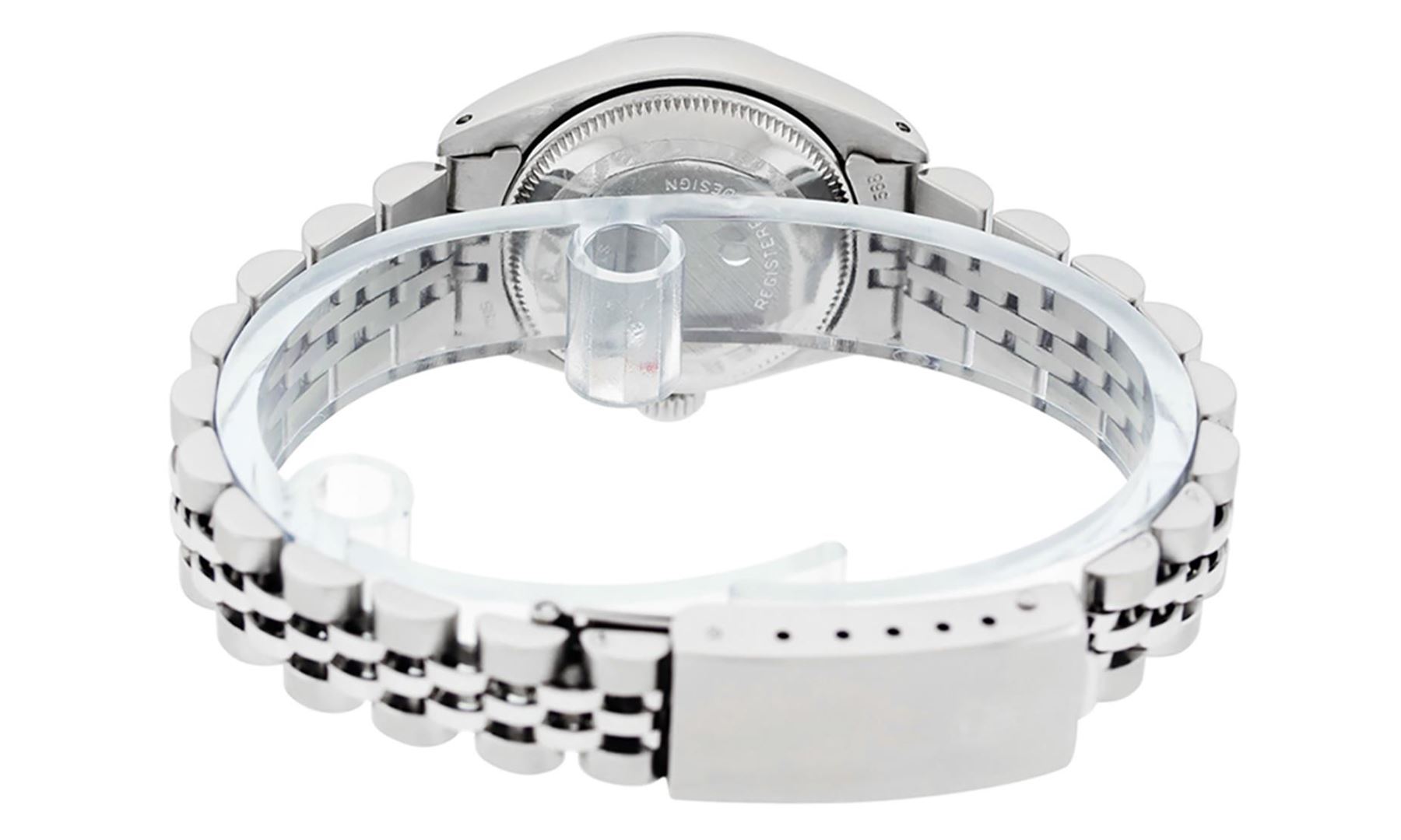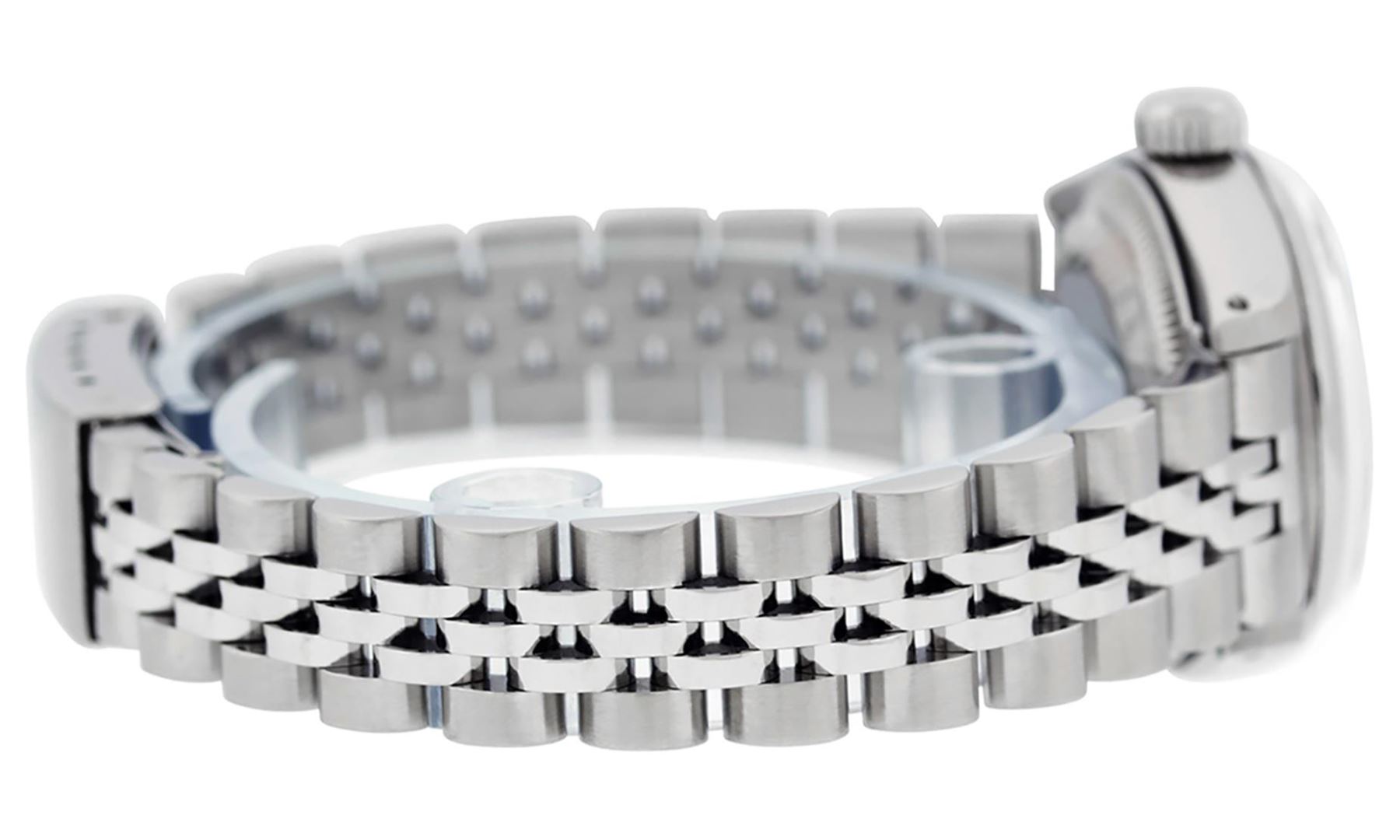 One Ladies Pre Owned Stainless Steel Rolex Date Polished Bright with Satin Finish, Serviced & Electronically Tested, Rolex Stainless Steel Case: 26mm, Rolex Stainless Steel Crown, Rolex Bezel: Stainless Steel Smooth Bezel. Custom Crystal: New Acrylic With Magnified Date Window. Custom Hands: New Luminescent Hands. Rolex Movement: Automatic Winding Movement. Rolex Dial: Silver Index Dial With Luminescent Dots And Dash Track. Date Window: 3 O'Clock Position Date Display, Model: Date. Condition: G-6 Extra Fine. Rolex Bracelet: Stainless Steel Jubilee Band. Bright Polish & Satin Finish. 6.0 Inch Length, Adjustable. Standard Clasp, With Rolex Logo. This Watch Has Been Serviced Time Tested And Is In Excellent Condition It Is Free Of All Scratches And Dents.