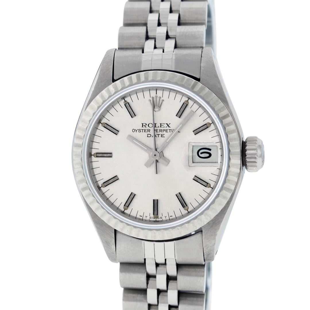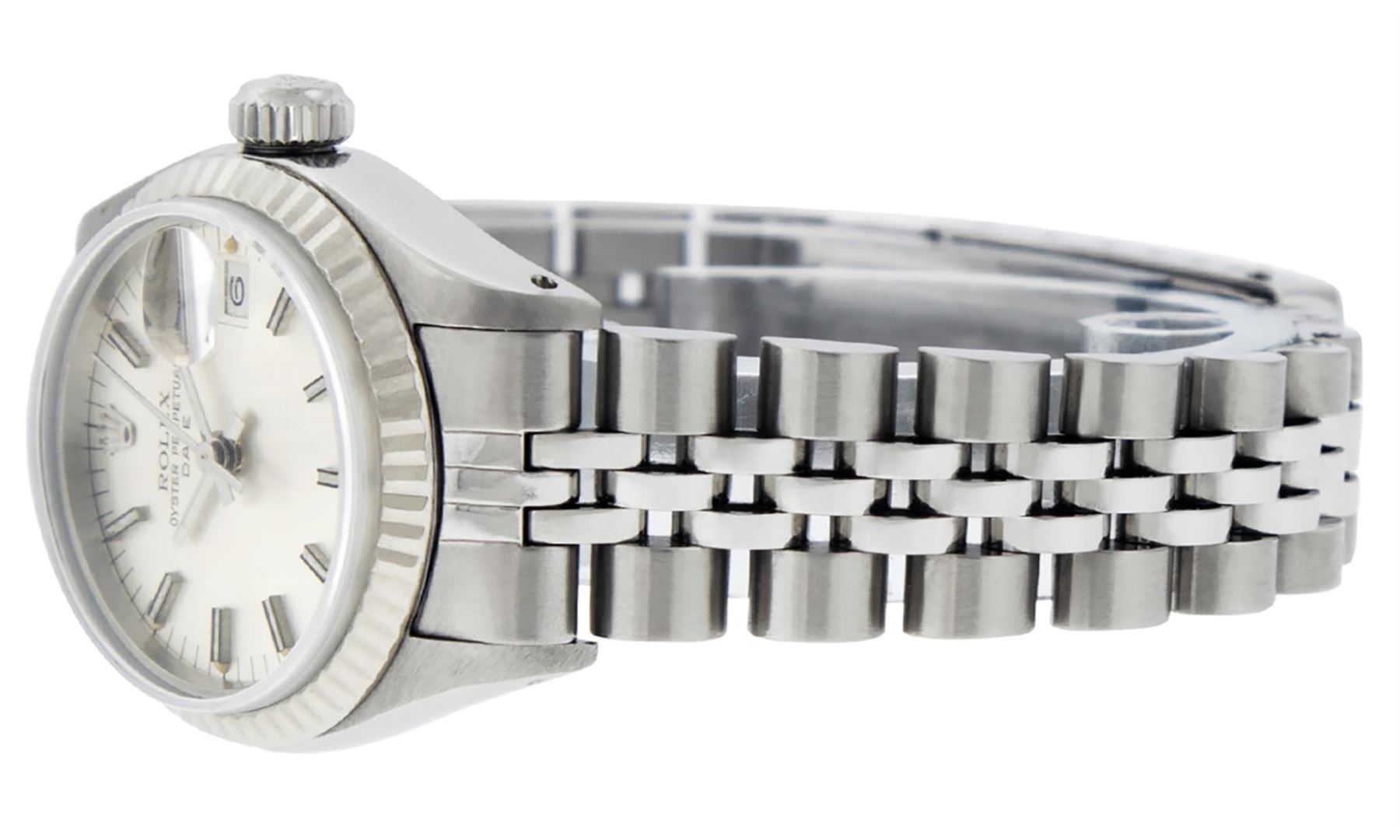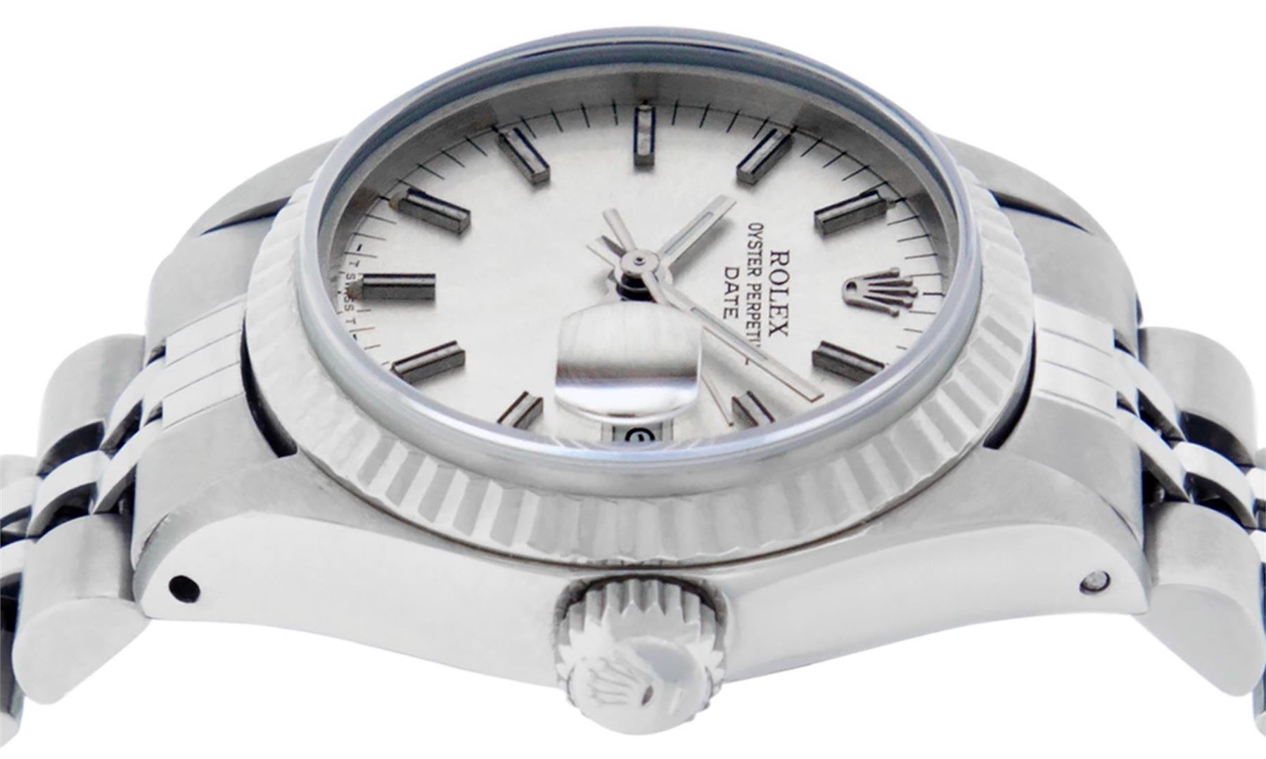 One Ladies Pre Owned Stainless Steel Rolex Datejust Polished Bright with Satin Finish, Serviced & Electronically Tested, Rolex Stainless Steel Case: 26mm, Rolex Stainless Steel Crown, Rolex Bezel: 14K White Gold Bezel. Custom Crystal: New Acrylic Cyclops Lens. Hands: Luminescent Hands. Rolex Movement: Automatic Winding Movement. Rolex Dial: Silver Index Dial. Date Window: 3 O'Clock Position Date Display, Model: Datejust. Condition: G-6 Extra Fine. Rolex Bracelet: Stainless Steel Jubilee Band. Bright Polish & Satin Finish. 6.0 Inch Length, Adjustable. Standard Clasp, With Rolex Logo. This Watch Has Been Serviced Time Tested And Is In Excellent Condition It Is Free Of All Scratches And Dents.