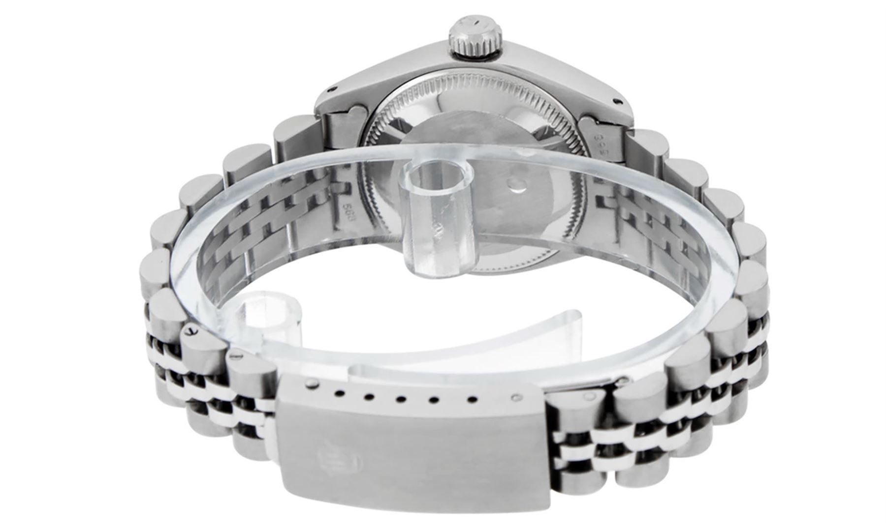 One Ladies Pre Owned Stainless Steel Rolex Datejust Polished Bright with Satin Finish, Serviced & Electronically Tested, Rolex Stainless Steel Case: 26mm, Rolex Stainless Steel Crown, Rolex Bezel: 14K White Gold Bezel. Custom Crystal: New Acrylic Cyclops Lens. Hands: Luminescent Hands. Rolex Movement: Automatic Winding Movement. Rolex Dial: Silver Index Dial. Date Window: 3 O'Clock Position Date Display, Model: Datejust. Condition: G-6 Extra Fine. Rolex Bracelet: Stainless Steel Jubilee Band. Bright Polish & Satin Finish. 6.0 Inch Length, Adjustable. Standard Clasp, With Rolex Logo. This Watch Has Been Serviced Time Tested And Is In Excellent Condition It Is Free Of All Scratches And Dents.