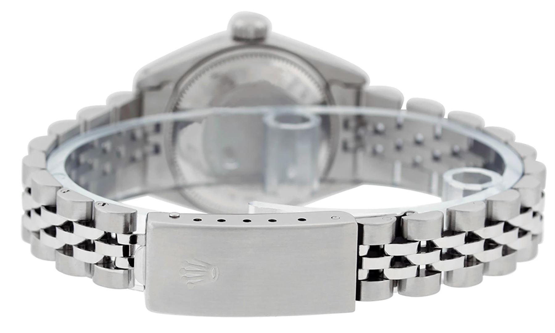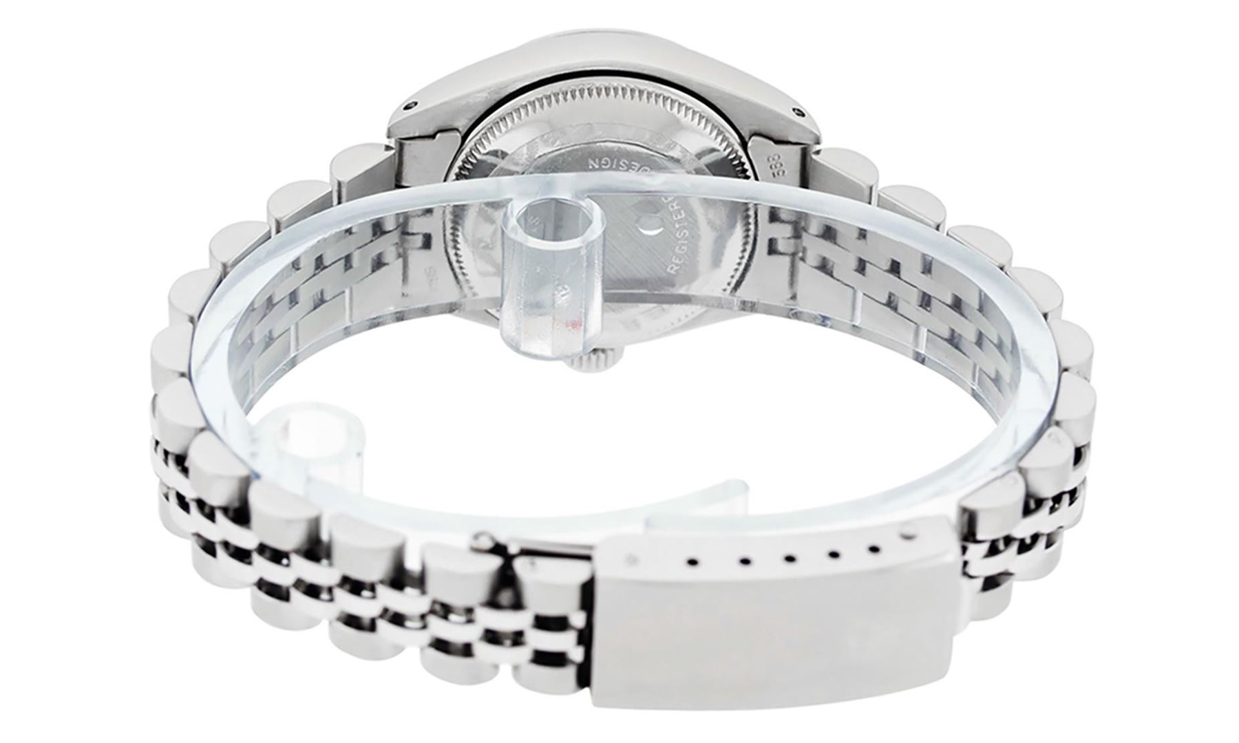 One Ladies Pre Owned Stainless Steel Rolex Datejust Polished Bright with Satin Finish, Serviced & Electronically Tested, Rolex Stainless Steel Case: 26mm, Rolex Stainless Steel Crown, Rolex Bezel: Stainless Steel Smooth Bezel. Custom Crystal: New Acrylic Cyclops Lens. Hands: Luminescent Hands. Rolex Movement: Automatic Winding Movement. Rolex Dial: Silver Index Dial With Luminescent Dots. Date Window: 3 O'Clock Position Date Display, Model: Datejust. Condition: G-6 Extra Fine. Rolex Bracelet: Stainless Steel Jubilee Band. Bright Polish & Satin Finish. 6.0 Inch Length, Adjustable. Standard Clasp, With Rolex Logo. This Watch Has Been Serviced Time Tested And Is In Excellent Condition It Is Free Of All Scratches And Dents.