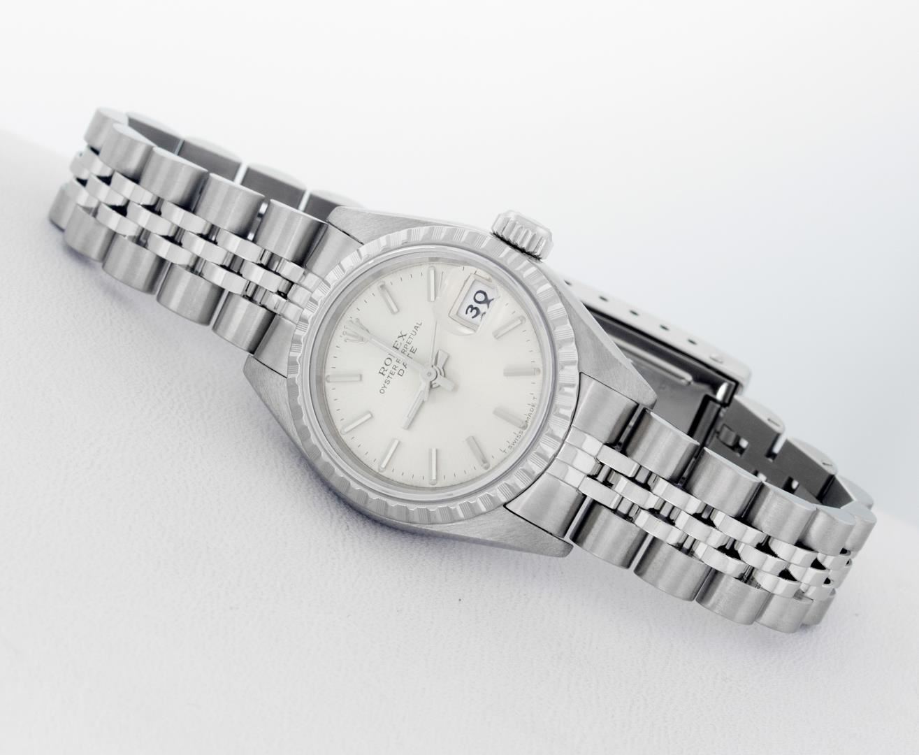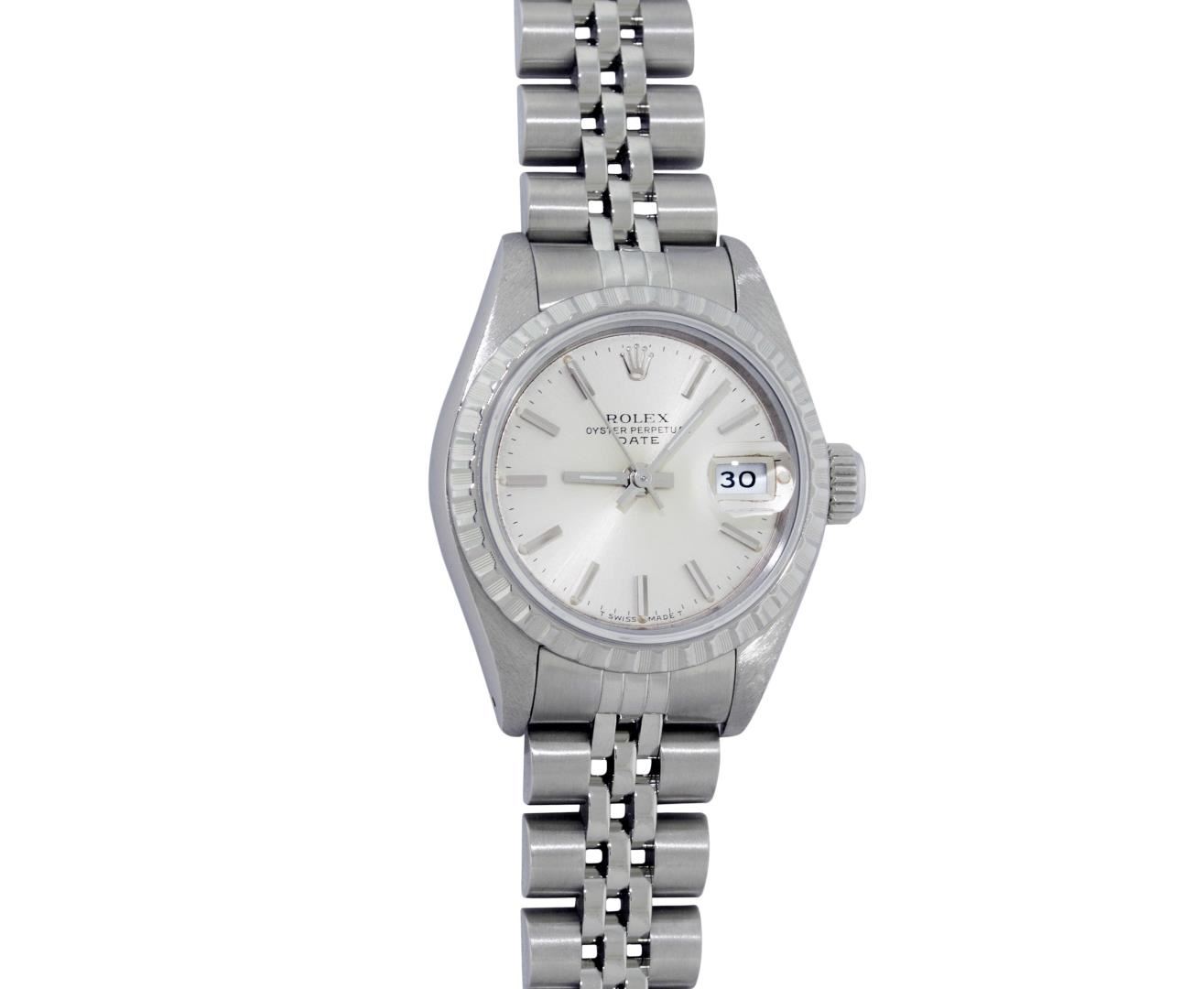 One Ladies Pre Owned Quickset Stainless Steel Rolex Datejust Polished Bright with Satin Finish, Serviced & Electronically Tested, Rolex Stainless Steel Case: 26mm, Rolex Stainless Steel Crown, Rolex Bezel: Stainless Steel Engine Turn Bezel. Custom Crystal: Sapphire With Magnified Date Window. Hands: Luminescent Hands. Rolex Movement: Quickset Automatic Winding Movement. Rolex Dial: Silver Index Dial With Luminescent Dots & Dash Track. Date Window: 3 O'Clock Position Date Display, Model: Sapphire Quickset Datejust Caliber 2130. Condition: G-6 Extra Fine. Rolex Bracelet: Stainless Steel Jubilee Band. Bright Polish & Satin Finish. 6.0 Inch Length, Adjustable. Standard Clasp, With Rolex Logo. This Watch Has Been Serviced Time Tested And Is In Excellent Condition It Is Free Of All Scratches And Dents.