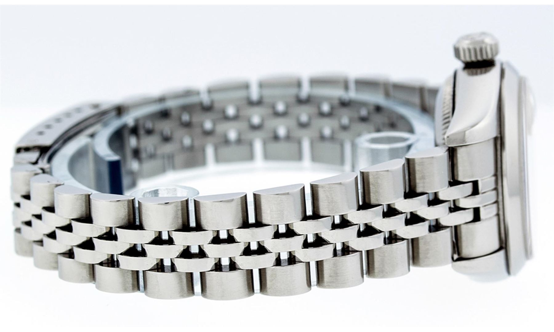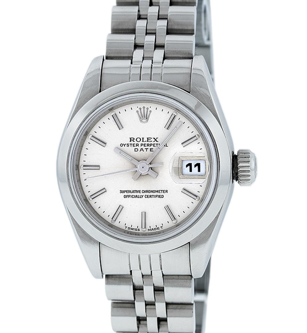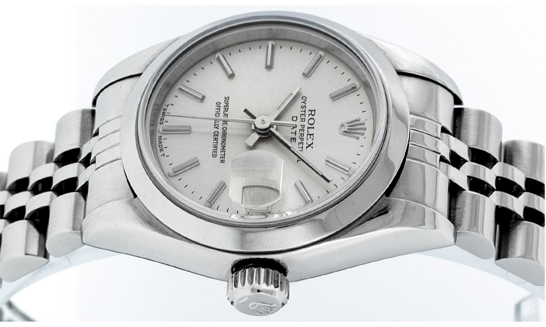 One Ladies Pre Owned Quickset Stainless Steel Rolex Date Polished Bright with Satin Finish, Serviced & Electronically Tested, Rolex Stainless Steel Case: 26mm, Rolex Stainless Steel Crown, Rolex Bezel: Stainless Steel Smooth Bezel. Crystal: Sapphire With Magnified Date Window. Hands: Luminescent Hands. Rolex Movement: Automatic Winding Movement 2230. Rolex Dial: Silver Index Dial With Luminescent Dots & Dash Track. Date Window: 3 O'Clock Position Date Display, Model: Quickset Datejust. Condition: G-6 Extra Fine. Rolex Bracelet: Stainless Steel Jubilee Band. Bright Polish & Satin Finish. 6.0 Inch Length, Adjustable. Standard Clasp, With Rolex Logo. This Watch Has Been Serviced Time Tested And Is In Excellent Condition It Is Free Of All Scratches And Dents.