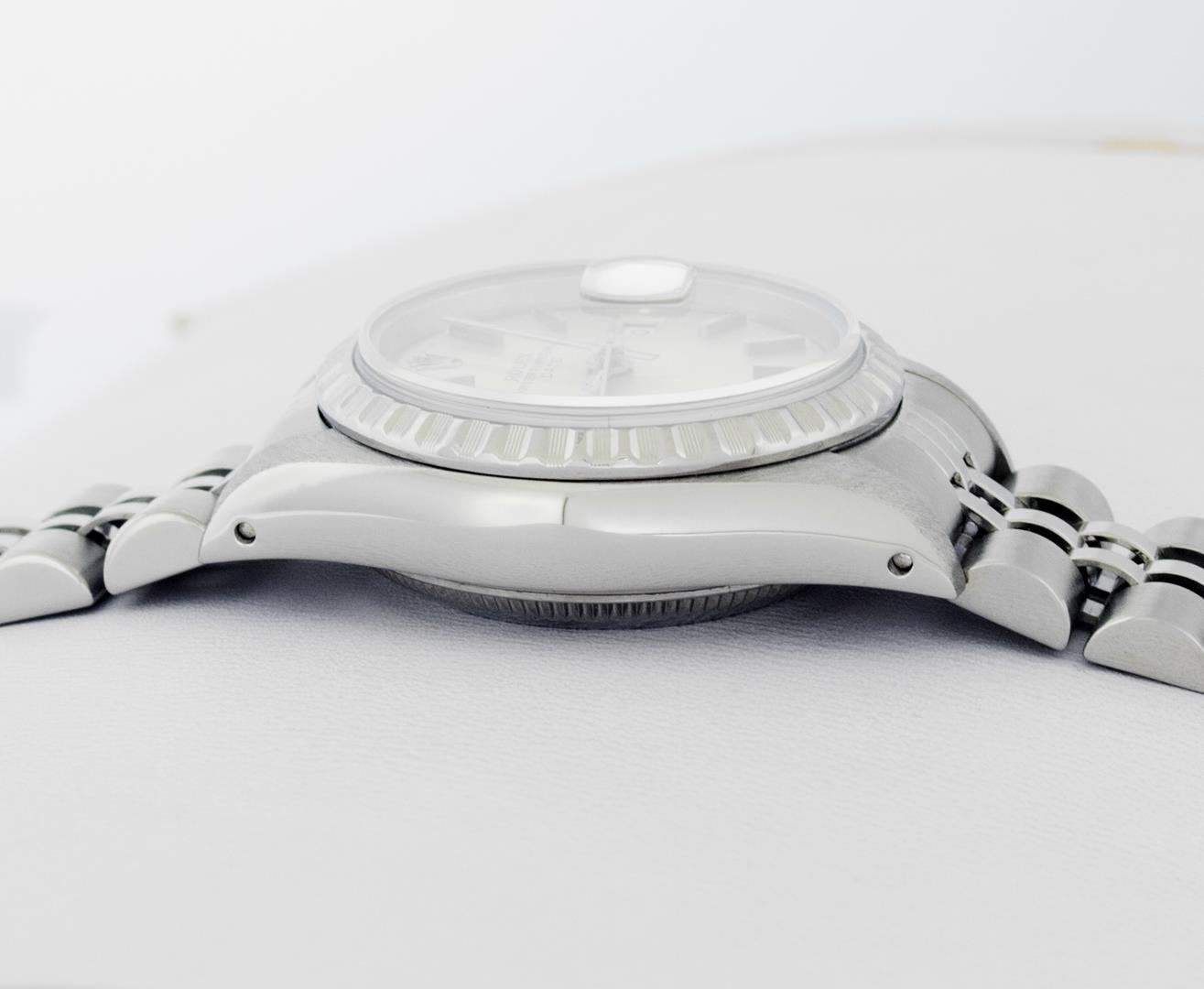 One Ladies Pre Owned Quickset Stainless Steel Rolex Datejust Polished Bright with Satin Finish, Serviced & Electronically Tested, Rolex Stainless Steel Case: 26mm, Rolex Stainless Steel Crown, Rolex Bezel: Stainless Steel Engine Turn Bezel. Custom Crystal: Sapphire With Magnified Date Window. Hands: Luminescent Hands. Rolex Movement: Quickset Automatic Winding Movement. Rolex Dial: Silver Index Dial With Luminescent Dots & Dash Track. Date Window: 3 O'Clock Position Date Display, Model: Sapphire Quickset Datejust Caliber 2130. Condition: G-6 Extra Fine. Rolex Bracelet: Stainless Steel Jubilee Band. Bright Polish & Satin Finish. 6.0 Inch Length, Adjustable. Standard Clasp, With Rolex Logo. This Watch Has Been Serviced Time Tested And Is In Excellent Condition It Is Free Of All Scratches And Dents.