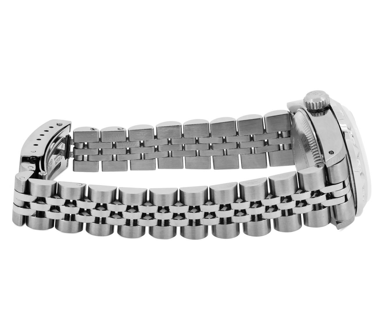 One Rolex Ladies Pre Owned Stainless Steel Date Wristwatch Polished Bright with Satin Finish, Serviced & Electronically Tested, Stainless Steel Case: 26mm, Stainless Steel Crown, Custom Bezel: New 18K White Gold Pyramid Diamond Bezel, Diamond Count: 24 Diamonds On Bezel. Total Weight .50 Carat, Clarity: SI-VS, Color: G to H. Custom Crystal: New Sapphire With Magnified Date Window. Custom Hands: New Luminescent Hands. Rolex Movement: Automatic Winding Movement 2030. Rolex Dial: Factory Silver With Index Hour Markers And Lumi Dots. Date Window: 3 O'Clock Position Date Display, Model: Date. Condition: G-6 Extra Fine. Rolex Bracelet: Stainless Steel Jubilee Band. Bright Polish & Satin Finish. 6.0 Inch Length, Adjustable. Standard Clasp, With Rolex Logo. This Watch Has Been Serviced Time Tested And Is In Excellent Condition It Is Free Of All Scratches And Dents. This Watch Comes With A Rolex Box.