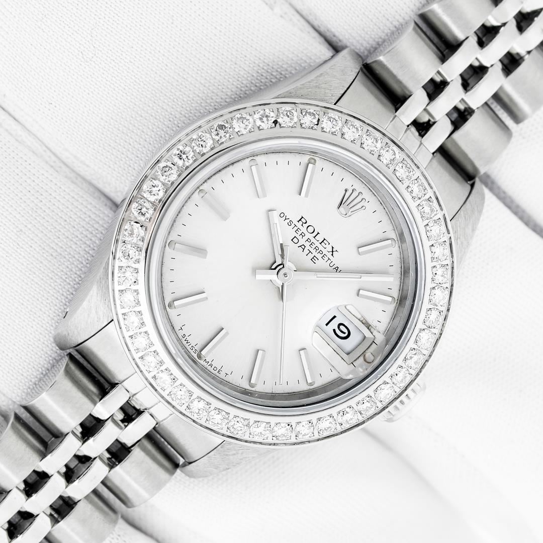 One Ladies Pre Owned Stainless Steel Rolex Date Polished Bright with Satin Finish Serviced & Electronically Tested, Rolex Stainless Steel Case: 26mm, Rolex Stainless Steel Crown, Custom Bezel: New Stainless Steel Beadset Diamond Bezel, Diamond Count: 40 Diamonds On Bezel Dial. Custom Crystal: New Sapphire With Date Window. Custom Hands: New Luminescent Hands. Rolex Movement: Automatic Winding Movement. Rolex Dial: Blue Index Dial With Dash Track And Lumi Dots. Date Window: 3 O'Clock Position Date Display, Model: Datejust. Condition: G-6 Extra Fine. Rolex Bracelet: Stainless Steel Jubilee Band With Rolex Crown On Buckle. Bright Polish & Satin Finish. Band Length: 6.0 Inch Length, Adjustable. Standard Clasp, With Rolex Logo. This Watch Has Been Serviced Time Tested And Is In Excellent Condition It Is Free Of All Scratches And Dents.