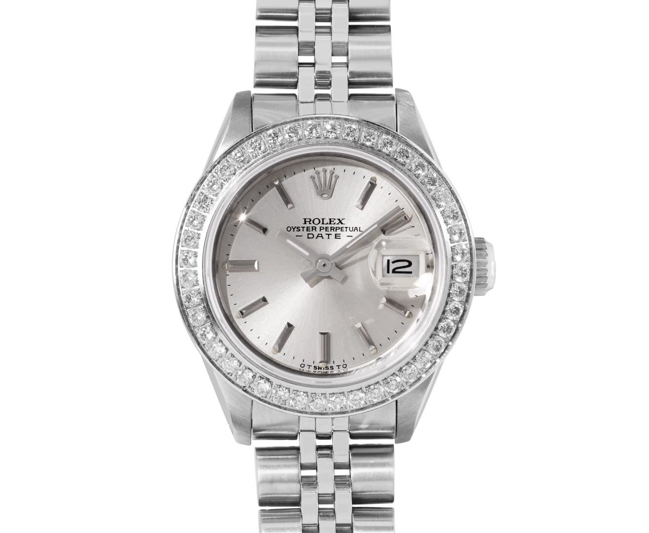 One Rolex Ladies Pre Owned Stainless Steel Date Wristwatch Polished Bright with Satin Finish, Serviced & Electronically Tested, Stainless Steel Case: 26mm, Stainless Steel Crown, Custom Bezel: New Stainless Steel Beadset Diamond Bezel, Diamond Count: 44 Diamonds, Total Weight .70 Carat, Clarity: SI-VS, Color: G to H. Custom Crystal: New Sapphire With Magnified Date Window. Custom Hands: New Luminescent Hands. Rolex Movement: Automatic Winding Movement 2030. Rolex Dial: Factory Silver Dial With Index Hour Markers and Lumi Markers, Dash Track, and Lumi Dots. Date Window: 3 O'Clock Position Date Display, Model: Date. Condition: G-6 Extra Fine. Rolex Bracelet: Stainless Steel Jubilee Band. Bright Polish & Satin Finish. 6.0 Inch Length, Adjustable. Standard Clasp, With Rolex Logo. This Watch Has Been Serviced Time Tested And Is In Excellent Condition. It Is Free Of All Scratches And Dents.