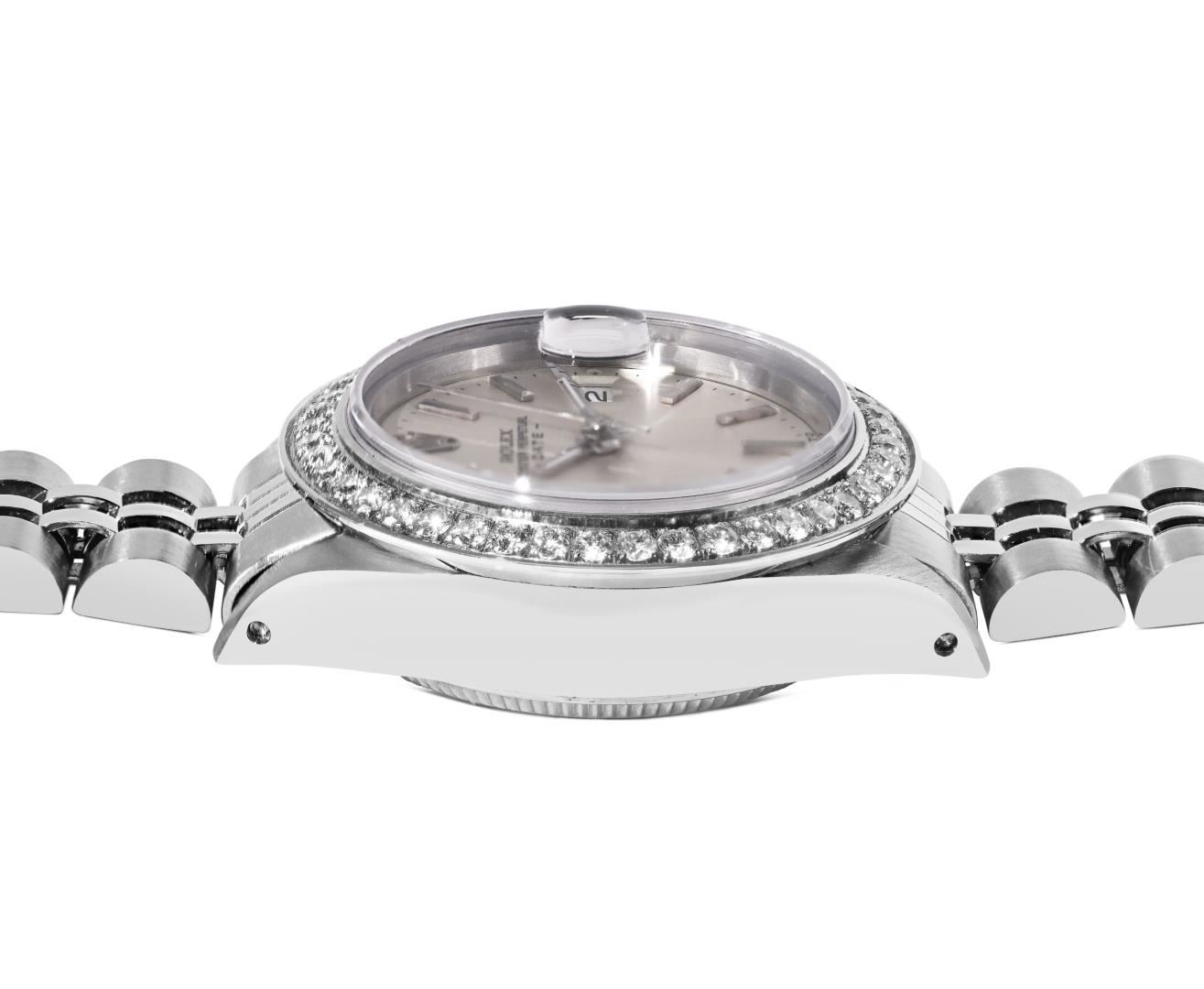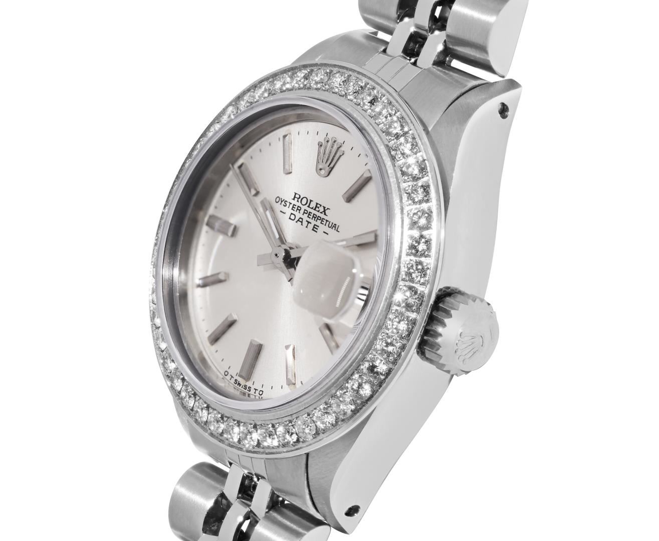 One Rolex Ladies Pre Owned Stainless Steel Date Wristwatch Polished Bright with Satin Finish, Serviced & Electronically Tested, Stainless Steel Case: 26mm, Stainless Steel Crown, Custom Bezel: New Stainless Steel Beadset Diamond Bezel, Diamond Count: 44 Diamonds, Total Weight .70 Carat, Clarity: SI-VS, Color: G to H. Custom Crystal: New Sapphire With Magnified Date Window. Custom Hands: New Luminescent Hands. Rolex Movement: Automatic Winding Movement 2030. Rolex Dial: Factory Silver Dial With Index Hour Markers and Lumi Markers, Dash Track, and Lumi Dots. Date Window: 3 O'Clock Position Date Display, Model: Date. Condition: G-6 Extra Fine. Rolex Bracelet: Stainless Steel Jubilee Band. Bright Polish & Satin Finish. 6.0 Inch Length, Adjustable. Standard Clasp, With Rolex Logo. This Watch Has Been Serviced Time Tested And Is In Excellent Condition. It Is Free Of All Scratches And Dents.