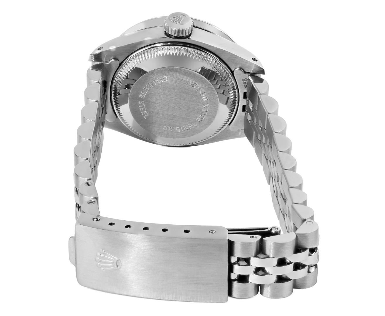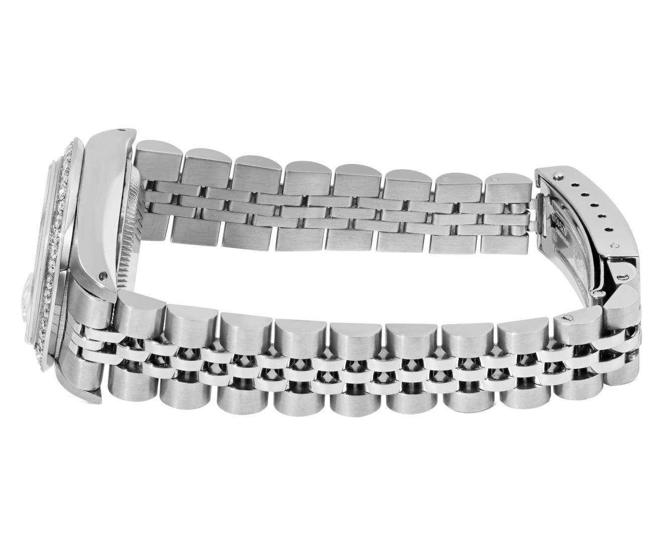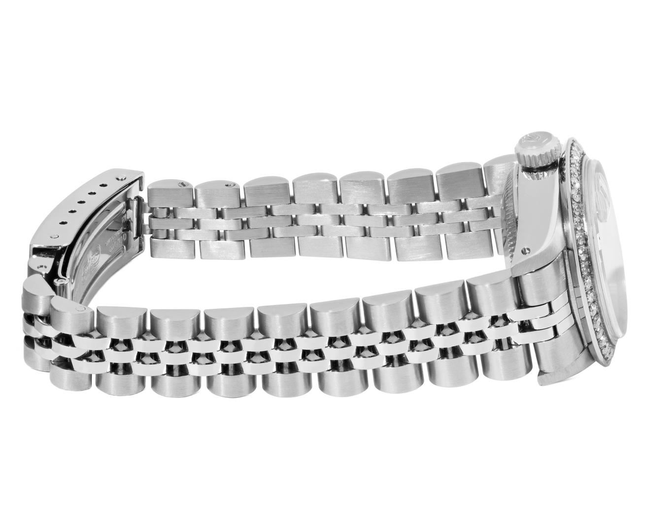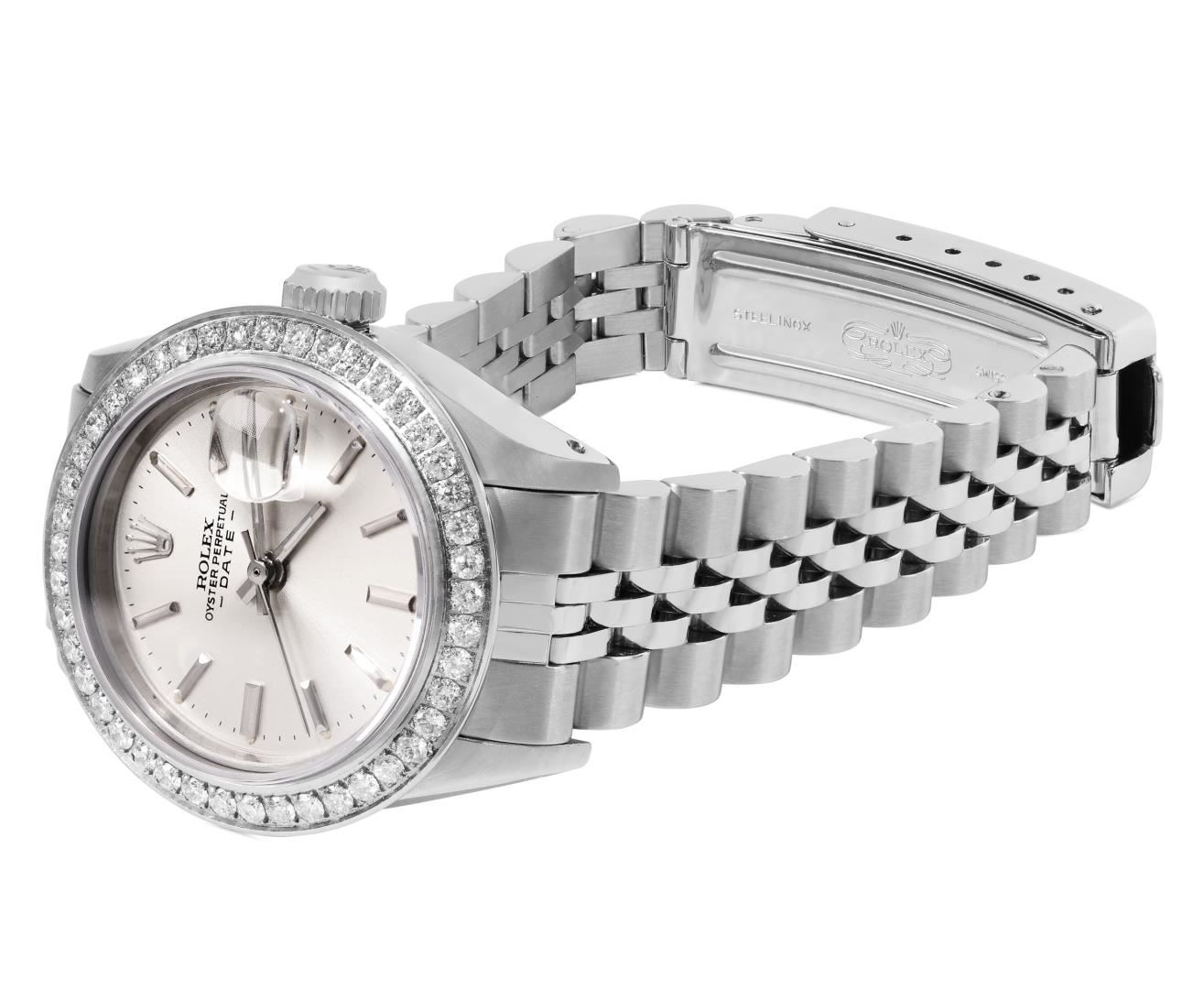 One Rolex Ladies Pre Owned Stainless Steel Date Wristwatch Polished Bright with Satin Finish, Serviced & Electronically Tested, Stainless Steel Case: 26mm, Stainless Steel Crown, Custom Bezel: New Stainless Steel Beadset Diamond Bezel, Diamond Count: 44 Diamonds, Total Weight .70 Carat, Clarity: SI-VS, Color: G to H. Custom Crystal: New Sapphire With Magnified Date Window. Custom Hands: New Luminescent Hands. Rolex Movement: Automatic Winding Movement 2030. Rolex Dial: Factory Silver Dial With Index Hour Markers and Lumi Markers, Dash Track, and Lumi Dots. Date Window: 3 O'Clock Position Date Display, Model: Date. Condition: G-6 Extra Fine. Rolex Bracelet: Stainless Steel Jubilee Band. Bright Polish & Satin Finish. 6.0 Inch Length, Adjustable. Standard Clasp, With Rolex Logo. This Watch Has Been Serviced Time Tested And Is In Excellent Condition. It Is Free Of All Scratches And Dents.