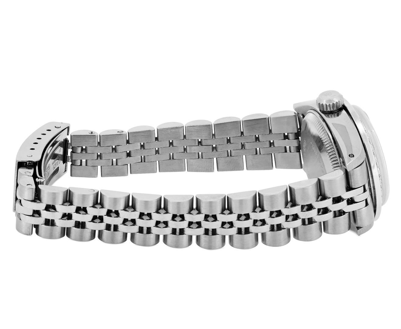 One Rolex Ladies Pre Owned Stainless Steel Date Wristwatch Polished Bright with Satin Finish, Serviced & Electronically Tested, Stainless Steel Case: 26mm, Stainless Steel Crown, Custom Bezel: New 18K White Gold Beadset Diamond Bezel, Diamond Count: 32 Diamonds. Custom Crystal: New Sapphire With Magnified Date Window. Custom Hands: New Luminescent Hands. Rolex Movement: Automatic Winding Movement. Rolex Dial: Factory Silver With Index Hour Markers And Lumi Dots. Date Window: 3 O'clock Position Date Display, Model: Date. Condition: G-6 Extra Fine. Rolex Bracelet: Stainless Steel Jubilee Band. Bright Polish And Satin Finish. 6.0 Inch Length, Adjustable. Standard Clasp, With Rolex Logo. This Watch Has Been Serviced And Time Tested. It Is In Excellent Condition, Free Of All Scratches And Dents.
