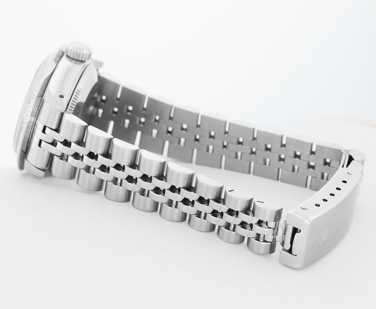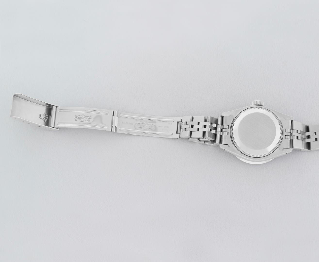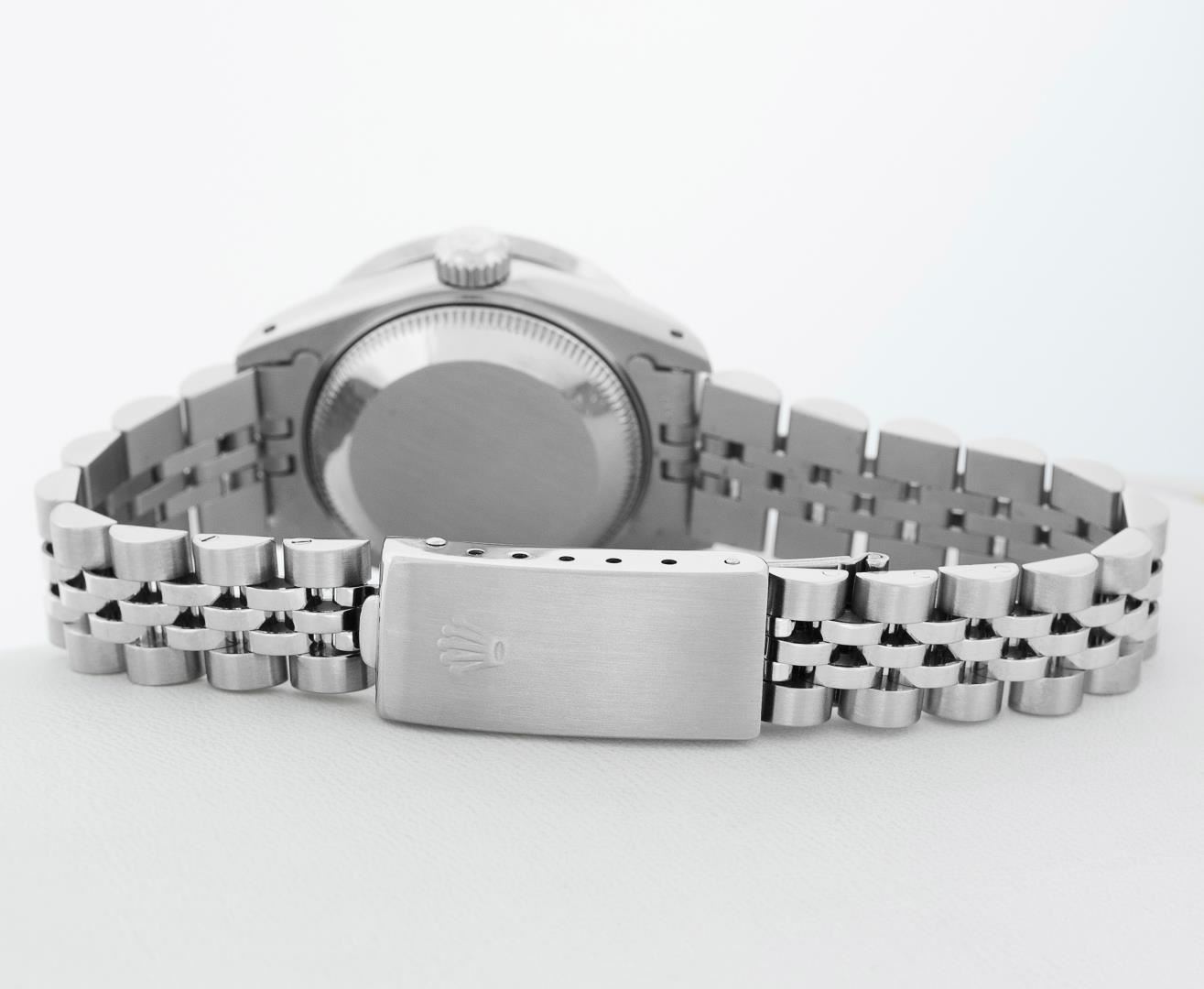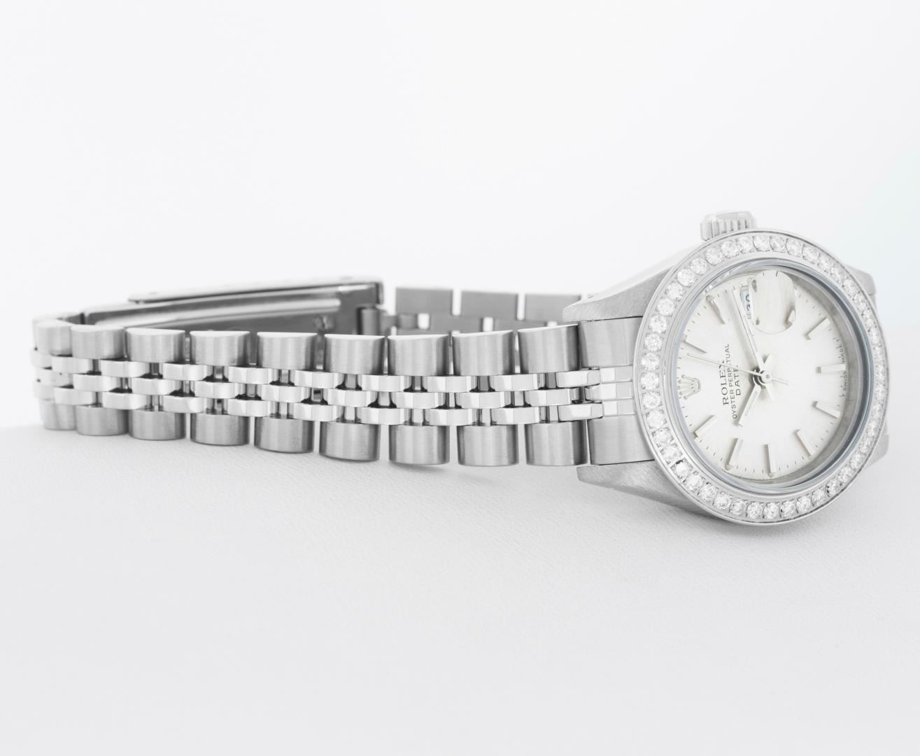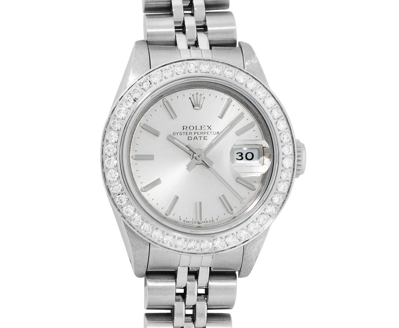 One Ladies Pre Owned Stainless Steel Rolex Polished Bright with Satin Finish, Serviced & Electronically Tested, Stainless Steel Case: 26mm, Stainless Steel Crown, Custom Bezel: New Stainless Steel Beadset Diamond Bezel, Diamond Count: 40 Diamonds On Bezel, Color: G To H, Clarity: SI-VS. Custom Crystal: New Acrylic With Magnified Date Window. Custom Hands: New Luminescent Hands. Rolex Movement: Automatic Winding Movement. Rolex Dial: Silver Index With Dash Track. Date Window: 3 O'Clock Position Date Display, Model: Date. Condition: G-6 Extra Fine. Rolex Bracelet: Stainless Steel Jubilee Band. Bright Polish & Satin Finish. 6.0 Inch Length, Adjustable. Standard Clasp, With Rolex Logo. This Watch Has Been Serviced Time Tested And Is In Excellent Condition It Is Free Of All Scratches And Dents.