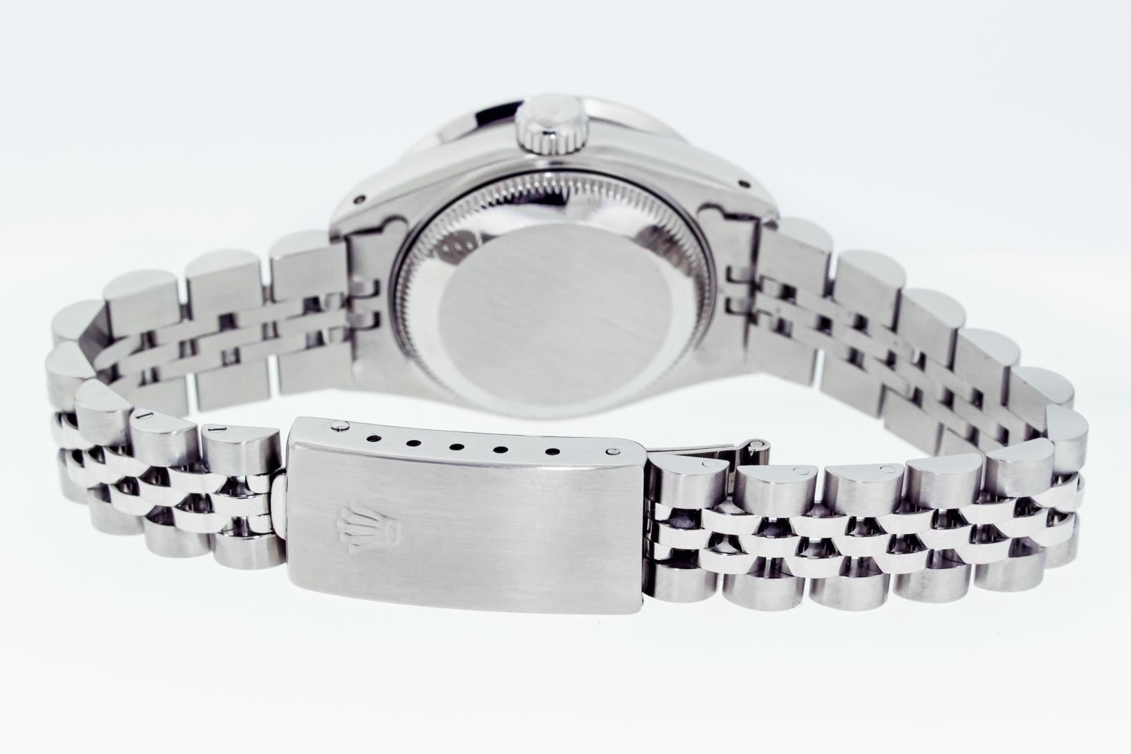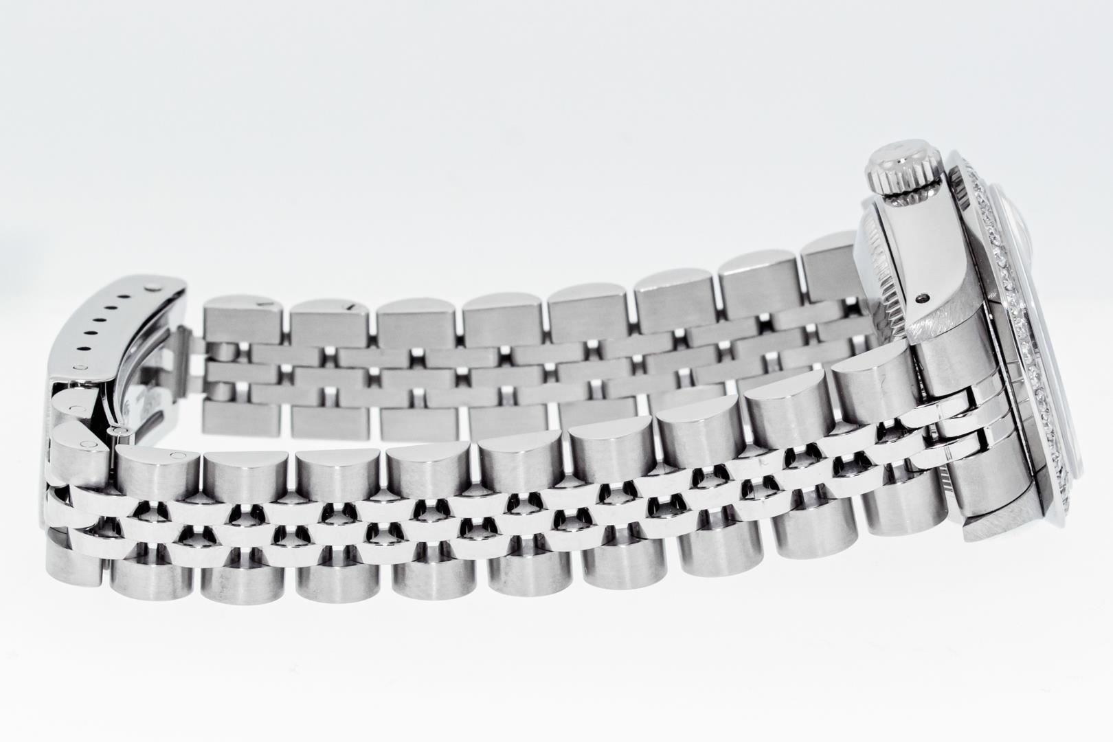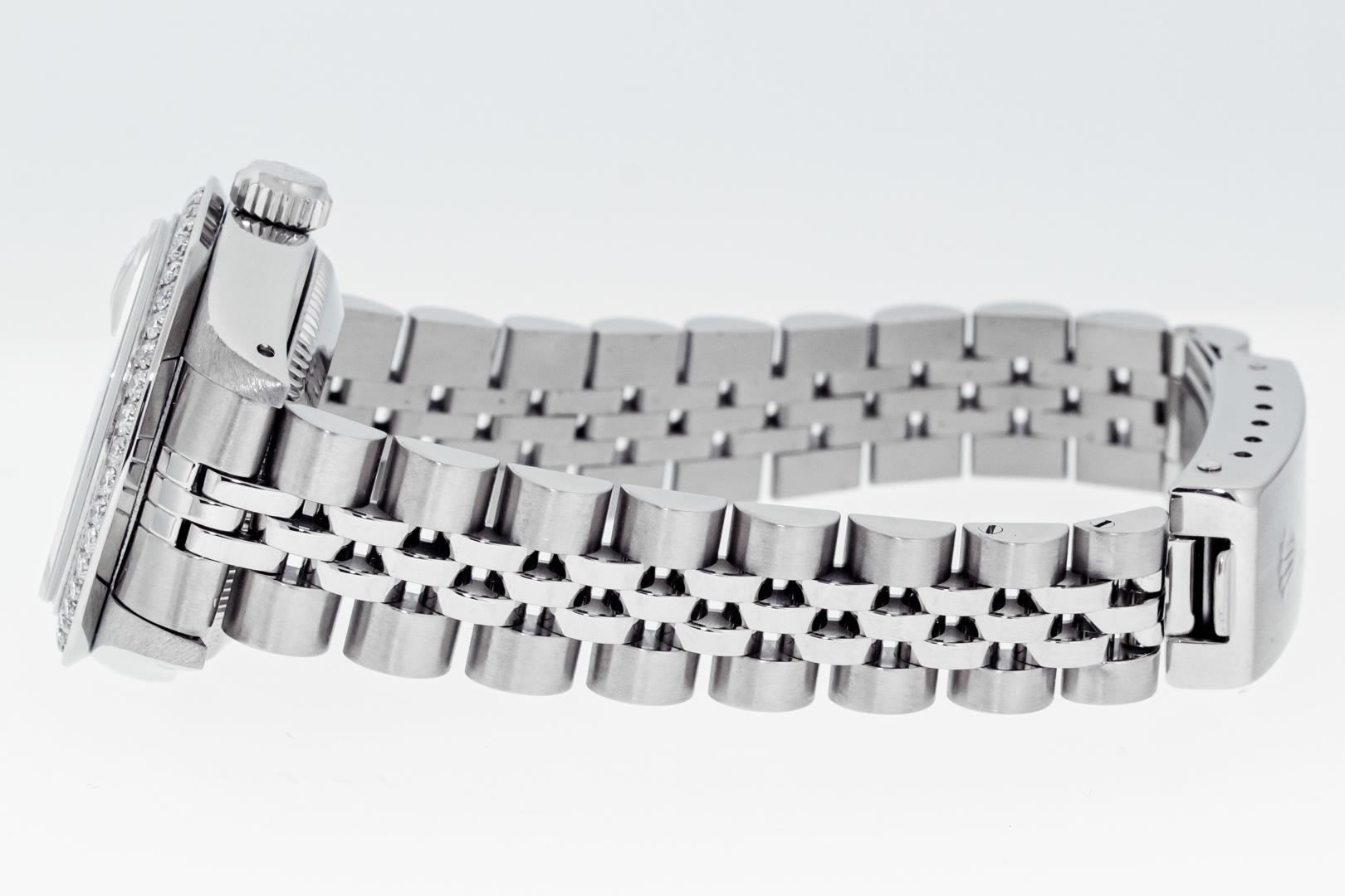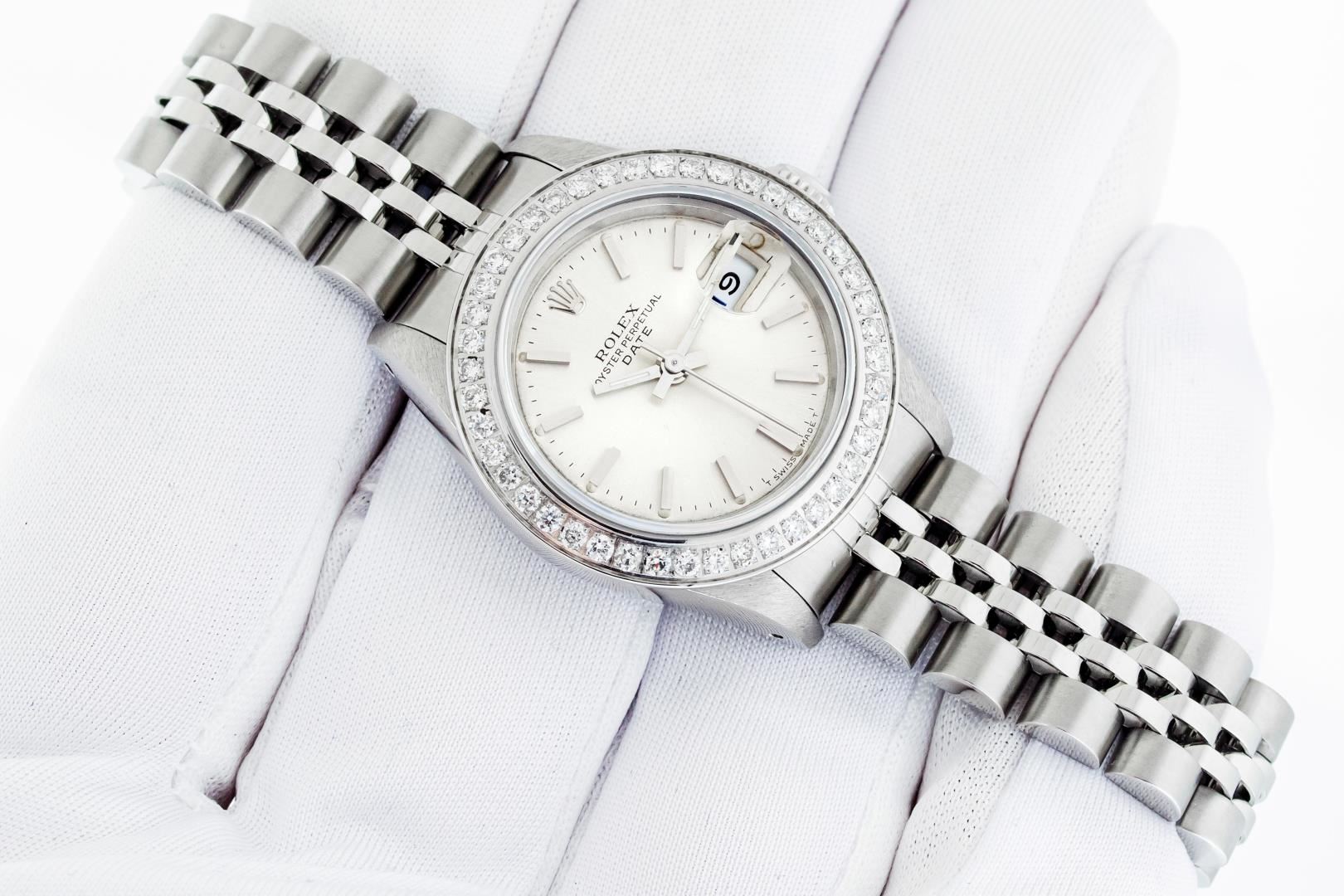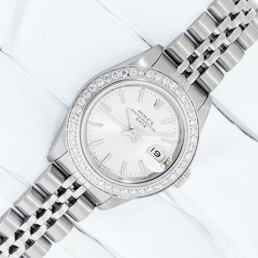 One Ladies Pre Owned Stainless Steel Rolex Datejust Polished Bright with Satin Finish, Serviced & Electronically Tested, Stainless Steel Case: 26mm, Stainless Steel Crown, Custom Bezel: New 18K Stainless Steel Beadset Diamond Bezel, Diamond Count: 40 Diamonds, Total Weight .70 Carat, Clarity: SI-VS, Color: G to H. Custom Crystal: New Sapphire With Magnified Date Window. Custom Hands: New Luminescent Hands. Rolex Movement: Automatic Winding Movement. Rolex Dial: Factory Silver Dial With Index Hour Markers And Lumi Dots. Date Window: 3 O'Clock Position Date Display, Model: Datejust. Condition: G-6 Extra Fine. Rolex Bracelet: Stainless Steel Jubilee Band. Bright Polish & Satin Finish. 6.0 Inch Length, Adjustable. Standard Clasp, With Rolex Logo. This Watch Has Been Serviced Time Tested And Is In Excellent Condition It Is Free Of All Scratches And Dents.