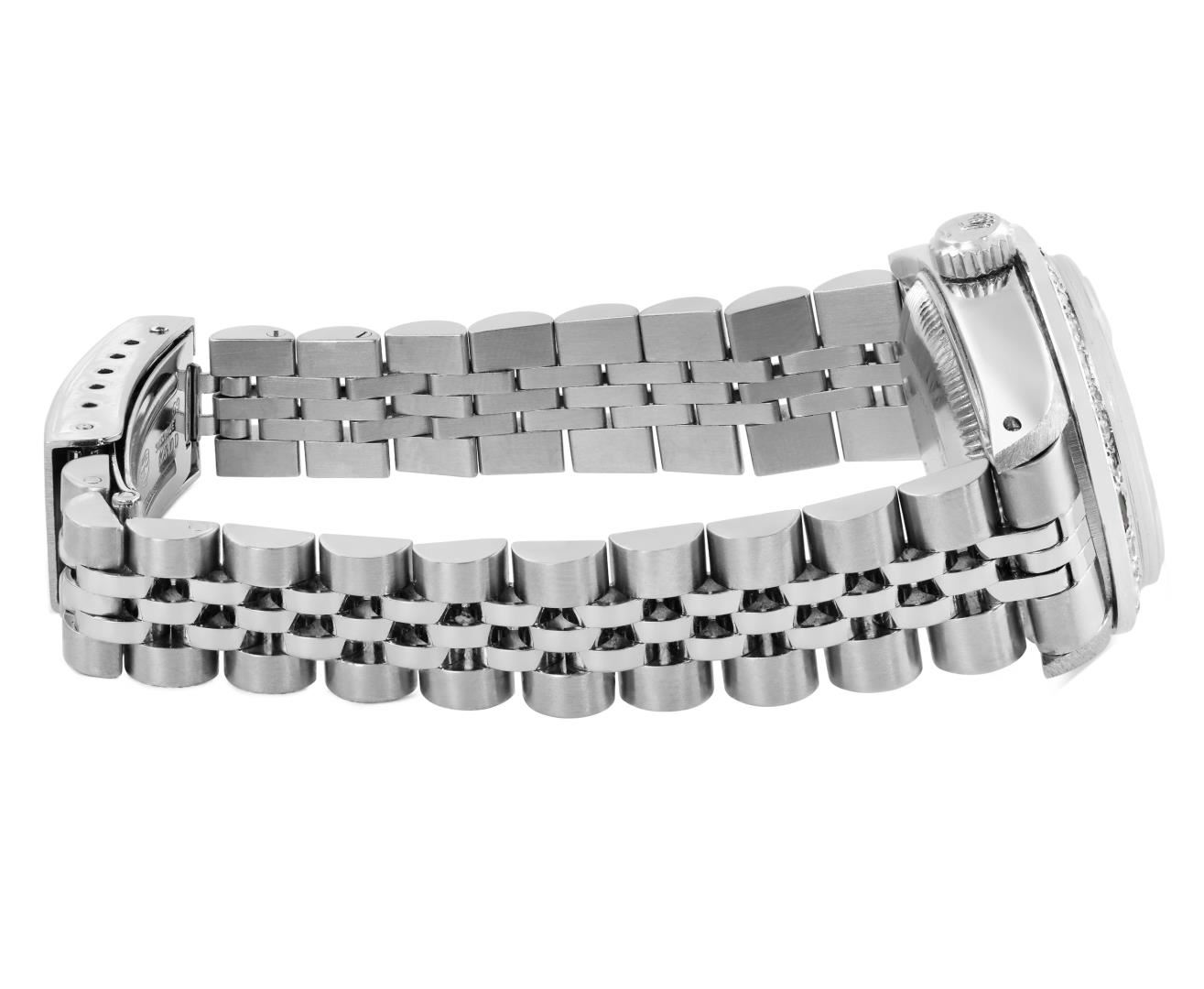 One Rolex Ladies Pre Owned Stainless Steel Date Wristwatch Polished Bright with Satin Finish, Serviced And Electronically Tested, Stainless Steel Case: 26mm, Stainless Steel Crown, Custom Bezel: New 18K White Gold Emerald Beadset Diamond Bezel, Diamond + Gem Count: 36 Diamonds + 4 Emeralds. Custom Crystal: New Sapphire With Magnified Date Window. Custom Hands: New Luminescent Hands. Rolex Movement: Automatic Winding Movement 2035. Rolex Dial: Factory Silver With Index Hour Markers, Lumi Dots, and Dash Tracks. Date Window: 3 O'Clock Position Date Display, Model: Date. Condition: G-6 Extra Fine. Rolex Bracelet: Stainless Steel Jubilee Band. Bright Polish & Satin Finish. 6.0 Inch Length, Adjustable. Standard Clasp, With Rolex Logo. This Watch Has Been Serviced Time Tested And Is In Excellent Condition. It Is Free Of All Scratches And Dents.