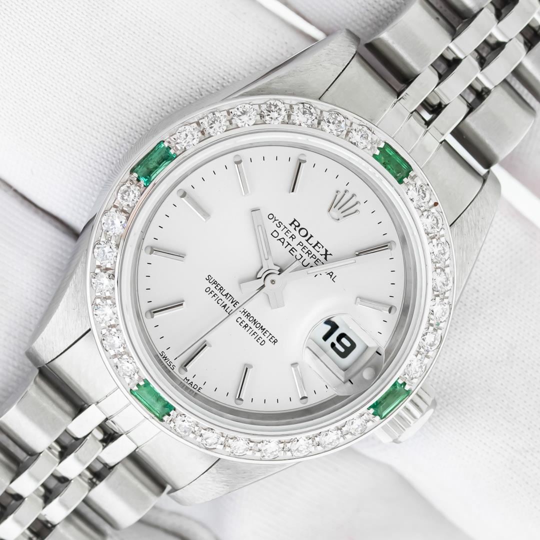 One Ladies Pre Owned Quickset Stainless Steel Rolex Datejust Polished Bright with Satin Finish, Serviced & Electronically Tested, Stainless Steel Case: 26mm, Rolex Stainless Steel Crown, Custom Bezel: New 18K White Gold Emerald Bead Set Diamond Bezel, Diamond + Gem Count: 28 Diamonds + 4 Emeralds, Clarity: SI-VS, Color: G to H. Custom Crystal: New Sapphire With Magnified Date Window. Custom Hands: New Luminescent Hands. Rolex Movement: Automatic Winding Movement 2235. Rolex Dial: Silver With Index Hour Markers With Dash Track & Lumi Dot. Date Window: 3 O'Clock Position Date Display, Model: Quickset Datejust. Condition: G-6 Extra Fine. Rolex Bracelet: Stainless Steel Jubilee Band. Bright Polish & Satin Finish. 6.0 Inch Length, Adjustable. Standard Clasp, With Rolex Logo. This Watch Has Been Serviced Time Tested And Is In Excellent Condition It Is Free Of All Scratches And Dents.