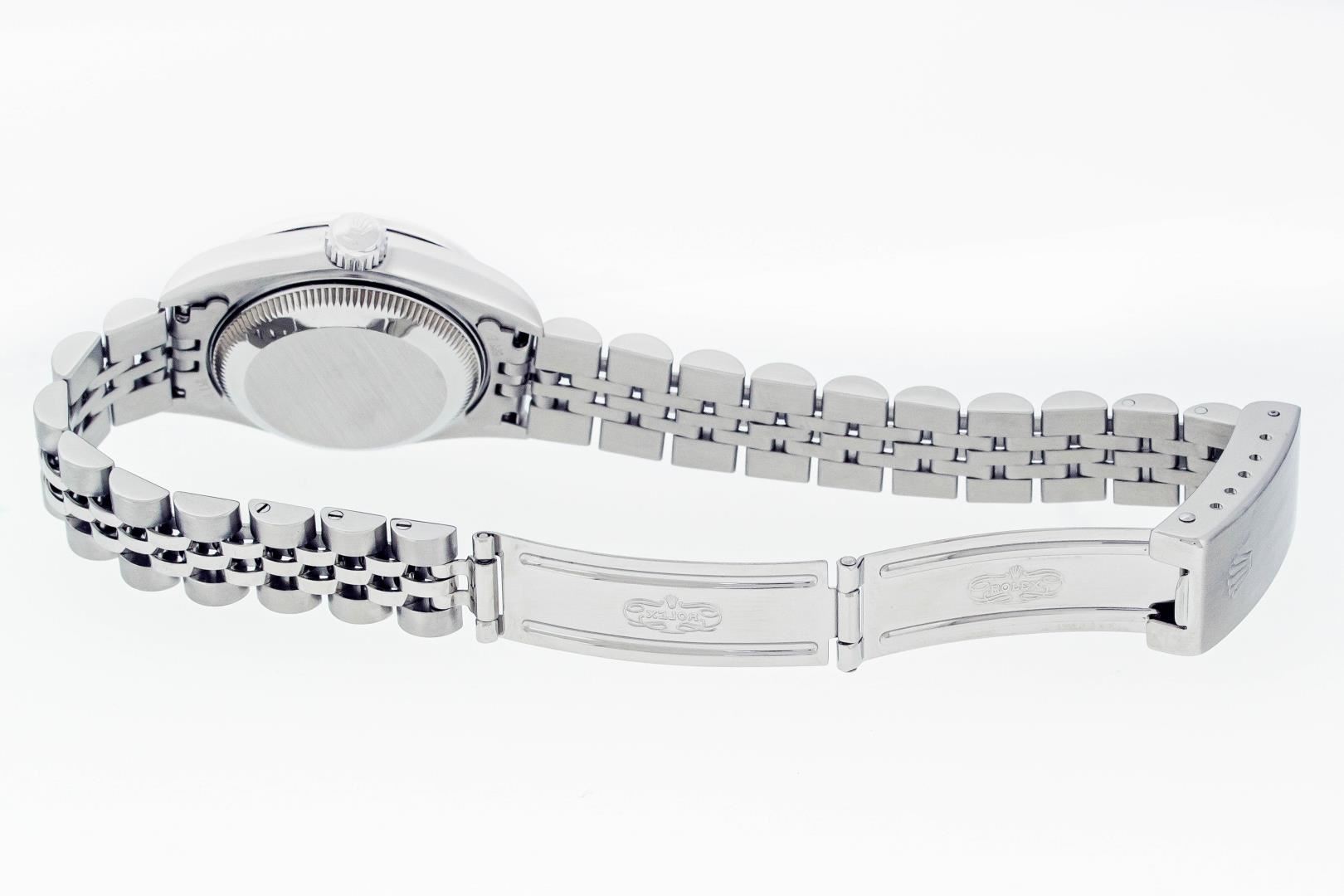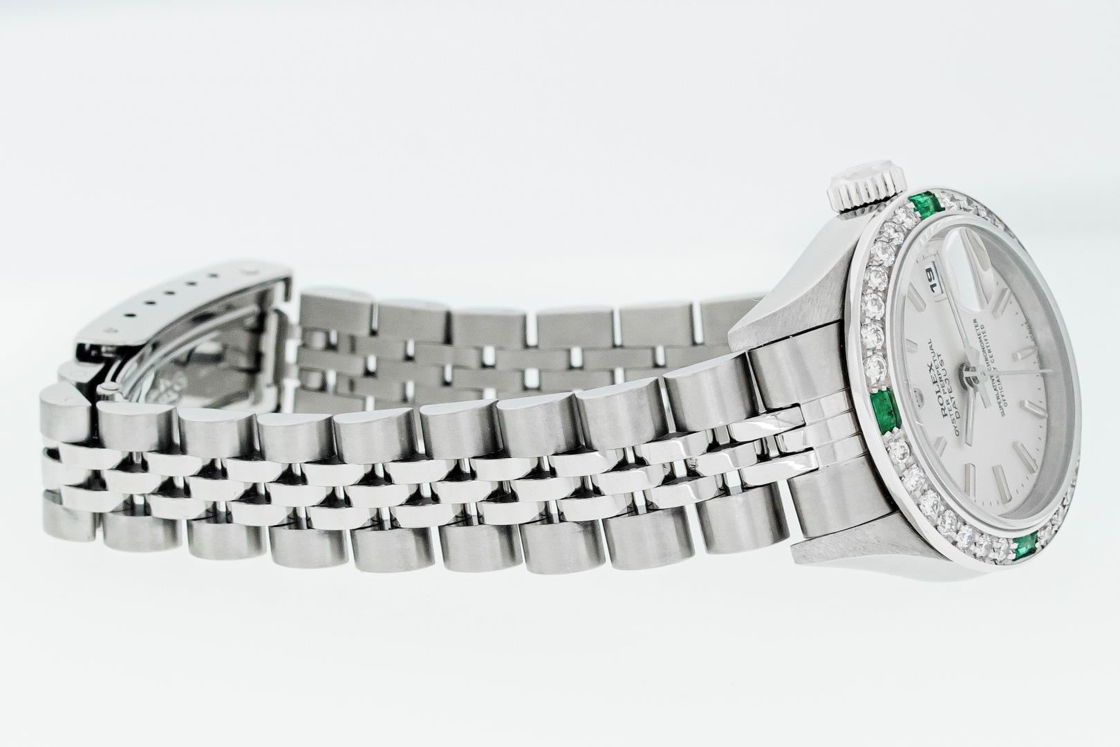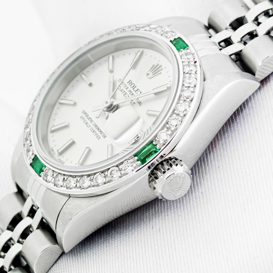 One Ladies Pre Owned Quickset Stainless Steel Rolex Datejust Polished Bright with Satin Finish, Serviced & Electronically Tested, Stainless Steel Case: 26mm, Rolex Stainless Steel Crown, Custom Bezel: New 18K White Gold Emerald Bead Set Diamond Bezel, Diamond + Gem Count: 28 Diamonds + 4 Emeralds, Clarity: SI-VS, Color: G to H. Custom Crystal: New Sapphire With Magnified Date Window. Custom Hands: New Luminescent Hands. Rolex Movement: Automatic Winding Movement 2235. Rolex Dial: Silver With Index Hour Markers With Dash Track & Lumi Dot. Date Window: 3 O'Clock Position Date Display, Model: Quickset Datejust. Condition: G-6 Extra Fine. Rolex Bracelet: Stainless Steel Jubilee Band. Bright Polish & Satin Finish. 6.0 Inch Length, Adjustable. Standard Clasp, With Rolex Logo. This Watch Has Been Serviced Time Tested And Is In Excellent Condition It Is Free Of All Scratches And Dents.