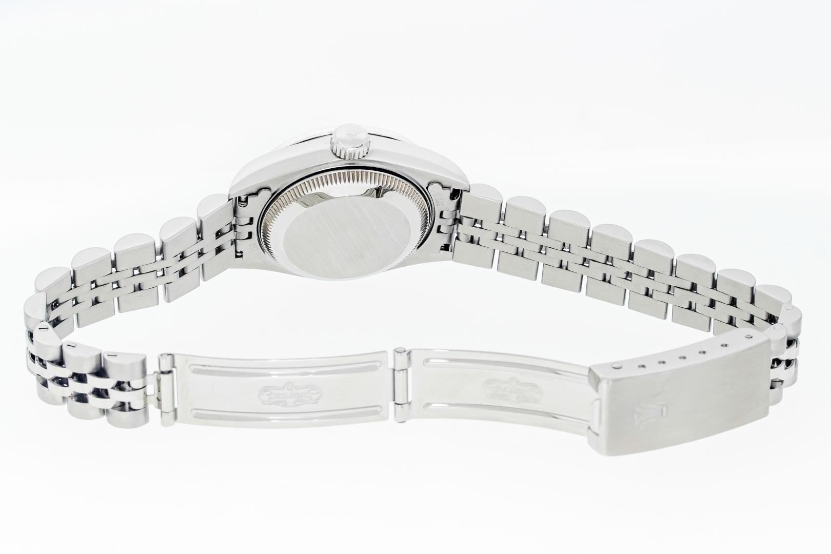 One Ladies Pre Owned Quickset Stainless Steel Rolex Datejust Polished Bright with Satin Finish, Serviced & Electronically Tested, Stainless Steel Case: 26mm, Rolex Stainless Steel Crown, Custom Bezel: New 18K White Gold Emerald Bead Set Diamond Bezel, Diamond + Gem Count: 28 Diamonds + 4 Emeralds, Clarity: SI-VS, Color: G to H. Custom Crystal: New Sapphire With Magnified Date Window. Custom Hands: New Luminescent Hands. Rolex Movement: Automatic Winding Movement 2235. Rolex Dial: Silver With Index Hour Markers With Dash Track & Lumi Dot. Date Window: 3 O'Clock Position Date Display, Model: Quickset Datejust. Condition: G-6 Extra Fine. Rolex Bracelet: Stainless Steel Jubilee Band. Bright Polish & Satin Finish. 6.0 Inch Length, Adjustable. Standard Clasp, With Rolex Logo. This Watch Has Been Serviced Time Tested And Is In Excellent Condition It Is Free Of All Scratches And Dents.