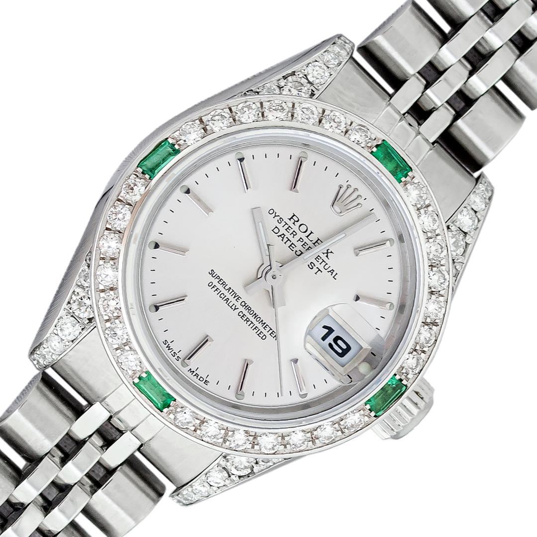 One Ladies Pre Owned Quickset Stainless Steel Rolex Datejust Polished Bright with Satin Finish, Serviced & Electronically Tested, Stainless Steel Case: 26mm, Custom Diamond Lugs: Added Diamonds On Lugs, Diamond Count: 24 Diamonds On Bezel, Color: G To H, Clartity: SI-VS. Rolex Stainless Steel Crown, Custom Bezel: New 18K White Gold Emerald Bead Set Diamond Bezel, Diamond + Gem Count: 28 Diamonds + 4 Emeralds, Clarity: SI-VS, Color: G to H. Custom Crystal: New Sapphire With Magnified Date Window. Custom Hands: New Luminescent Hands. Rolex Movement: Automatic Winding Movement 2235. Rolex Dial: Silver With Index Hour Markers With Dash Track & Lumi Dot. Date Window: 3 O'Clock Position Date Display, Model: Quickset Datejust. Condition: G-6 Extra Fine. Rolex Bracelet: Stainless Steel Jubilee Band. Bright Polish & Satin Finish. 6.0 Inch Length, Adjustable. Standard Clasp, With Rolex Logo. This Watch Has Been Serviced Time Tested And Is In Excellent Condition It Is Free Of All Scratches And Dents.