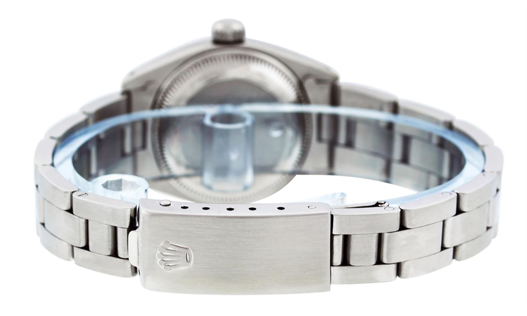 One Ladies Rolex Datejust Polished Bright with Satin Finish, Serviced & Electronically Tested, Stainless Steel Case:26mm, Stainless Steel Crown, Bezel: 14K White Gold Fluted Bezel. Custom Crystal: Acrylic Cyclops Lens. Movement: Automatic Winding Movement Caliber 2030. Dial: Silver Index Dial With Lumi Dot and Dash Track. Date Window: 3 O'Clock Position Date Display, Model: Datejust. Condition: G-6 Extra Fine. Bracelet: Stainless Steel Oyster Band. Bright Polish & Satin Finish. 6.0 Inch Length, Adjustable. Standard Clasp, With Rolex Logo. This watch has been serviced and polished and its free of all dents and scratches and has been time tested.