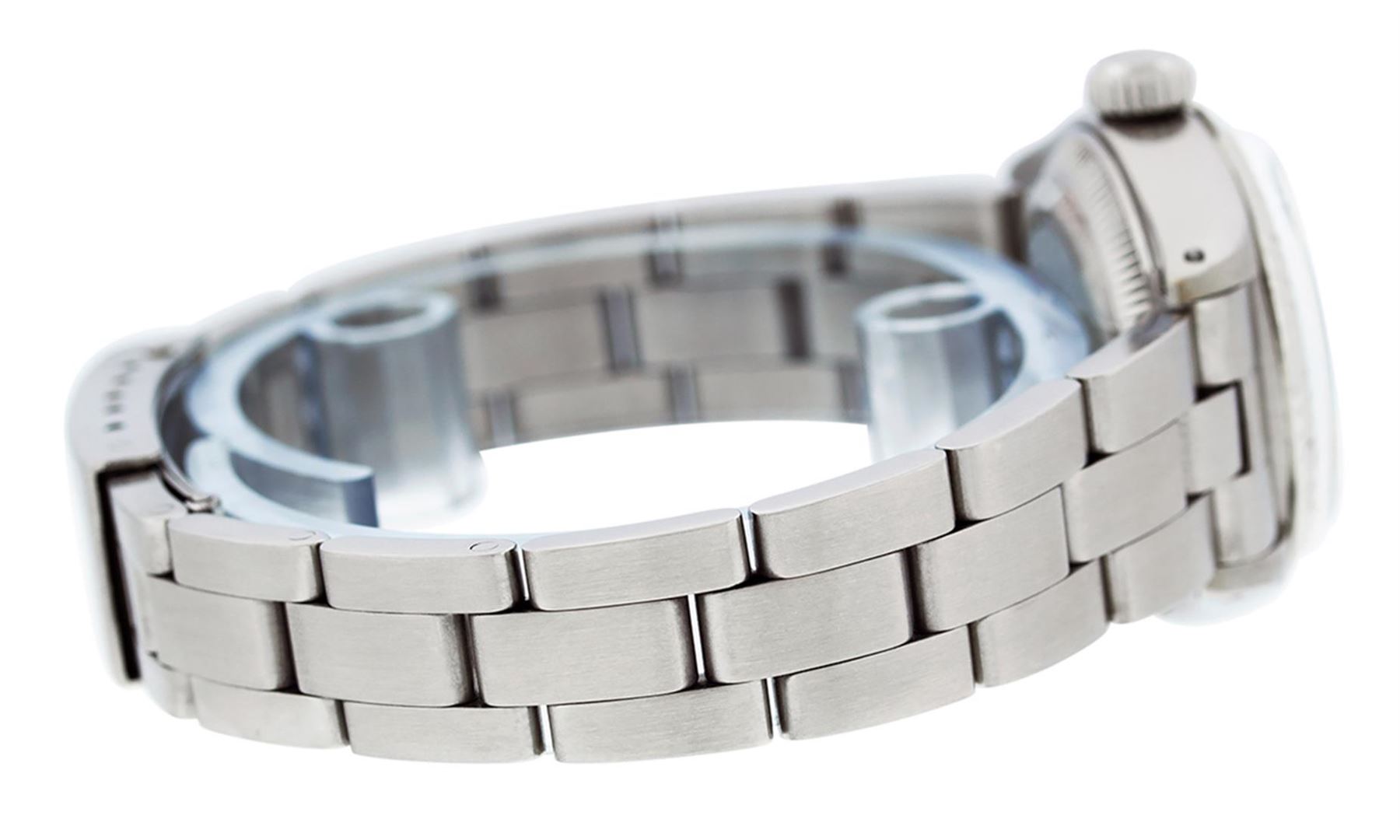 One Ladies Rolex Datejust Polished Bright with Satin Finish, Serviced & Electronically Tested, Stainless Steel Case:26mm, Stainless Steel Crown, Bezel: 14K White Gold Fluted Bezel. Custom Crystal: Acrylic Cyclops Lens. Movement: Automatic Winding Movement Caliber 2030. Dial: Silver Index Dial With Lumi Dot and Dash Track. Date Window: 3 O'Clock Position Date Display, Model: Datejust. Condition: G-6 Extra Fine. Bracelet: Stainless Steel Oyster Band. Bright Polish & Satin Finish. 6.0 Inch Length, Adjustable. Standard Clasp, With Rolex Logo. This watch has been serviced and polished and its free of all dents and scratches and has been time tested.