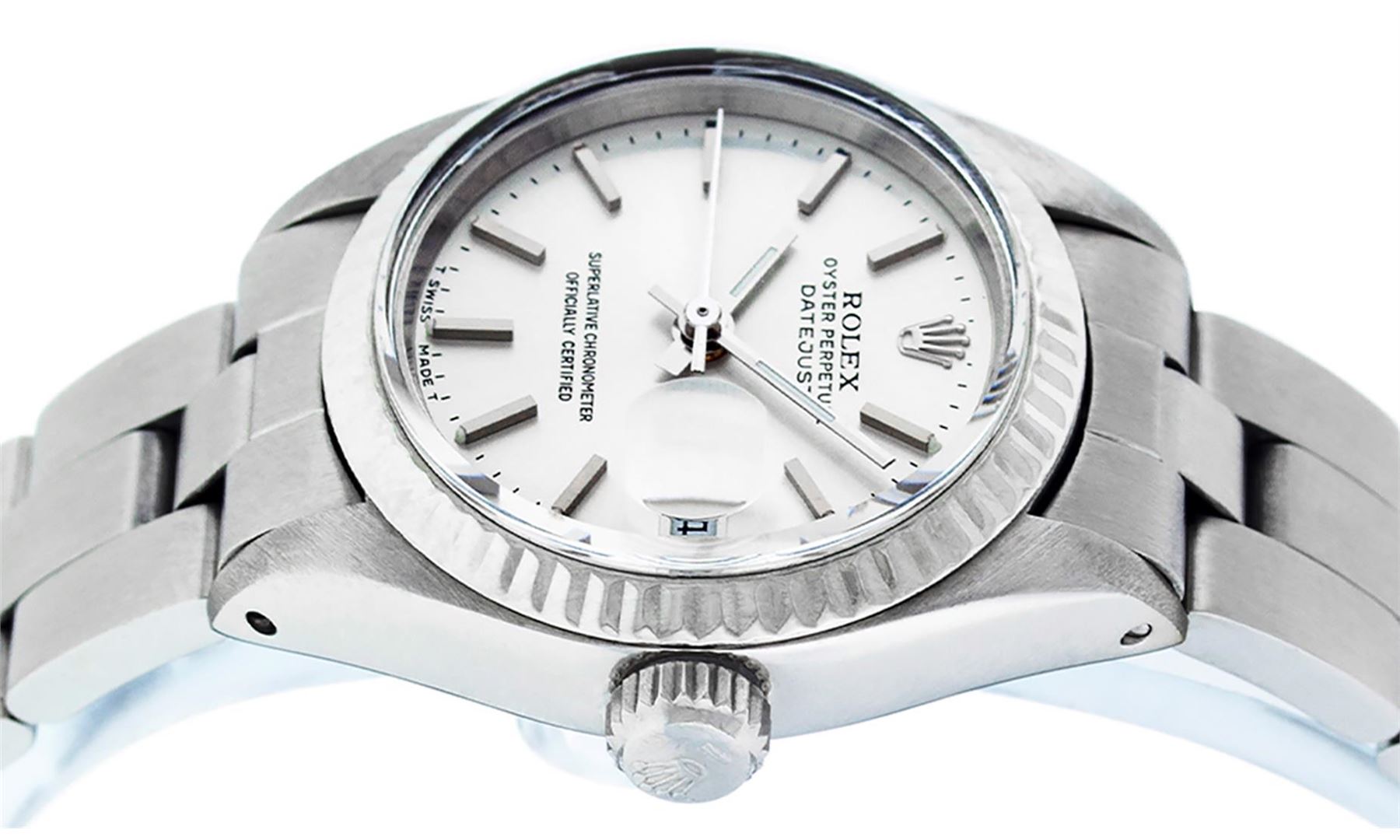 One Ladies Stainless Steel Rolex Datejust Polished Bright with Satin Finish, Serviced & Electronically Tested, Stainless Steel Case: 26mm, Stainless Steel Crown, Bezel: 14K White Gold Fluted Bezel. Custom Crystal: New Acrylic Cyclops Lens. Custom Hands: New Luminescent Hands. Movement: Automatic Winding Movement Caliber 2030. Dial: Silver Index Dial. Date Window: 3 O'clock Position Date Display, Model: Datejust. Condition: G-6 Extra Fine. Bracelet: Stainless Steel Oyster Band. Bright Polish & Satin Finish. 6.0 Inch Length, Adjustable. Standard Clasp, With Rolex Logo. This Watch Has Been Serviced Time Tested And Is In Excellent Condition It Is Free Of All Scratches And Dents.